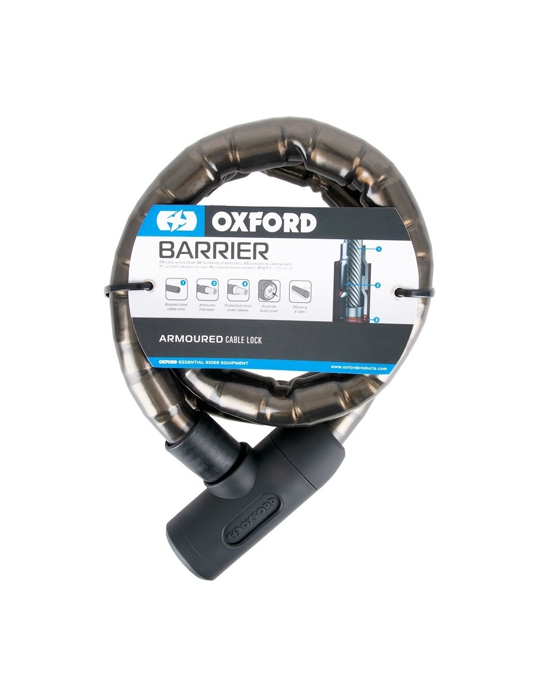 The Motorcycle Lock Oxford Barrier 1.4 m is a sturdy, reinforced steel lock which will prevent your motorcycle from getting stolen. 25mm in diameter, the steel cable makes the lock sturdy. The core of the lock is protected by steel rings with an oil film and a vinyl coating, which not only makes it easier to handle the lock, but also protects the motorcycle’s paintjob.