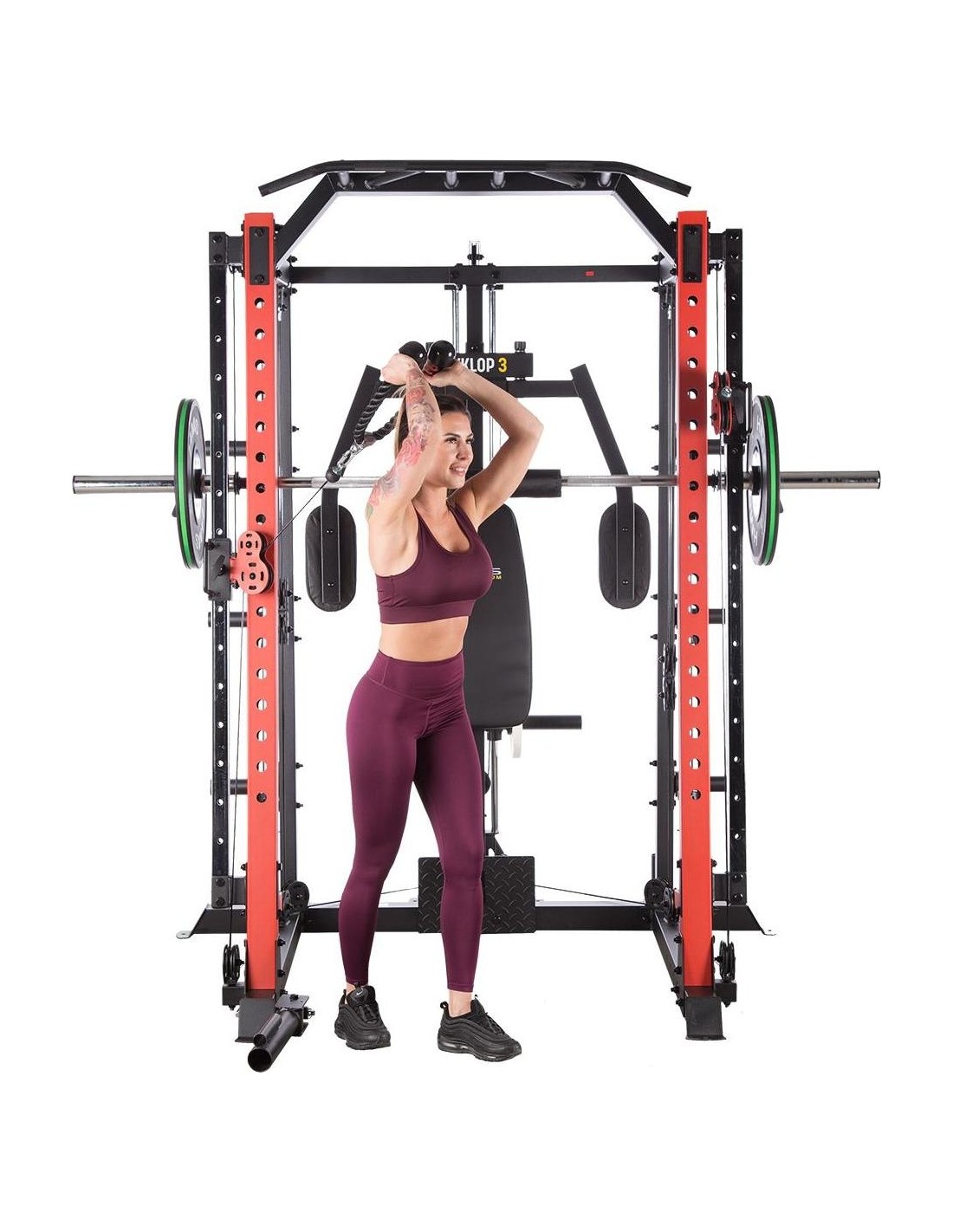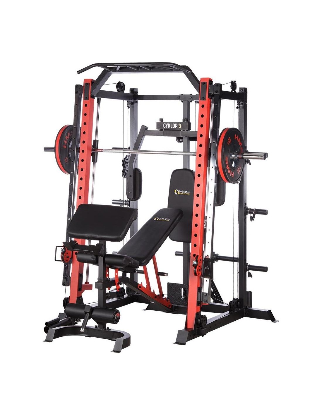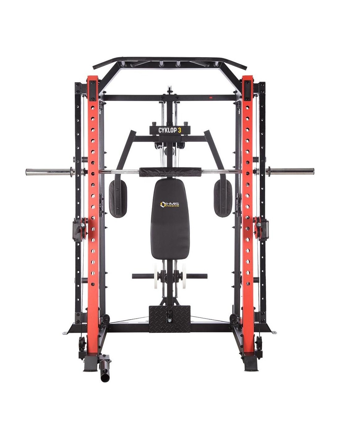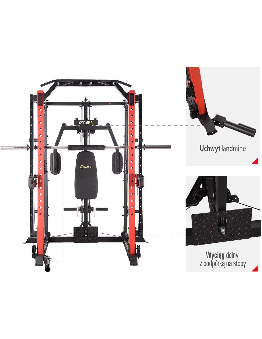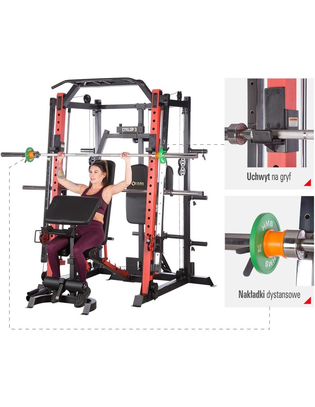 CYKLOP3 HMS, to suwnica klasy Semi Commercial, oznacza to, że idealnie sprawdzi się w małych klubach fitness, ale również do użytku domowego. Materiał najwyższej jakości CYKLOP3, to solidne urządzenie gwarantujące bezpieczny trening. Wytrzymałe grube profile, ze stali najlepszej jakości, zapewniają idealną stabilność sprzętu. Dopracowana pod każdym względem konstrukcja, pozwala łatwo i intuicyjnie korzystać ze sprzętu. Kompleksowy trening CYKLOP3, to nie tylko suwnica. To połączenie suwnicy, drążka do podciągania, butterflya, stojaka na sztangę oraz dwóch wyciągów z regulowaną wysokością. W zestawie z CYKLOPEM3 znajduje się również ławka, wyposażona w możliwość regulacji kąta nachylenia oparcia i siedziska oraz modlitewnik z uchwytem na sztangę. Zbierając wszystkie elementy w całość, otrzymujemy wszechstronny sprzęt, umożliwiający wykonanie ćwiczeń na wszystkie grupy mięśniowe. Efektywność treningu oraz jego możliwości zwiększą się za sprawą dołączonych do zestawu akcesoriów w postaci uchwytów do wyciągu, montowanych poręczy do dipów czy uchwytu landmine na sztangę. Komfort i wygoda Dobry trening to nie tylko solidny ale i wygodny sprzęt. CYKLOP3 posiada wiele udogodnień dla ćwiczącego, między innymi: ławka z regulacjami ustawień, szybka i prosta regulacja wysokości wyciągów czy łatwa blokada gryfu suwnicy. Do gryfu suwnicy została dołączona specjalna gąbka, która zabezpiecza ćwiczącego np. przy wykonywaniu przysiadów. Rękojeści drążka do podciągania są radełkowane dla zwiększenia przyczepności uchwytu. Miękkie oparcie ławki oraz butterflya, pozwoli na długi trening bez uczucia dyskomfortu. Do przechowywania talerzy obciążeniowych, użytkownik ma do dyspozycji funkcjonalnie usytuowane stojaki, a dla bezpieczeństwa do każdego stojaka przewidziany jest sprężynowy zacisk. CYKLOP3 HMS, to suwnica, która sprawdzi się w każdej domowej siłowni i w każdym małym klubie. Z pewnością spełni oczekiwania, wszystkich użytkowników. Specyfikacja: Wymiary produktu: długość: 173 cm szerokość: 159 cm, z gryfem 212 cm wysokość: 219 cm Gryf: długość: 212 cm średnica: 32 mm waga: 17,2 kg Ławka: Długość: 158 cm Szerokość: 66 cm Wysokość: 56,5 - 137 cm Regulacja nachylenia oparcia: 6 poziomów Regulacja nachylenia siedziska: 3 poziomy Regulacja wysokości modlitewnika: 5 poziomów, co 2,5 cm Oparcie: 86 x 30 x 5,5 cm Siedzisko: 43 x 43,5 x 5,5 cm Modlitewnik: 52 x 34,5 x 5,5 cm Butterfly: Oparcie: 67,5 x 31 x 5,5 cm Rozstaw ramion: 85 cm Oparcia na ramionach: 31 x 15 cm Drążek do podciągania: Rozstaw rękojeści: 93 / 67 / 40 / 12,5 Średnica rękojeści: 28 mm Długość jednego rękawa do obciążenia wyciągu: 22,5 cm Długość stojaków na talerze obciążeniowe: 19 cm Regulacja wysokości wyciągów: 15 poziomów Łożyska we wszystkich krążkach Rodzaj obciążenia: talerze obciążeniowe (nie są dołączone do zestawu) Uchwyty do zawieszenia wolnych ciężarów o średnicy 50 i 25 mm Prowadnice gryfu z mechanizmem bezpieczeństwa Regulacja napięcia linek Asekuracja: 15 stopni Podpory na sztangę Możliwość treningu z ławką Maksymalne obciążenie wyciągu: 135 kg, po 67,5 kg na każdy rękaw Wytrzymałość linek wyciągu: 900 kg Maksymalna waga użytkownika: 150 kg Maksymalne obciążenie ławki: 270 kg Waga produktu: netto: 260,5 kg Przyrządy do ćwiczeń: Suwnica Smitha Dwa wyciągi z regulowaną wysokością Drążek do podciągania Butterfly Ławka Uwagi: Gwarancja 12 miesięcy w przypadku użytku komercyjnego Gwarancja 24 miesiące w przypadku użytku domowego