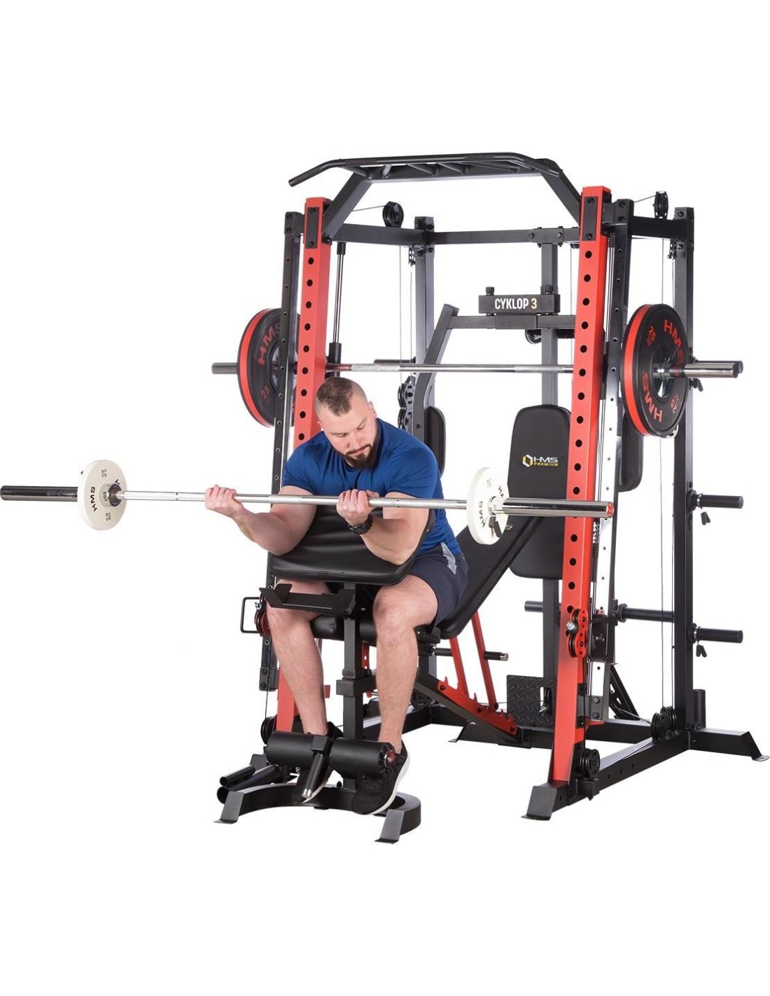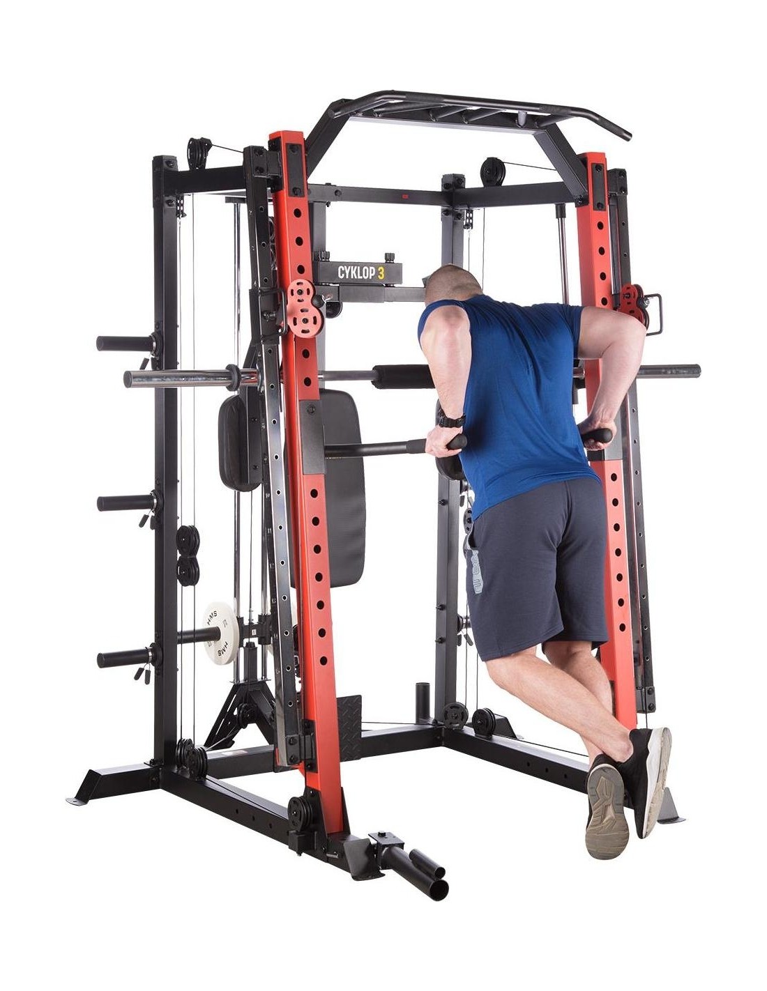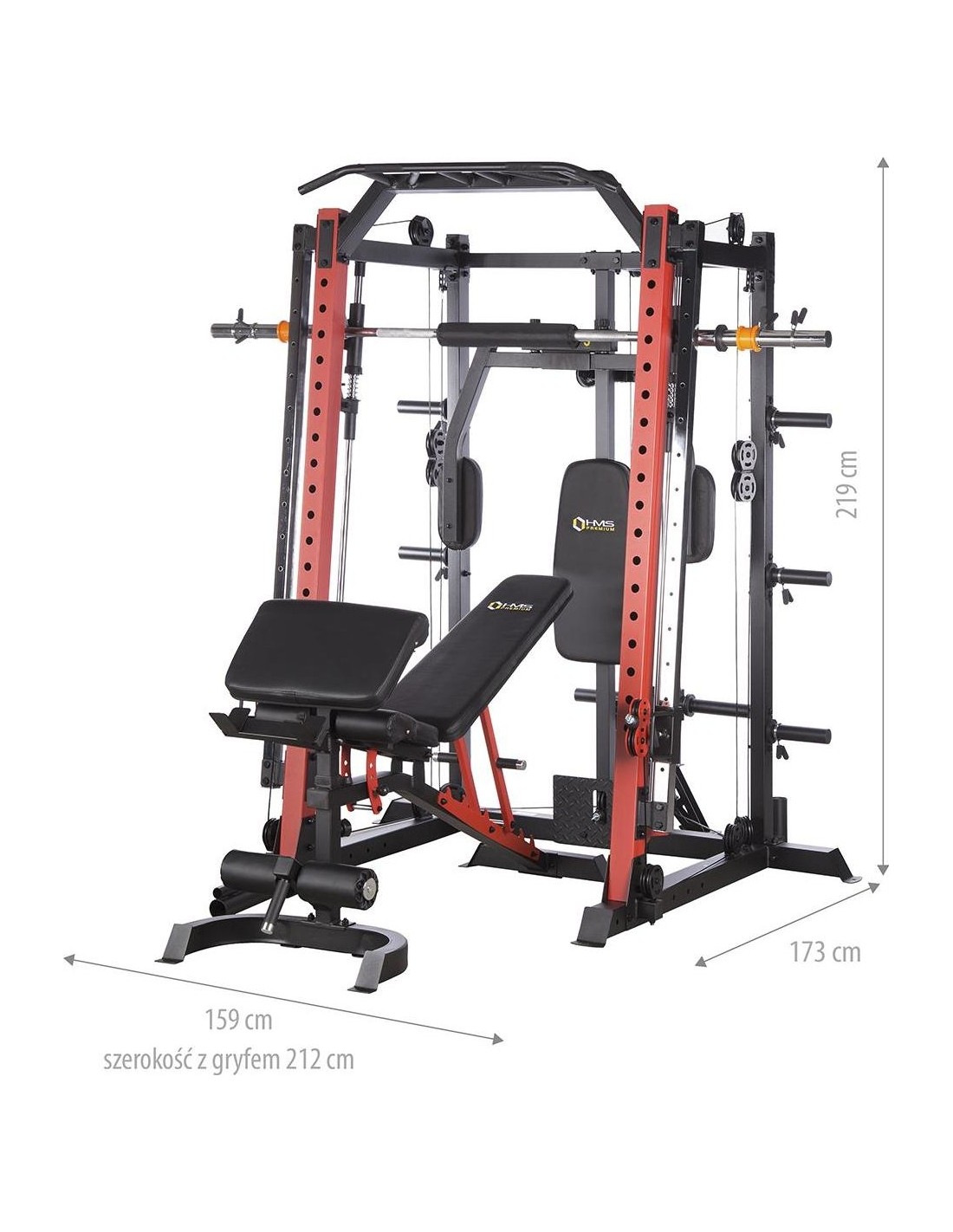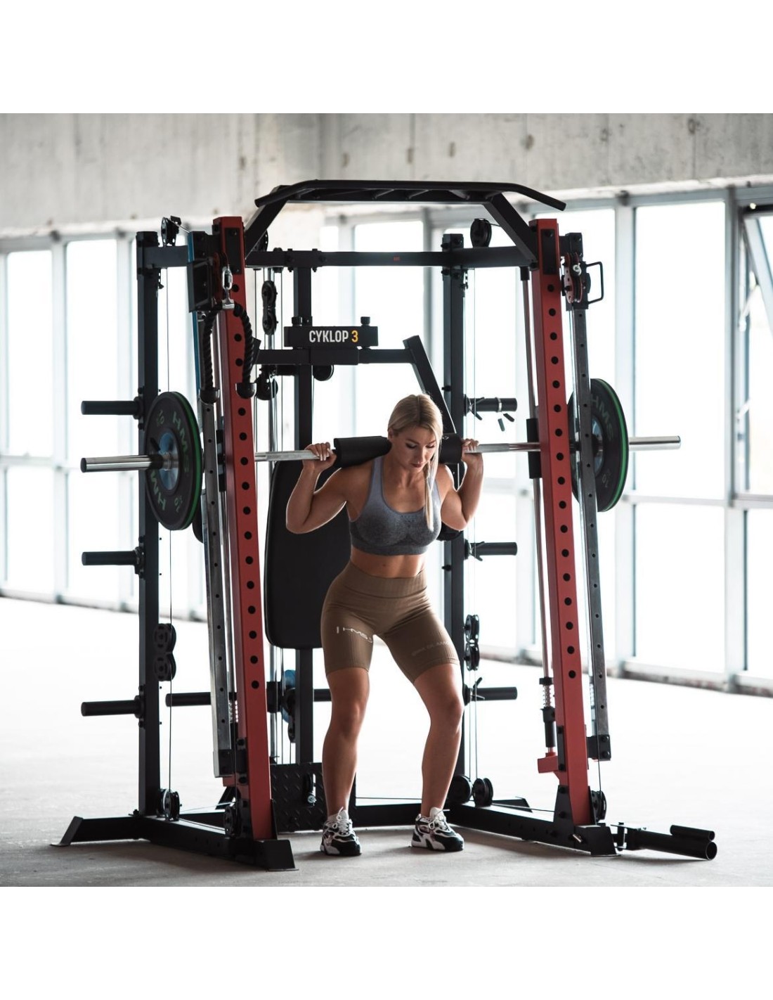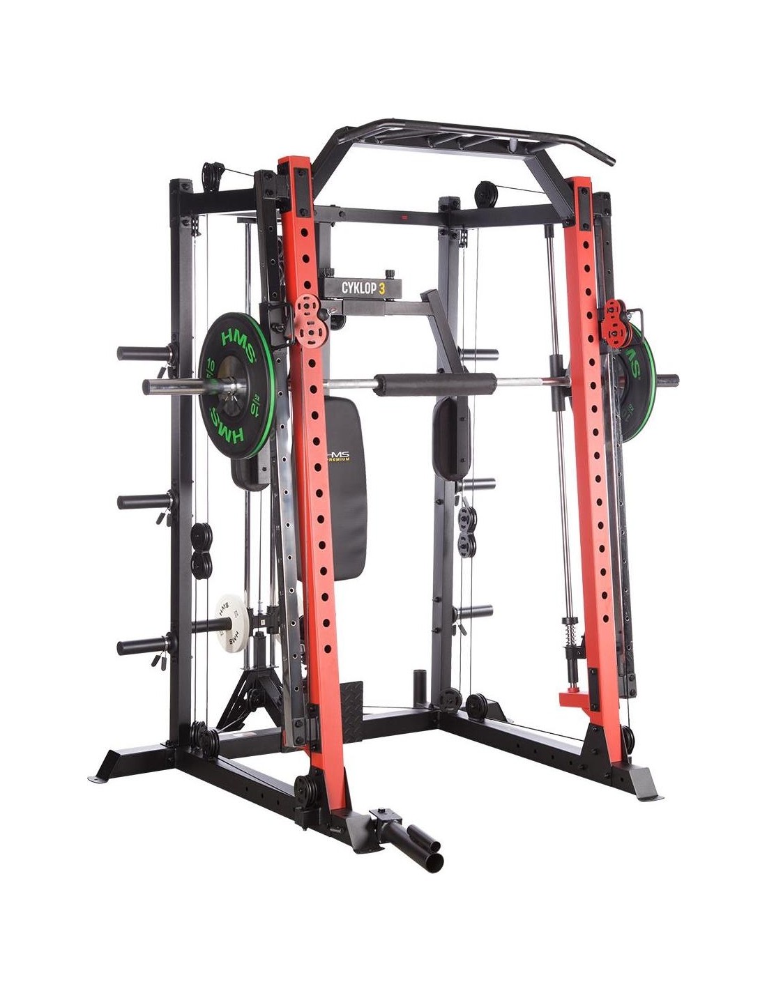 CYKLOP3 HMS, to suwnica klasy Semi Commercial, oznacza to, że idealnie sprawdzi się w małych klubach fitness, ale również do użytku domowego. Materiał najwyższej jakości CYKLOP3, to solidne urządzenie gwarantujące bezpieczny trening. Wytrzymałe grube profile, ze stali najlepszej jakości, zapewniają idealną stabilność sprzętu. Dopracowana pod każdym względem konstrukcja, pozwala łatwo i intuicyjnie korzystać ze sprzętu. Kompleksowy trening CYKLOP3, to nie tylko suwnica. To połączenie suwnicy, drążka do podciągania, butterflya, stojaka na sztangę oraz dwóch wyciągów z regulowaną wysokością. W zestawie z CYKLOPEM3 znajduje się również ławka, wyposażona w możliwość regulacji kąta nachylenia oparcia i siedziska oraz modlitewnik z uchwytem na sztangę. Zbierając wszystkie elementy w całość, otrzymujemy wszechstronny sprzęt, umożliwiający wykonanie ćwiczeń na wszystkie grupy mięśniowe. Efektywność treningu oraz jego możliwości zwiększą się za sprawą dołączonych do zestawu akcesoriów w postaci uchwytów do wyciągu, montowanych poręczy do dipów czy uchwytu landmine na sztangę. Komfort i wygoda Dobry trening to nie tylko solidny ale i wygodny sprzęt. CYKLOP3 posiada wiele udogodnień dla ćwiczącego, między innymi: ławka z regulacjami ustawień, szybka i prosta regulacja wysokości wyciągów czy łatwa blokada gryfu suwnicy. Do gryfu suwnicy została dołączona specjalna gąbka, która zabezpiecza ćwiczącego np. przy wykonywaniu przysiadów. Rękojeści drążka do podciągania są radełkowane dla zwiększenia przyczepności uchwytu. Miękkie oparcie ławki oraz butterflya, pozwoli na długi trening bez uczucia dyskomfortu. Do przechowywania talerzy obciążeniowych, użytkownik ma do dyspozycji funkcjonalnie usytuowane stojaki, a dla bezpieczeństwa do każdego stojaka przewidziany jest sprężynowy zacisk. CYKLOP3 HMS, to suwnica, która sprawdzi się w każdej domowej siłowni i w każdym małym klubie. Z pewnością spełni oczekiwania, wszystkich użytkowników. Specyfikacja: Wymiary produktu: długość: 173 cm szerokość: 159 cm, z gryfem 212 cm wysokość: 219 cm Gryf: długość: 212 cm średnica: 32 mm waga: 17,2 kg Ławka: Długość: 158 cm Szerokość: 66 cm Wysokość: 56,5 - 137 cm Regulacja nachylenia oparcia: 6 poziomów Regulacja nachylenia siedziska: 3 poziomy Regulacja wysokości modlitewnika: 5 poziomów, co 2,5 cm Oparcie: 86 x 30 x 5,5 cm Siedzisko: 43 x 43,5 x 5,5 cm Modlitewnik: 52 x 34,5 x 5,5 cm Butterfly: Oparcie: 67,5 x 31 x 5,5 cm Rozstaw ramion: 85 cm Oparcia na ramionach: 31 x 15 cm Drążek do podciągania: Rozstaw rękojeści: 93 / 67 / 40 / 12,5 Średnica rękojeści: 28 mm Długość jednego rękawa do obciążenia wyciągu: 22,5 cm Długość stojaków na talerze obciążeniowe: 19 cm Regulacja wysokości wyciągów: 15 poziomów Łożyska we wszystkich krążkach Rodzaj obciążenia: talerze obciążeniowe (nie są dołączone do zestawu) Uchwyty do zawieszenia wolnych ciężarów o średnicy 50 i 25 mm Prowadnice gryfu z mechanizmem bezpieczeństwa Regulacja napięcia linek Asekuracja: 15 stopni Podpory na sztangę Możliwość treningu z ławką Maksymalne obciążenie wyciągu: 135 kg, po 67,5 kg na każdy rękaw Wytrzymałość linek wyciągu: 900 kg Maksymalna waga użytkownika: 150 kg Maksymalne obciążenie ławki: 270 kg Waga produktu: netto: 260,5 kg Przyrządy do ćwiczeń: Suwnica Smitha Dwa wyciągi z regulowaną wysokością Drążek do podciągania Butterfly Ławka Uwagi: Gwarancja 12 miesięcy w przypadku użytku komercyjnego Gwarancja 24 miesiące w przypadku użytku domowego