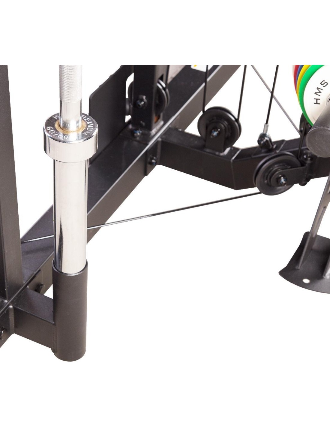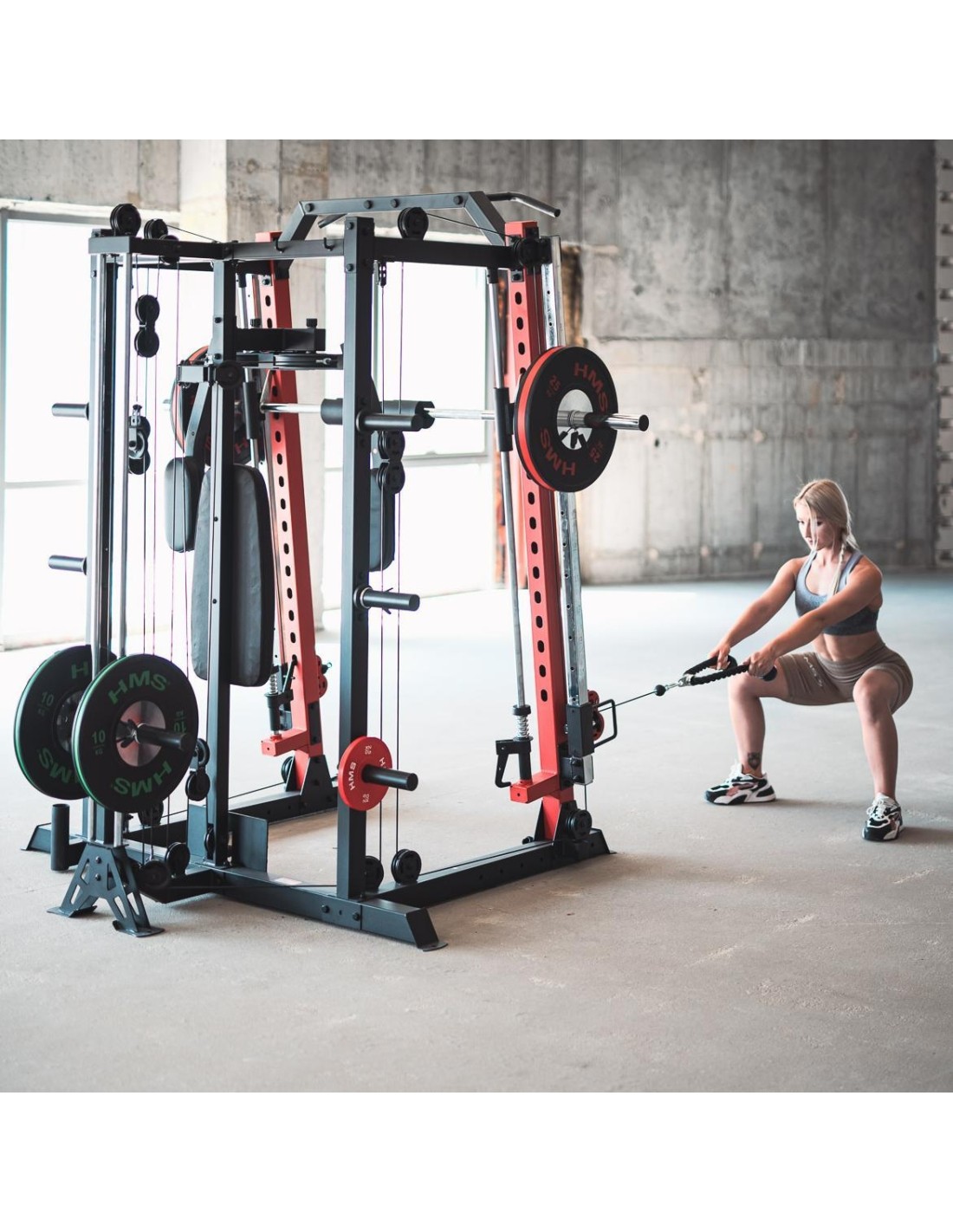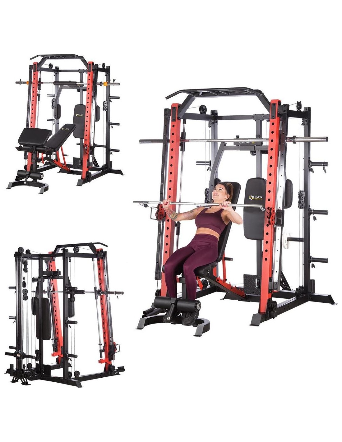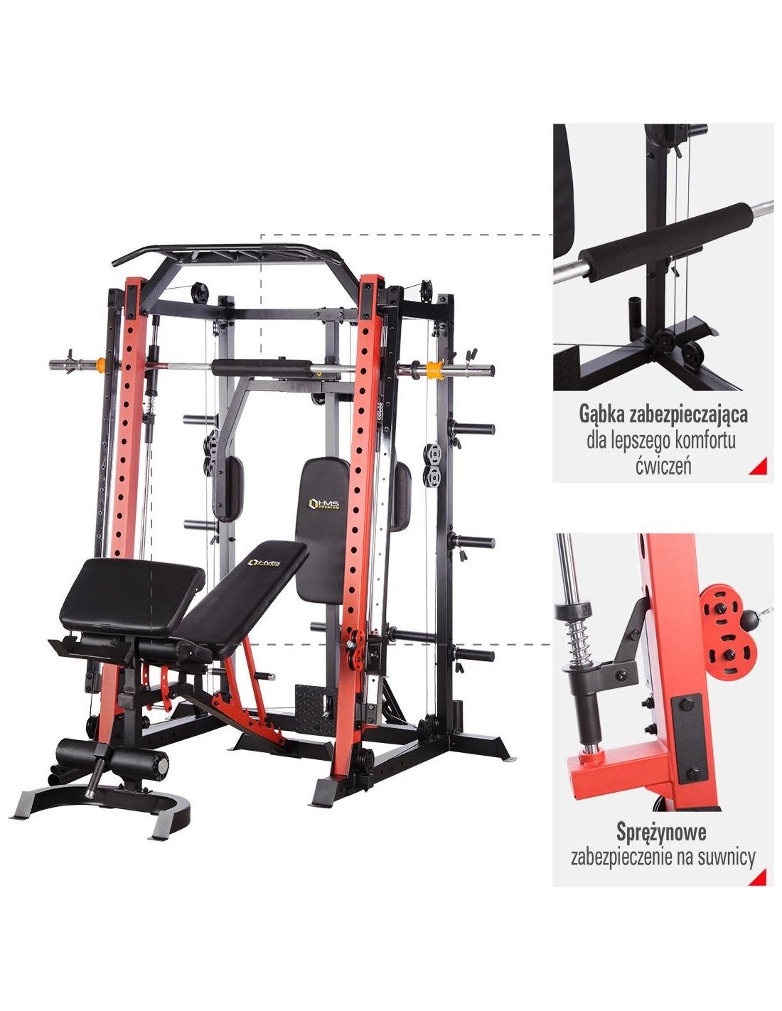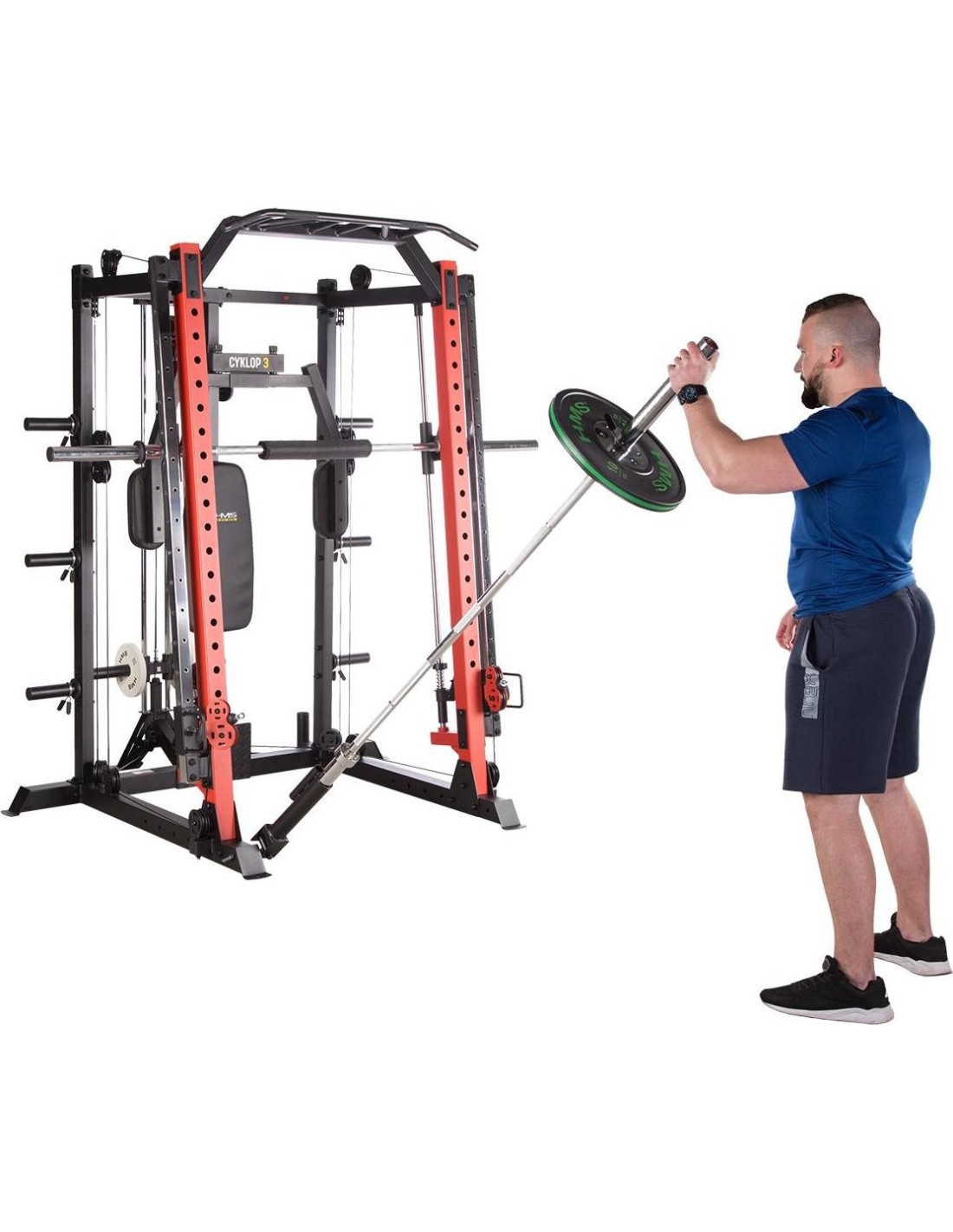 CYKLOP3 HMS, to suwnica klasy Semi Commercial, oznacza to, że idealnie sprawdzi się w małych klubach fitness, ale również do użytku domowego. Materiał najwyższej jakości CYKLOP3, to solidne urządzenie gwarantujące bezpieczny trening. Wytrzymałe grube profile, ze stali najlepszej jakości, zapewniają idealną stabilność sprzętu. Dopracowana pod każdym względem konstrukcja, pozwala łatwo i intuicyjnie korzystać ze sprzętu. Kompleksowy trening CYKLOP3, to nie tylko suwnica. To połączenie suwnicy, drążka do podciągania, butterflya, stojaka na sztangę oraz dwóch wyciągów z regulowaną wysokością. W zestawie z CYKLOPEM3 znajduje się również ławka, wyposażona w możliwość regulacji kąta nachylenia oparcia i siedziska oraz modlitewnik z uchwytem na sztangę. Zbierając wszystkie elementy w całość, otrzymujemy wszechstronny sprzęt, umożliwiający wykonanie ćwiczeń na wszystkie grupy mięśniowe. Efektywność treningu oraz jego możliwości zwiększą się za sprawą dołączonych do zestawu akcesoriów w postaci uchwytów do wyciągu, montowanych poręczy do dipów czy uchwytu landmine na sztangę. Komfort i wygoda Dobry trening to nie tylko solidny ale i wygodny sprzęt. CYKLOP3 posiada wiele udogodnień dla ćwiczącego, między innymi: ławka z regulacjami ustawień, szybka i prosta regulacja wysokości wyciągów czy łatwa blokada gryfu suwnicy. Do gryfu suwnicy została dołączona specjalna gąbka, która zabezpiecza ćwiczącego np. przy wykonywaniu przysiadów. Rękojeści drążka do podciągania są radełkowane dla zwiększenia przyczepności uchwytu. Miękkie oparcie ławki oraz butterflya, pozwoli na długi trening bez uczucia dyskomfortu. Do przechowywania talerzy obciążeniowych, użytkownik ma do dyspozycji funkcjonalnie usytuowane stojaki, a dla bezpieczeństwa do każdego stojaka przewidziany jest sprężynowy zacisk. CYKLOP3 HMS, to suwnica, która sprawdzi się w każdej domowej siłowni i w każdym małym klubie. Z pewnością spełni oczekiwania, wszystkich użytkowników. Specyfikacja: Wymiary produktu: długość: 173 cm szerokość: 159 cm, z gryfem 212 cm wysokość: 219 cm Gryf: długość: 212 cm średnica: 32 mm waga: 17,2 kg Ławka: Długość: 158 cm Szerokość: 66 cm Wysokość: 56,5 - 137 cm Regulacja nachylenia oparcia: 6 poziomów Regulacja nachylenia siedziska: 3 poziomy Regulacja wysokości modlitewnika: 5 poziomów, co 2,5 cm Oparcie: 86 x 30 x 5,5 cm Siedzisko: 43 x 43,5 x 5,5 cm Modlitewnik: 52 x 34,5 x 5,5 cm Butterfly: Oparcie: 67,5 x 31 x 5,5 cm Rozstaw ramion: 85 cm Oparcia na ramionach: 31 x 15 cm Drążek do podciągania: Rozstaw rękojeści: 93 / 67 / 40 / 12,5 Średnica rękojeści: 28 mm Długość jednego rękawa do obciążenia wyciągu: 22,5 cm Długość stojaków na talerze obciążeniowe: 19 cm Regulacja wysokości wyciągów: 15 poziomów Łożyska we wszystkich krążkach Rodzaj obciążenia: talerze obciążeniowe (nie są dołączone do zestawu) Uchwyty do zawieszenia wolnych ciężarów o średnicy 50 i 25 mm Prowadnice gryfu z mechanizmem bezpieczeństwa Regulacja napięcia linek Asekuracja: 15 stopni Podpory na sztangę Możliwość treningu z ławką Maksymalne obciążenie wyciągu: 135 kg, po 67,5 kg na każdy rękaw Wytrzymałość linek wyciągu: 900 kg Maksymalna waga użytkownika: 150 kg Maksymalne obciążenie ławki: 270 kg Waga produktu: netto: 260,5 kg Przyrządy do ćwiczeń: Suwnica Smitha Dwa wyciągi z regulowaną wysokością Drążek do podciągania Butterfly Ławka Uwagi: Gwarancja 12 miesięcy w przypadku użytku komercyjnego Gwarancja 24 miesiące w przypadku użytku domowego