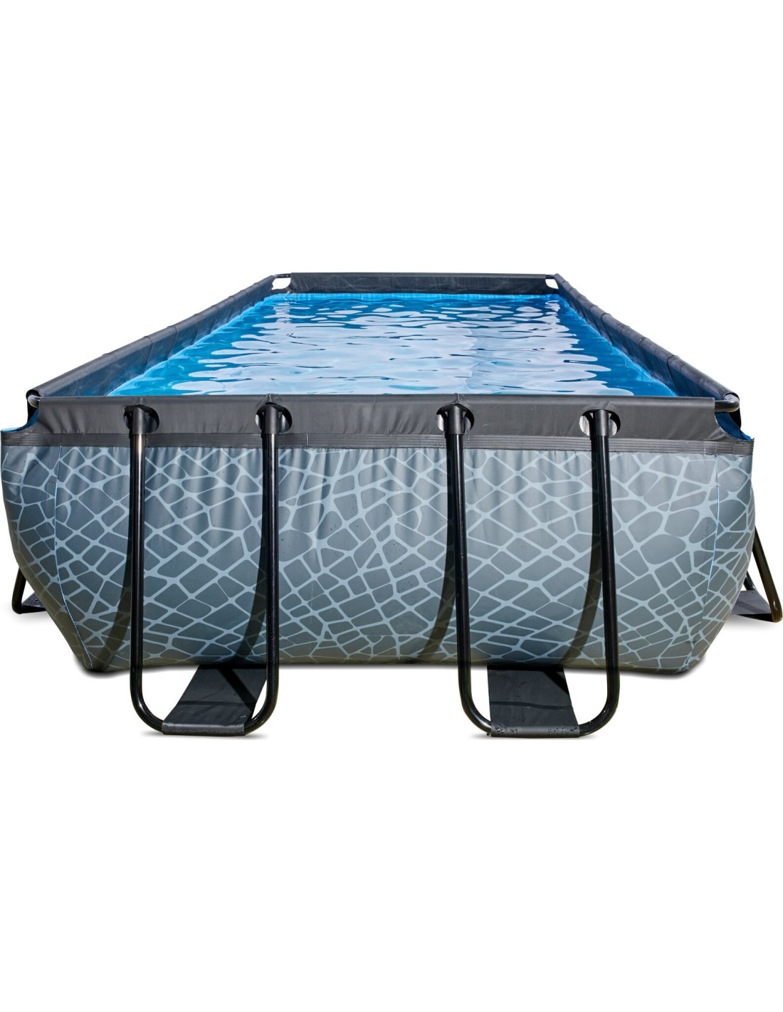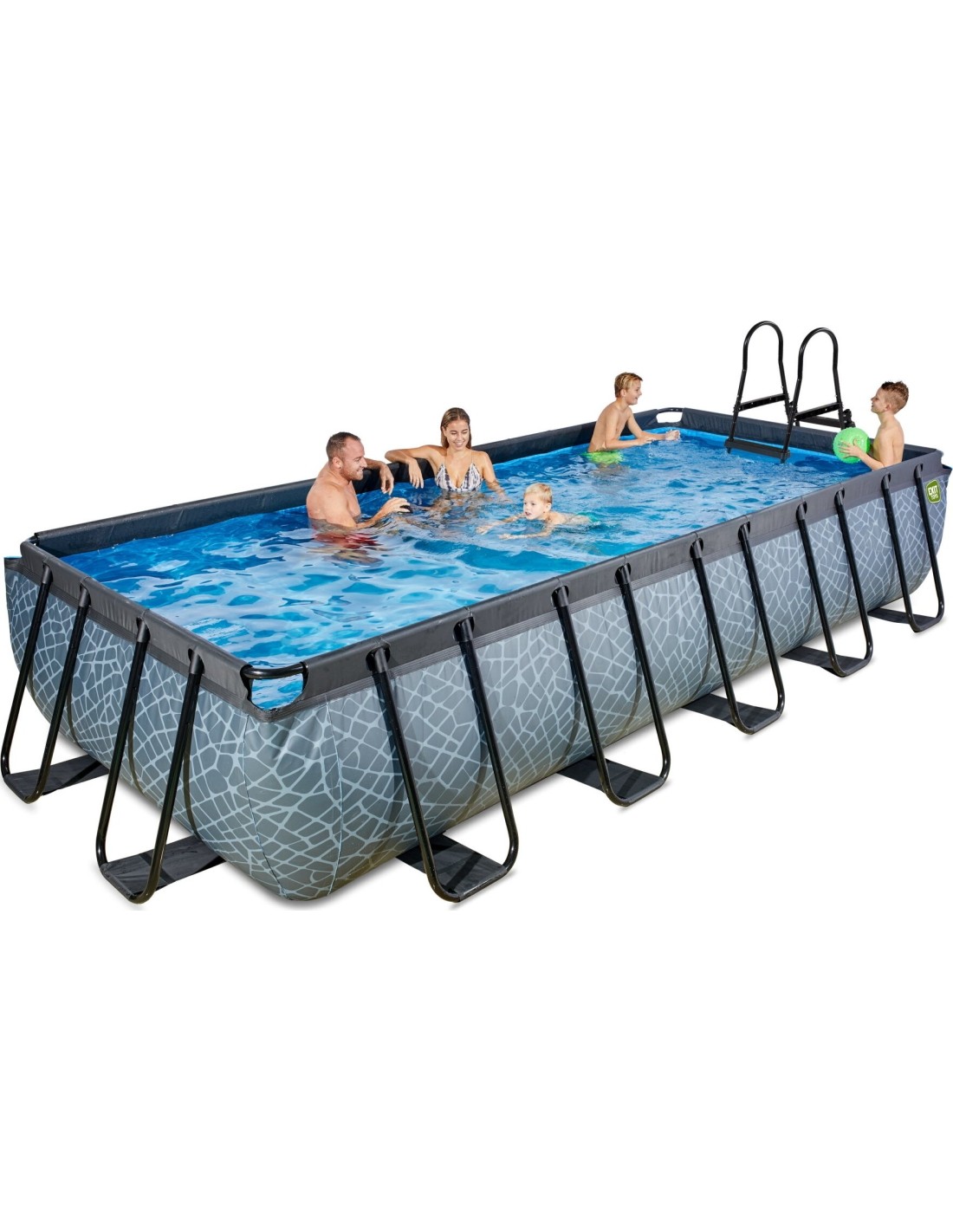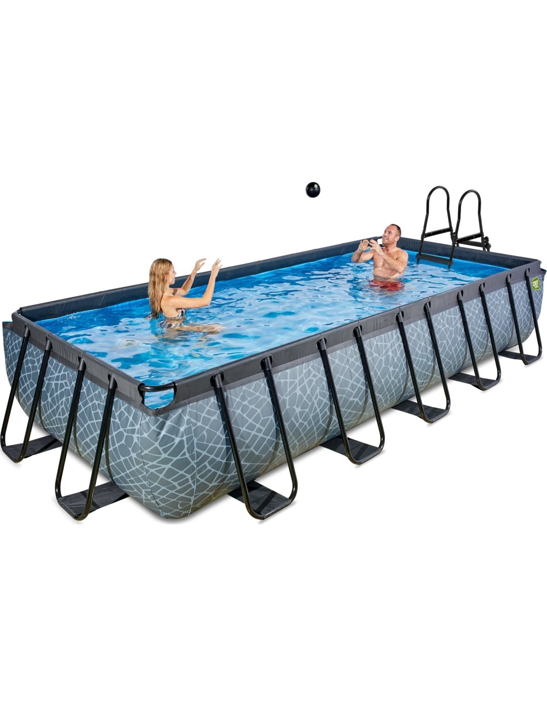 Basen ogrodowy EXIT Stone ma nowoczesny i wytrzymały "kamienny" wzór na bocznej ścianie, który idealnie dopasowuje się do ogrodu. Wnętrze basenu jest niebieskie, co zapewnia uczucie świeżości. Wystarcza w nim miejsca dla maksymalnie dziewięciu osób. Basen ogrodowy EXIT jest wyposażony w mocne, 3-warstwowe ścianki z PVC i poliestru. System cyrkulacji wody uzupełnia basen. Wysokiej jakości pompa z filtrem piaskowym czyści jak w naturze, pompując wodę przez piasek. Gwarantuje to, że w filtrze pozostają zanieczyszczenia takie jak piasek, owady lub rośliny.