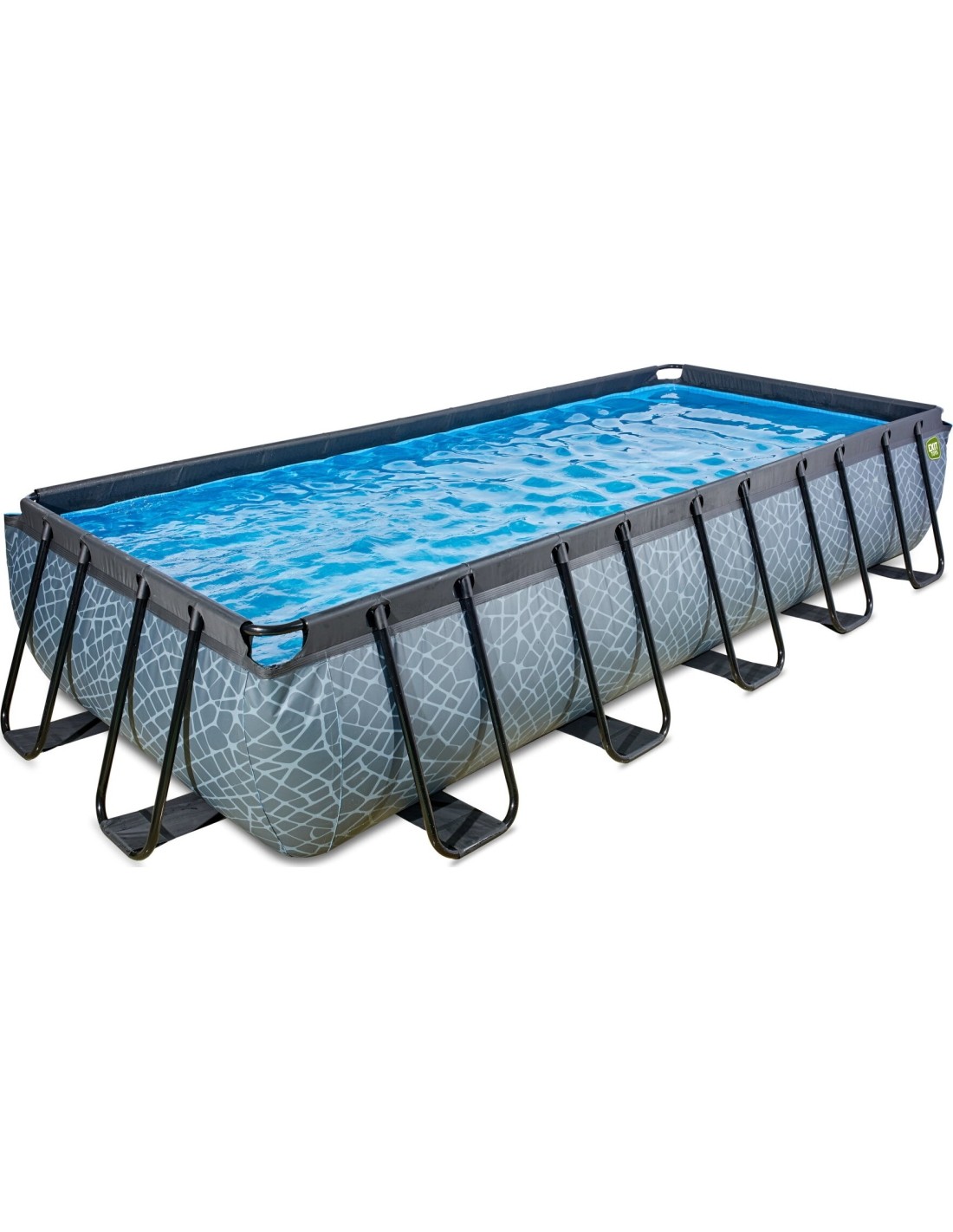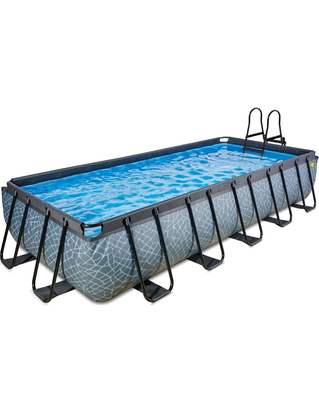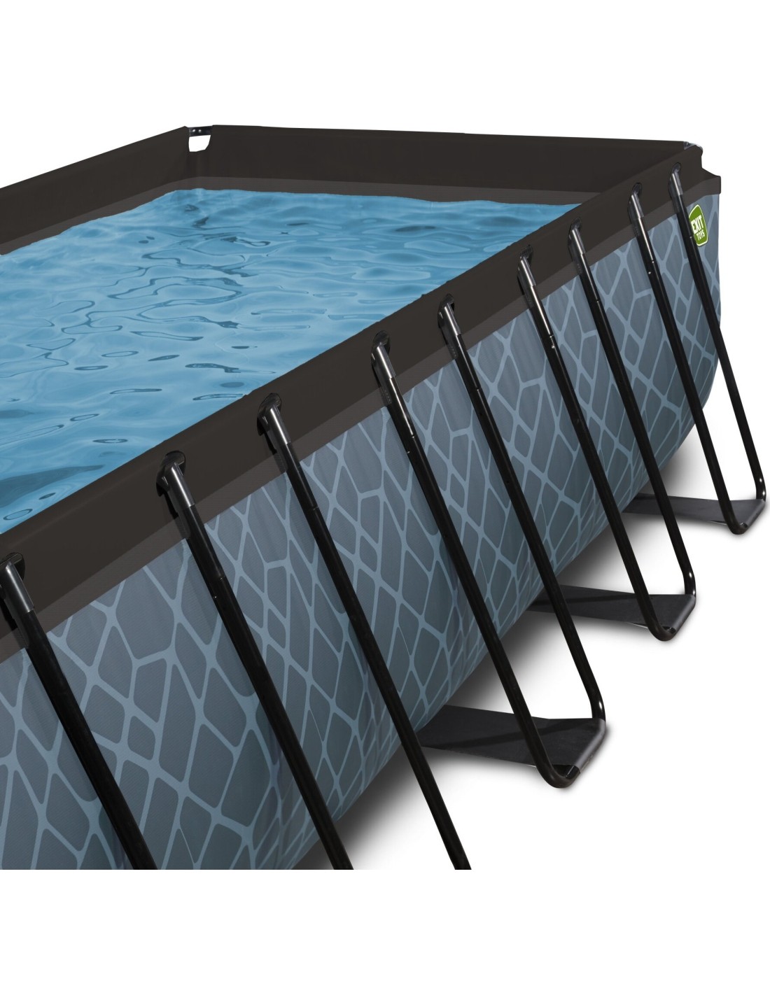 Basen ogrodowy EXIT Stone ma nowoczesny i wytrzymały "kamienny" wzór na bocznej ścianie, który idealnie dopasowuje się do ogrodu. Wnętrze basenu jest niebieskie, co zapewnia uczucie świeżości. Wystarcza w nim miejsca dla maksymalnie dziewięciu osób. Basen ogrodowy EXIT jest wyposażony w mocne, 3-warstwowe ścianki z PVC i poliestru. System cyrkulacji wody uzupełnia basen. Wysokiej jakości pompa z filtrem piaskowym czyści jak w naturze, pompując wodę przez piasek. Gwarantuje to, że w filtrze pozostają zanieczyszczenia takie jak piasek, owady lub rośliny.