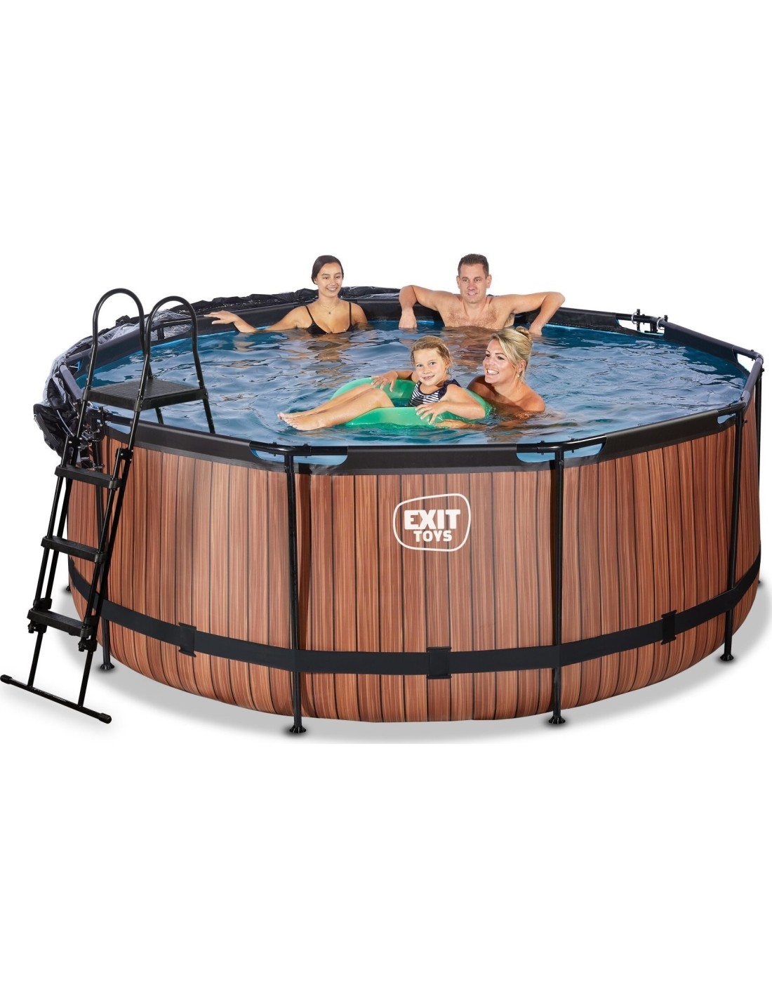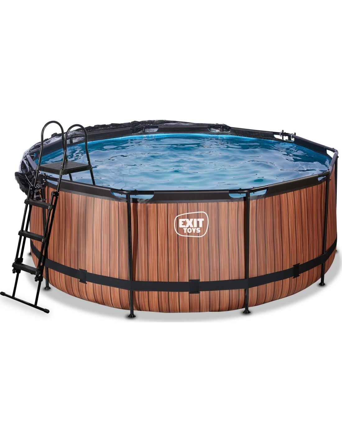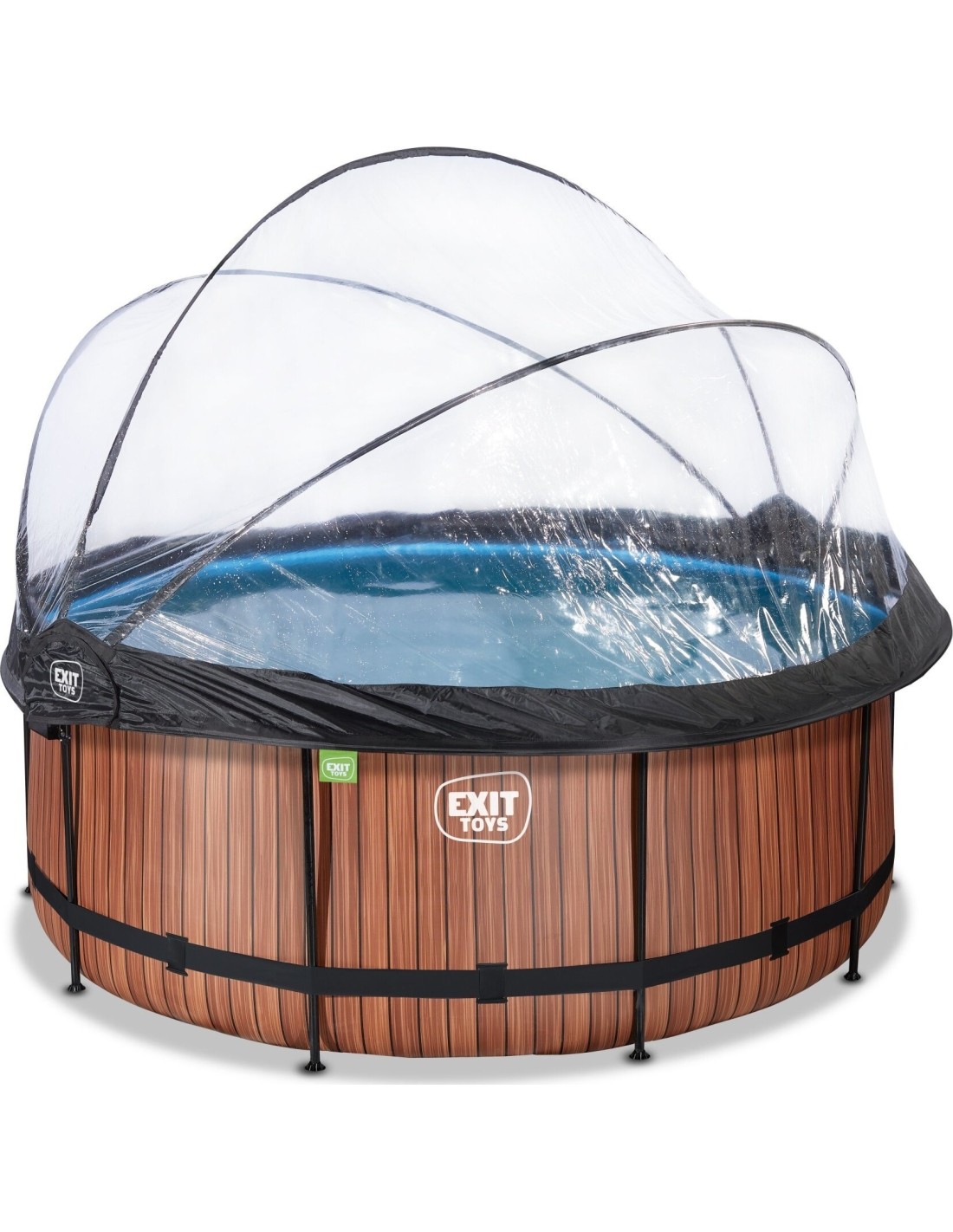 Basen EXIT Wood ø360 x 122 cm to okrągły basen ramowy z kopułą. Basen o drewnianym wyglądzie jest standardowo wyposażony w pompę z filtrem piaskowym, pompę ciepła oraz drabinkę basenową, dzięki której można bezpiecznie wejść i wyjść z basenu. Basen ramowy jest wystarczająco przestronny, aby wykorzystać go do relaksu na pływającym materacu powietrznym. A może wolisz pływać pod wodą? Basen EXIT Wood ma 122 centymetry głębokości, co pozwala na rzeczywiste zanurzenie się w nim. Z basenem ramowym od EXIT Toys z pewnością przeżyjesz najlepsze wodne przygody we własnym ogrodzie!