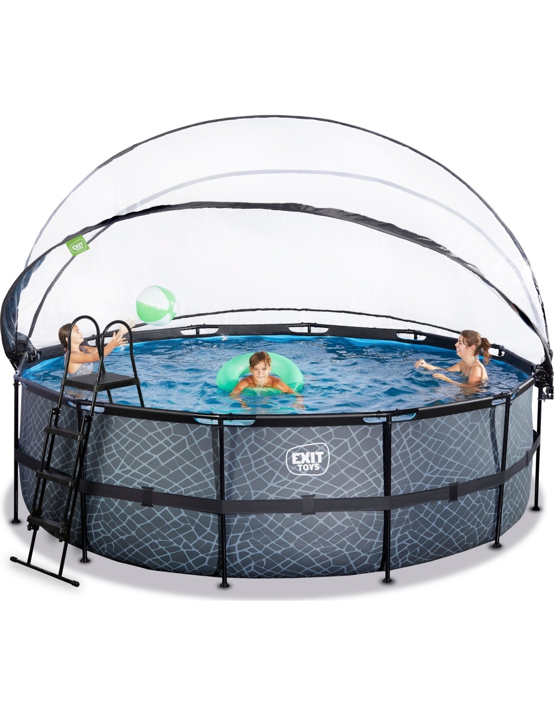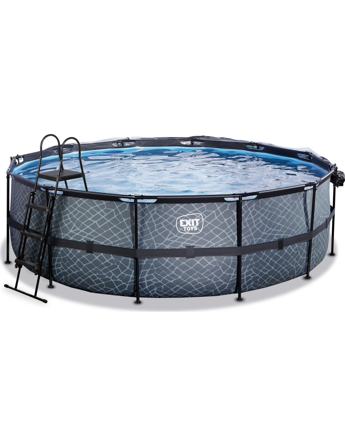 Basen EXIT Stone ø450 x 122 cm to okrągły basen ramowy w kolorze szarym z kopułą. W standardzie basen wyposażony jest w pompę z filtrem piaskowym, pompę ciepła oraz drabinkę basenową, dzięki której można bezpiecznie wejść i wyjść z basenu. Duża średnica basenu oferuje wystarczająco dużo miejsca na relaks na uroczym pływającym materacu powietrznym. A może wolisz pływać pod wodą? Basen EXIT Stone ma 122 centymetry głębokości, co pozwala na faktyczne zanurzenie się w nim. Z basenem ramowym od EXIT Toys z pewnością przeżyjesz najlepsze wodne przygody we własnym ogrodzie!
