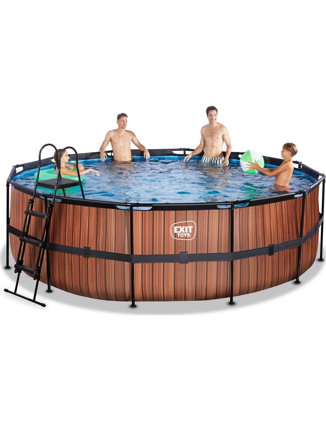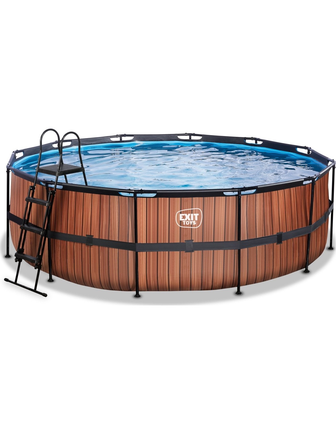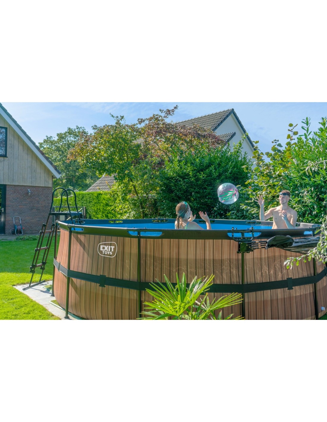Basen EXIT Wood ø450 x 122 cm to okrągły basen ramowy o drewnianym wyglądzie. Basen jest standardowo wyposażony w pompę z filtrem piaskowym oraz drabinkę basenową, dzięki której można bezpiecznie wejść i wyjść z basenu. Duża średnica basenu oferuje wystarczająco dużo miejsca na relaks na uroczym pływającym materacu powietrznym. A może wolisz pływać pod wodą? Basen EXIT Wood ma 122 centymetry głębokości, co pozwala na faktyczne zanurzenie się w nim. Z basenem ramowym od EXIT Toys z pewnością przeżyjesz najlepsze wodne przygody we własnym ogrodzie!