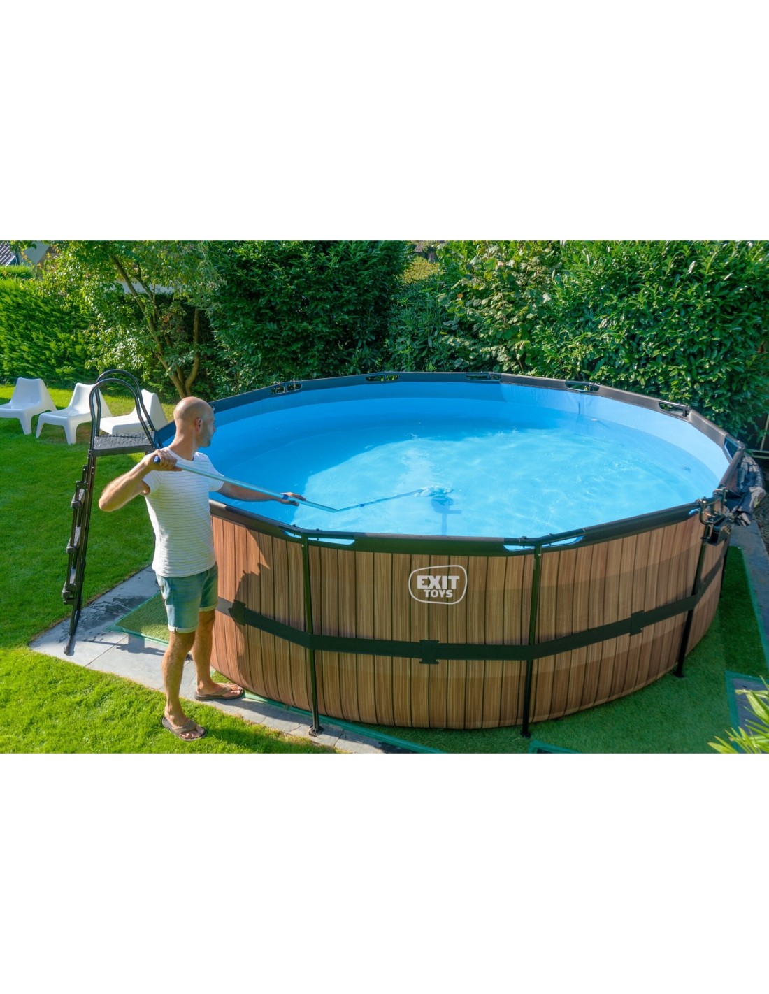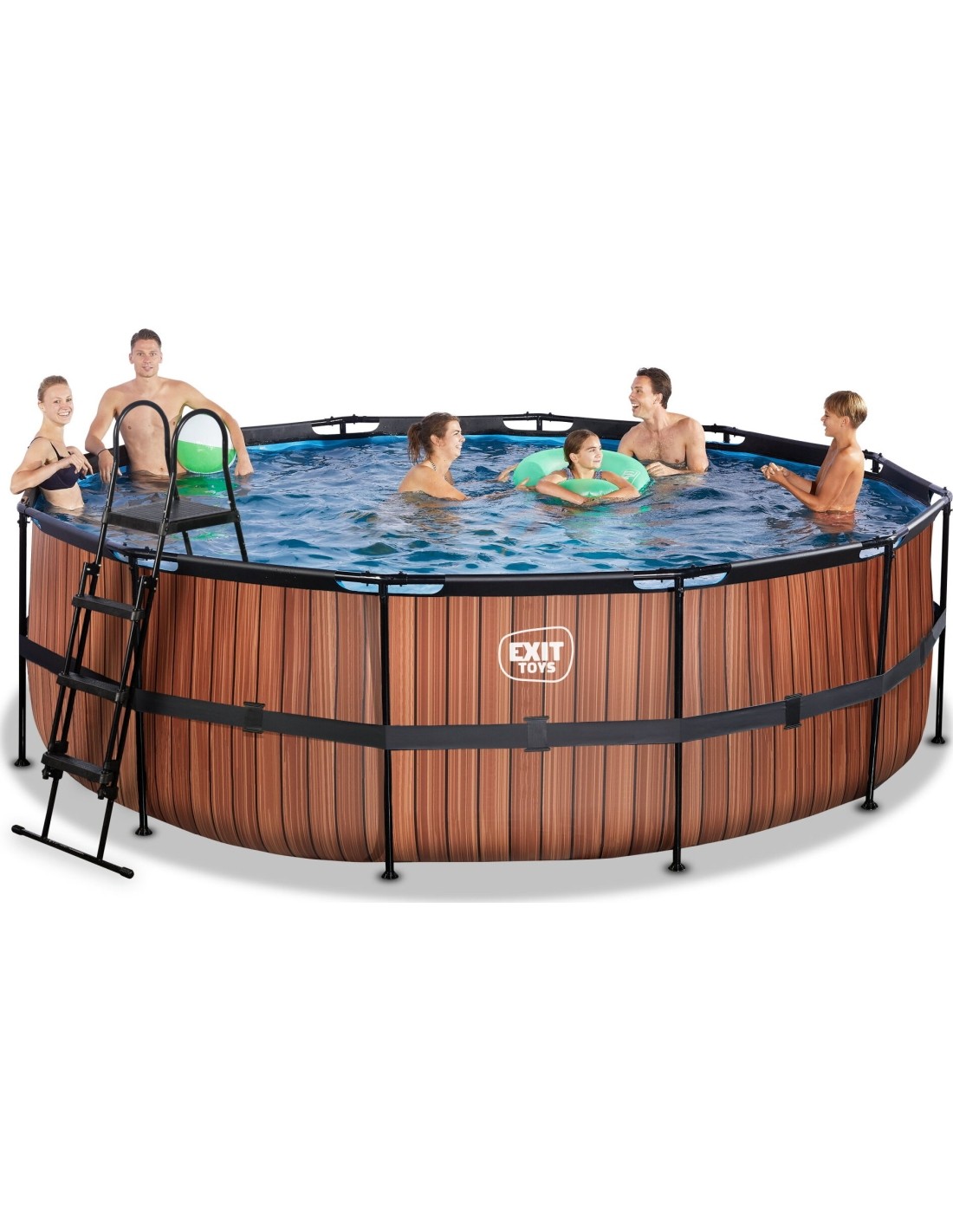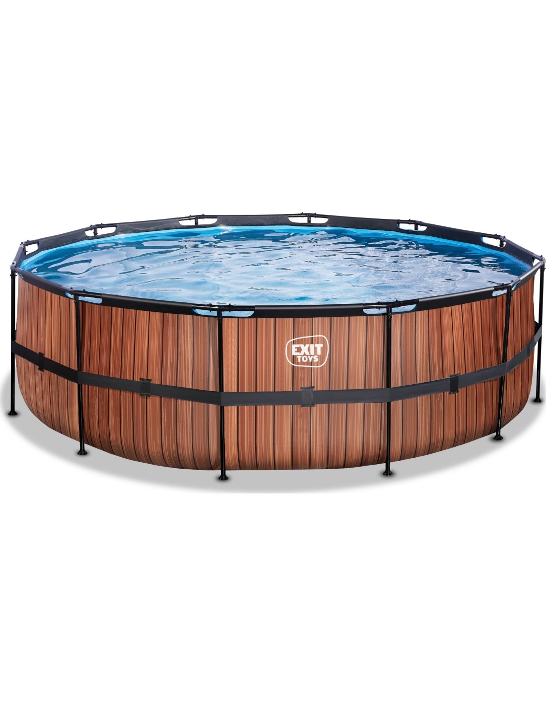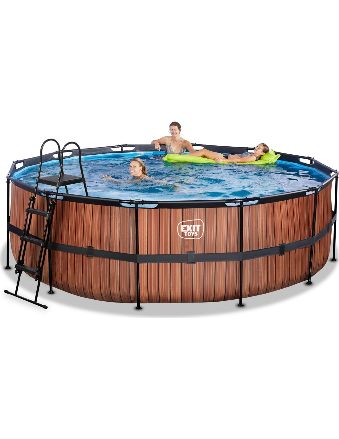 Basen EXIT Wood ø450 x 122 cm to okrągły basen ramowy o drewnianym wyglądzie. Basen jest standardowo wyposażony w pompę z filtrem piaskowym oraz drabinkę basenową, dzięki której można bezpiecznie wejść i wyjść z basenu. Duża średnica basenu oferuje wystarczająco dużo miejsca na relaks na uroczym pływającym materacu powietrznym. A może wolisz pływać pod wodą? Basen EXIT Wood ma 122 centymetry głębokości, co pozwala na faktyczne zanurzenie się w nim. Z basenem ramowym od EXIT Toys z pewnością przeżyjesz najlepsze wodne przygody we własnym ogrodzie!