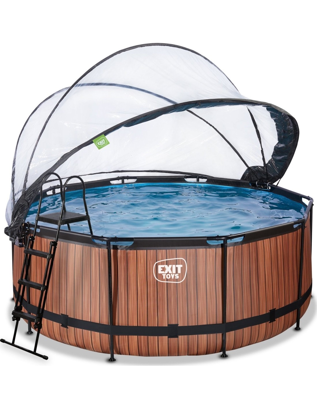 Basen EXIT Wood ø360 x 122 cm to okrągły basen ramowy z kopułą. Basen o drewnianym wyglądzie jest standardowo wyposażony w pompę z filtrem piaskowym oraz drabinkę basenową, dzięki której można bezpiecznie wejść i wyjść z basenu. Basen ramowy jest wystarczająco przestronny, aby wykorzystać go do relaksu na pływającym materacu powietrznym. A może wolisz pływać pod wodą? Basen EXIT Wood ma 122 centymetry głębokości, co pozwala na rzeczywiste nurkowanie w nim. Z basenem ramowym od EXIT Toys z pewnością przeżyjesz najlepsze wodne przygody we własnym ogrodzie!
