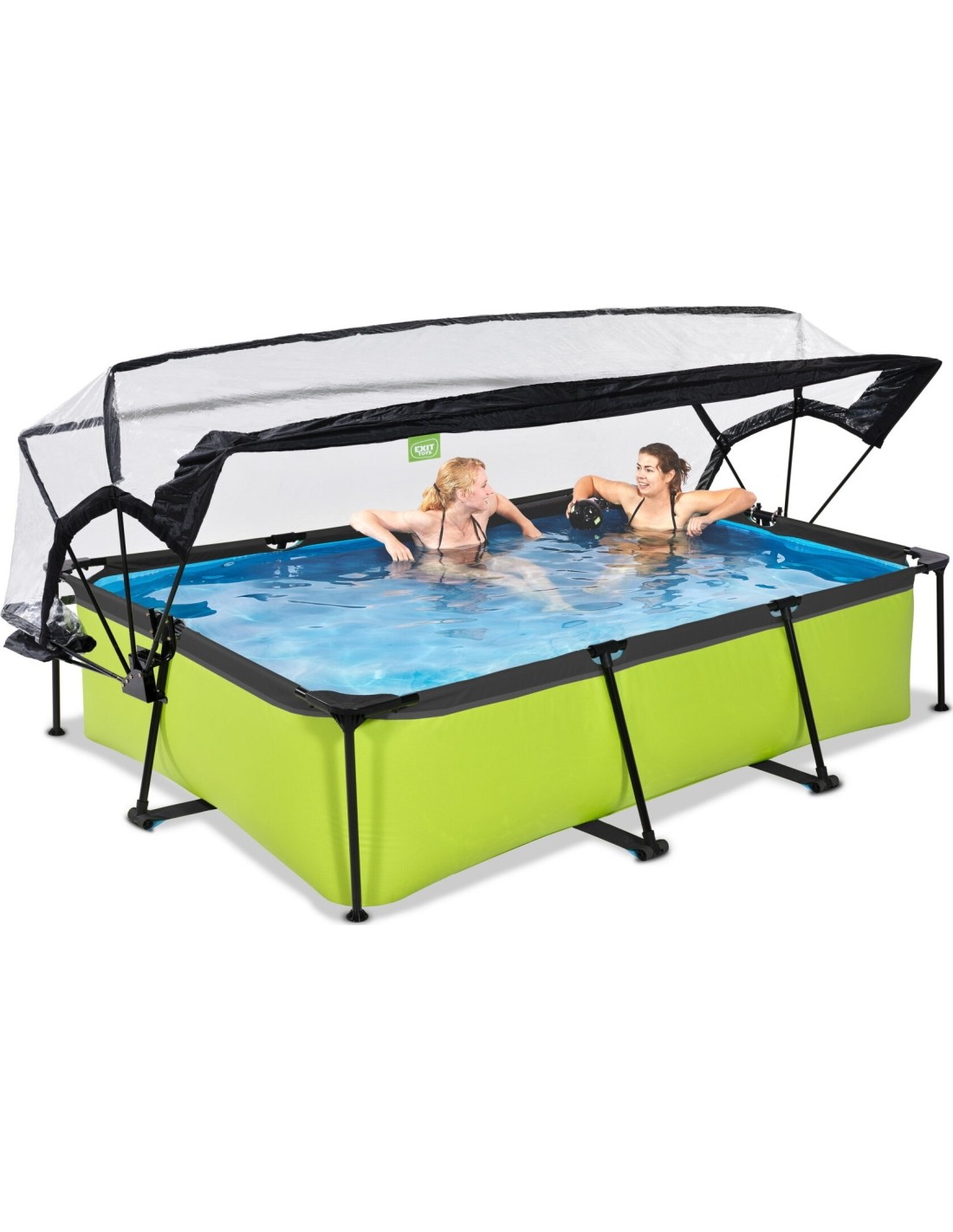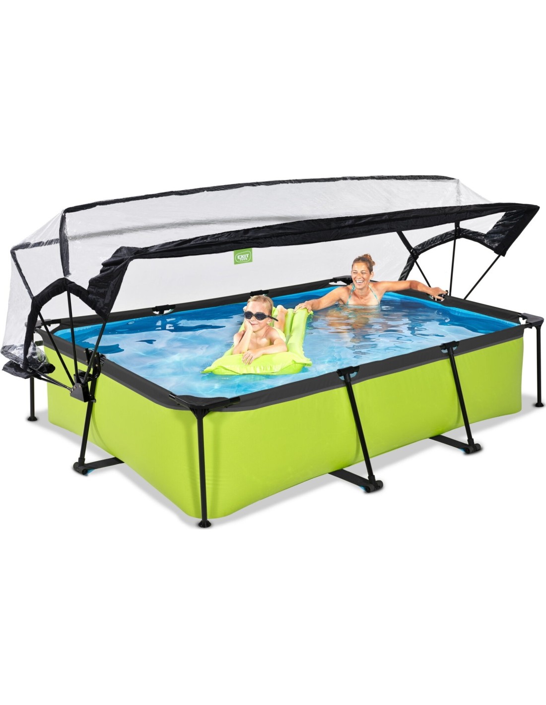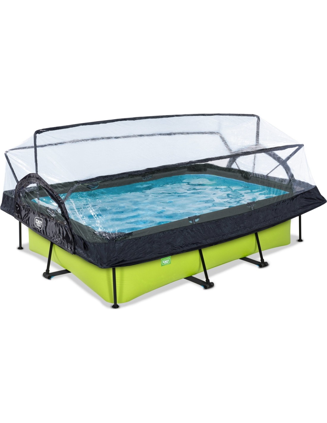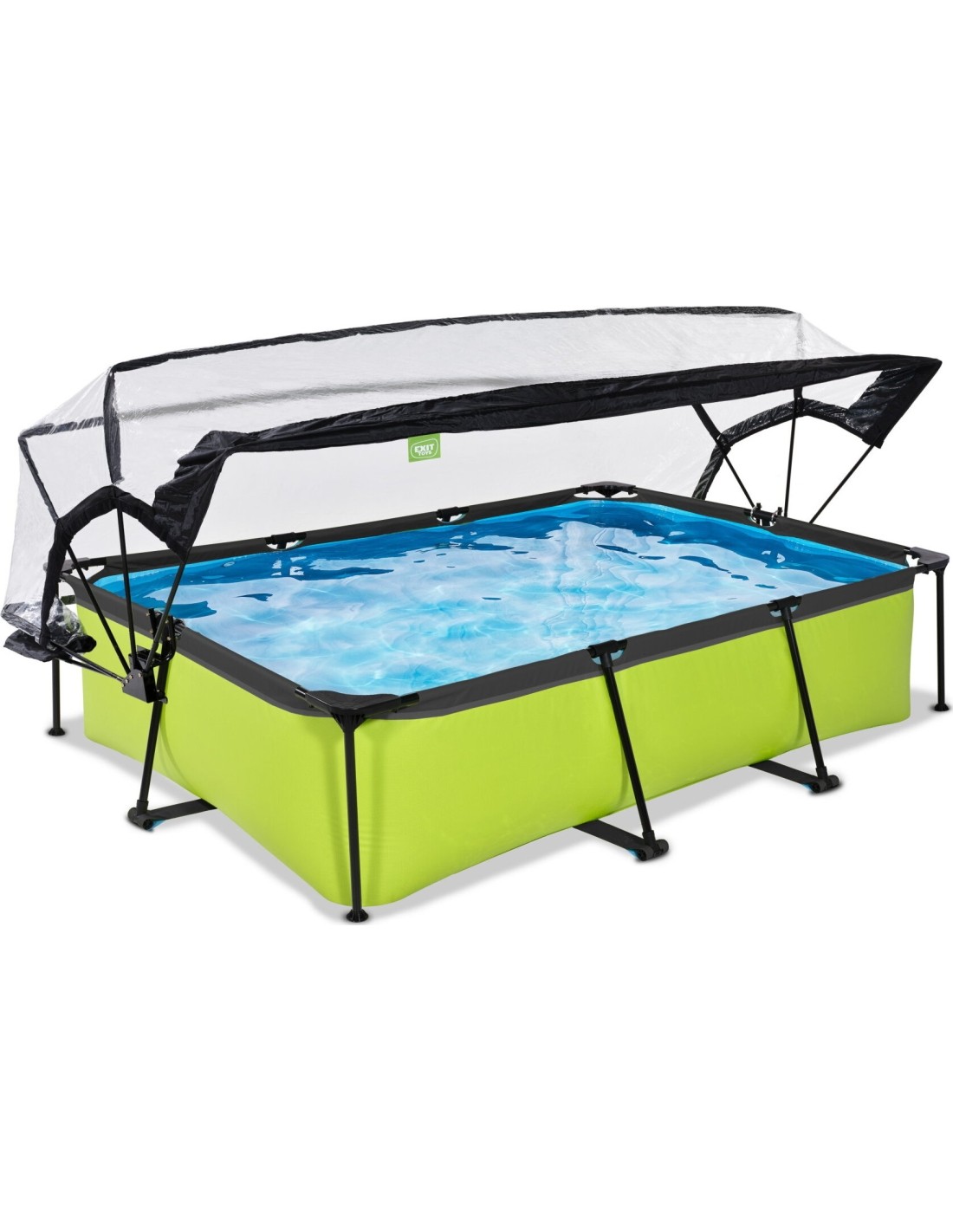 .Basen EXIT Lime 300 x 200 x 65 cm to prostokątny basen stelażowy w zielonym kolorze z kopułą. Ten kompaktowy basen zawiera pompę filtracyjną i naprawdę wyróżnia się swoim orzeźwiającym, limonkowym kolorem. Szukasz odpowiedniego basenu dla małych dzieci lub uroczego, płytkiego basenu dla siebie, w którym mógłbyś się ochłodzić? Wybierz ten wyjątkowy i wysokiej jakości basen z kopułą od EXIT Toys!