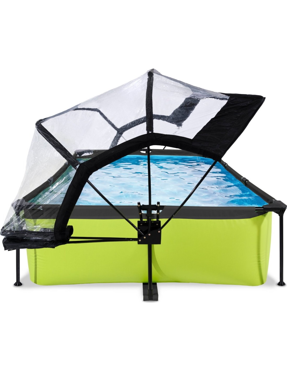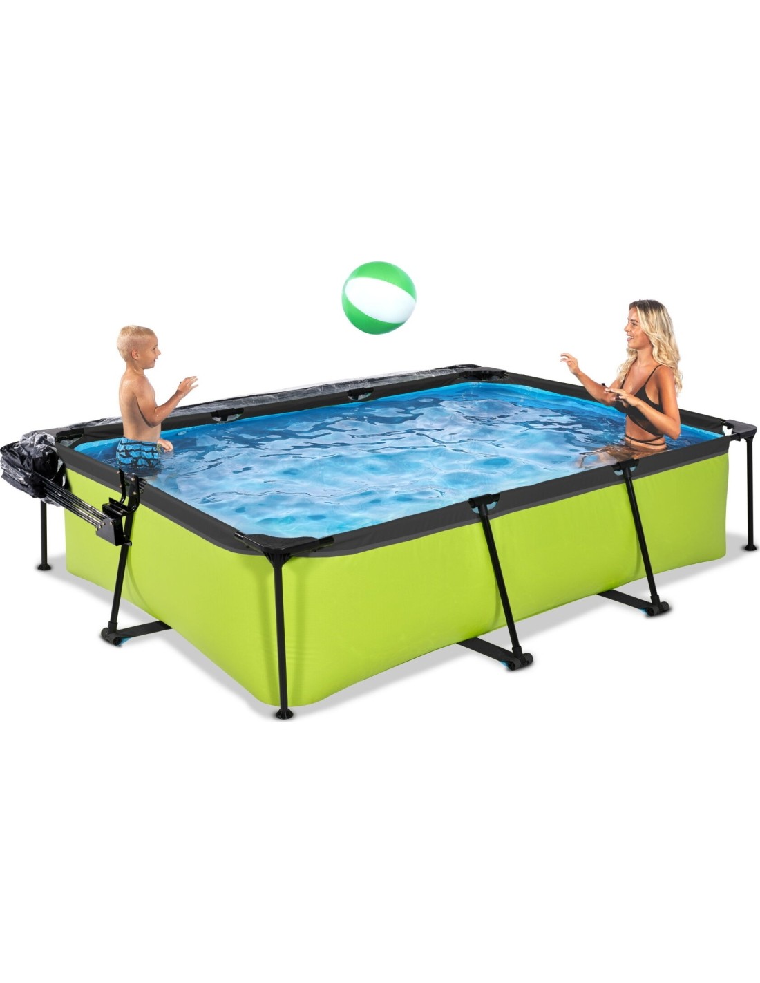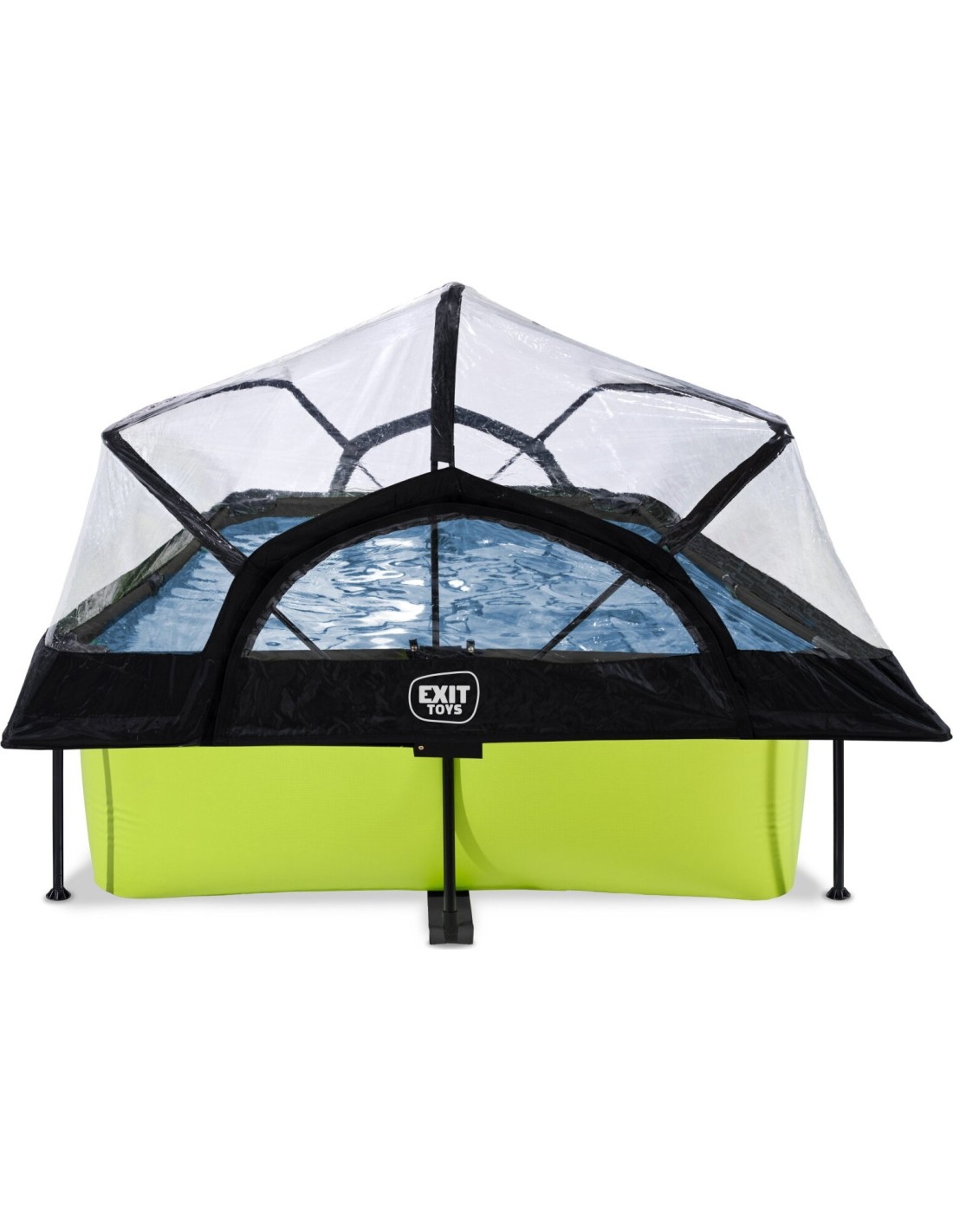 .Basen EXIT Lime 300 x 200 x 65 cm to prostokątny basen stelażowy w zielonym kolorze z kopułą. Ten kompaktowy basen zawiera pompę filtracyjną i naprawdę wyróżnia się swoim orzeźwiającym, limonkowym kolorem. Szukasz odpowiedniego basenu dla małych dzieci lub uroczego, płytkiego basenu dla siebie, w którym mógłbyś się ochłodzić? Wybierz ten wyjątkowy i wysokiej jakości basen z kopułą od EXIT Toys!