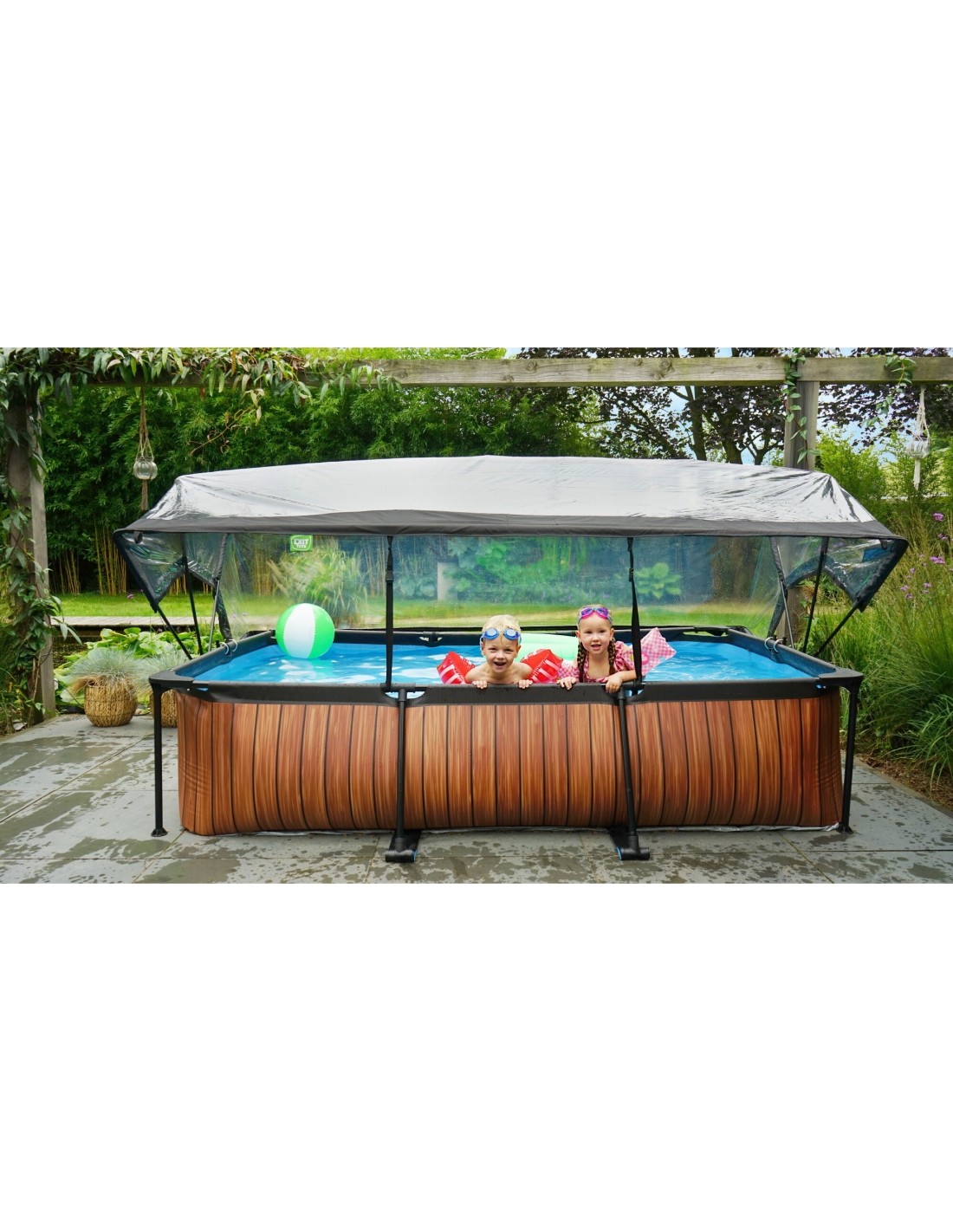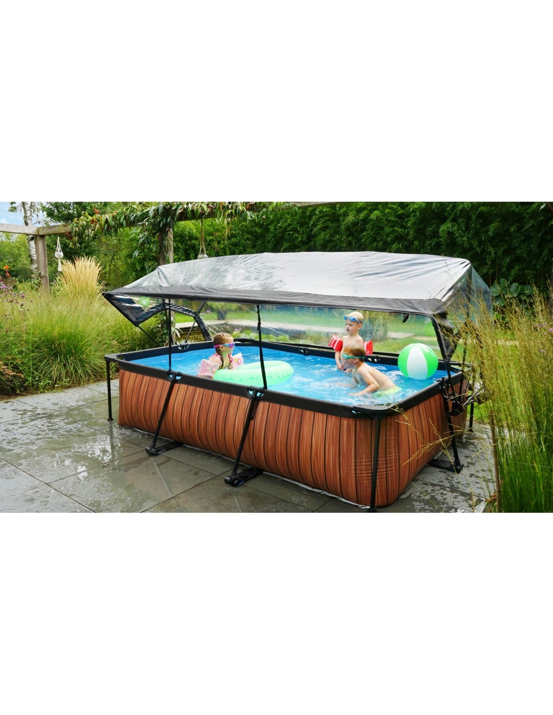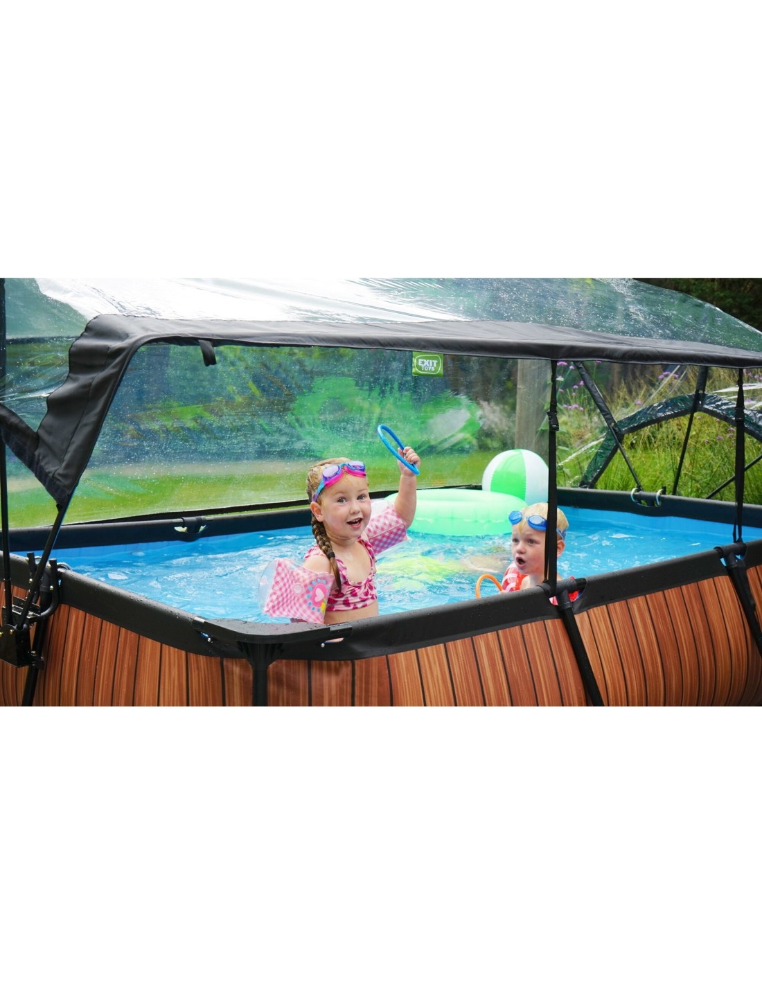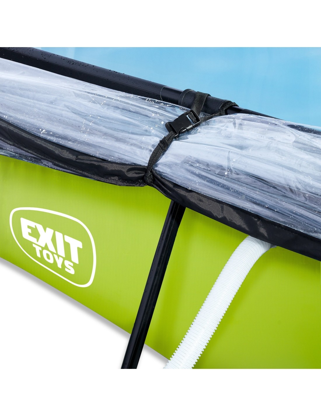 .Basen EXIT Lime 300 x 200 x 65 cm to prostokątny basen stelażowy w zielonym kolorze z kopułą. Ten kompaktowy basen zawiera pompę filtracyjną i naprawdę wyróżnia się swoim orzeźwiającym, limonkowym kolorem. Szukasz odpowiedniego basenu dla małych dzieci lub uroczego, płytkiego basenu dla siebie, w którym mógłbyś się ochłodzić? Wybierz ten wyjątkowy i wysokiej jakości basen z kopułą od EXIT Toys!