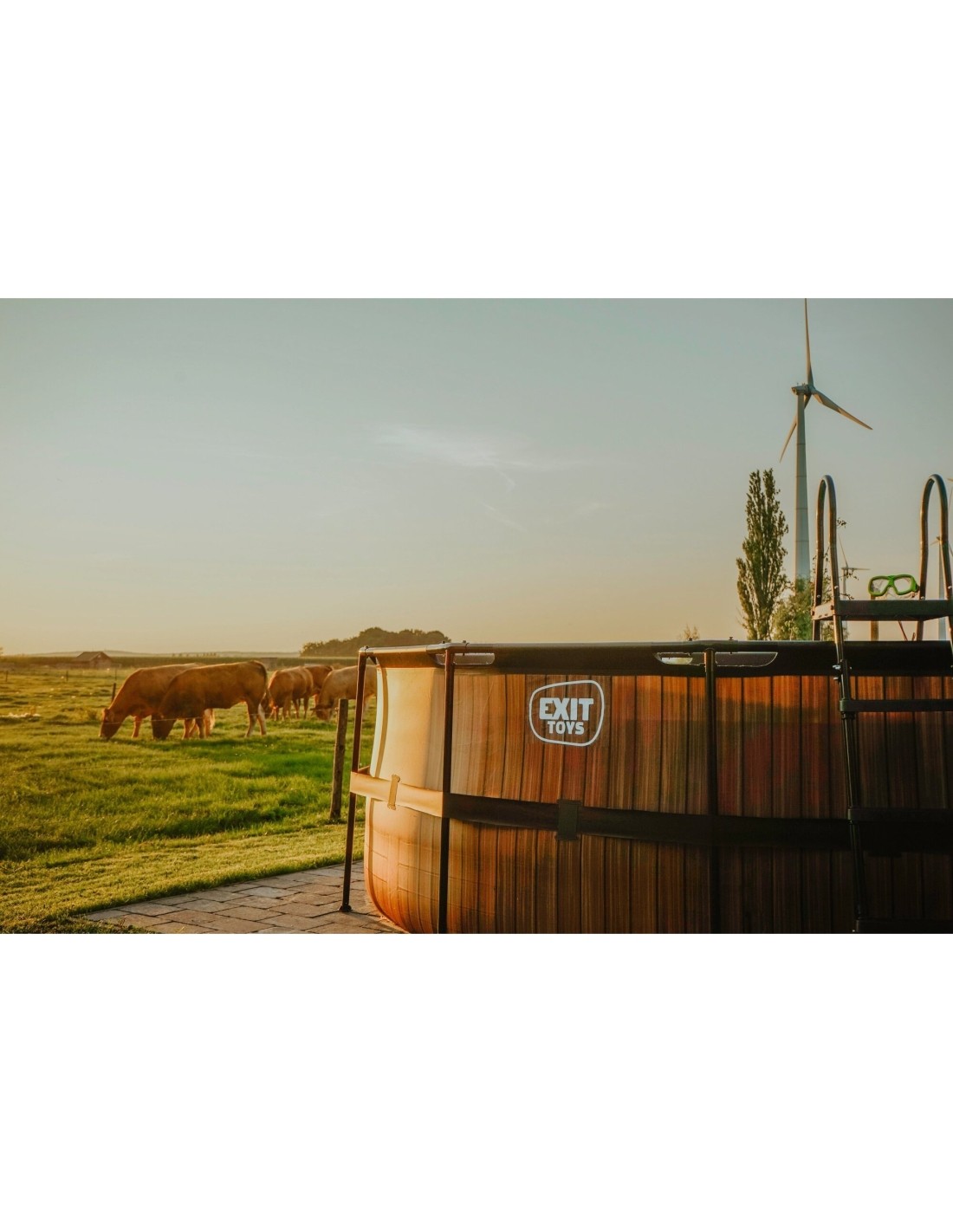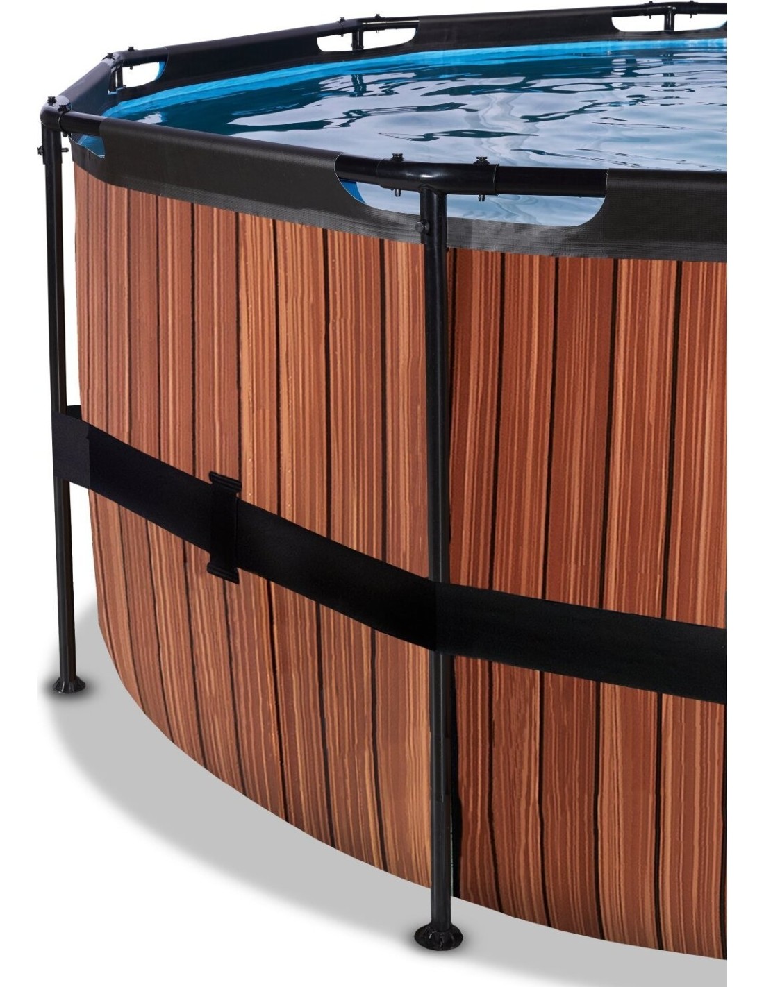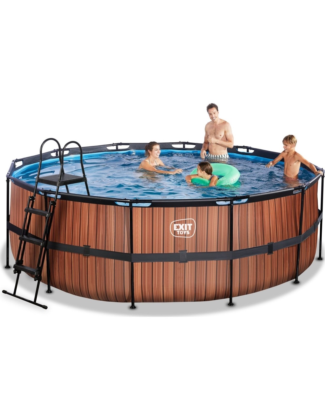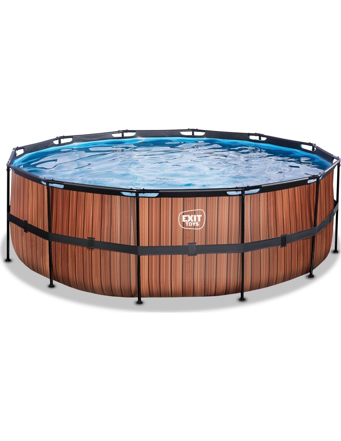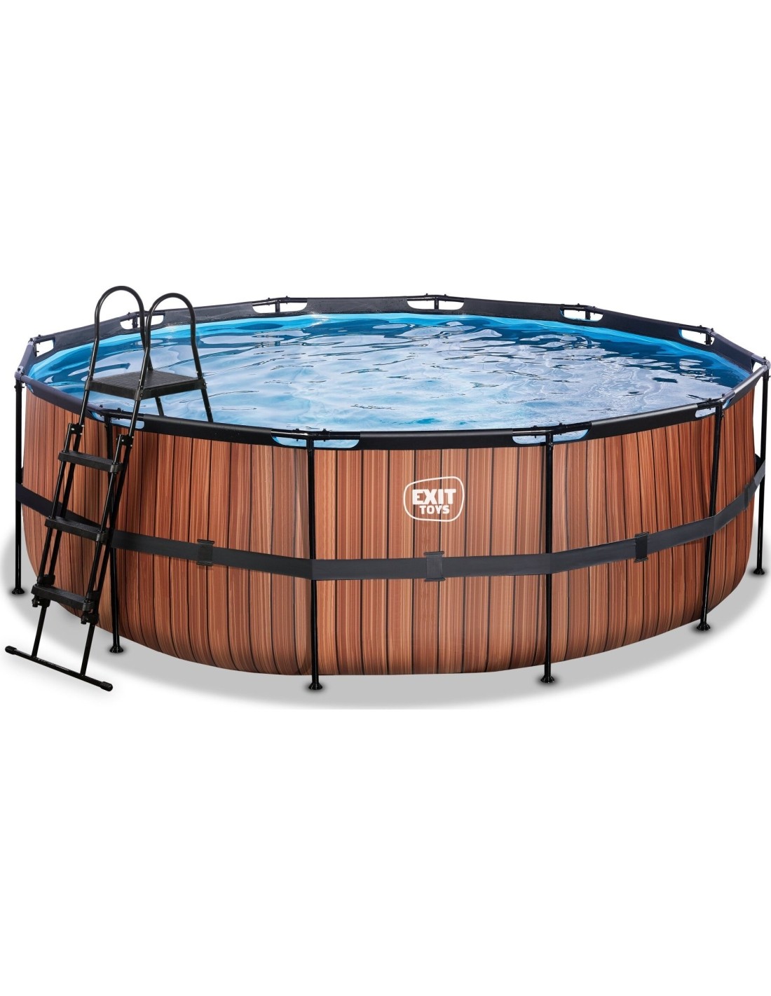 Basen EXIT Wood ø427 x 122 cm to okrągły basen ramowy o drewnianym wyglądzie. Basen jest standardowo wyposażony w pompę z filtrem piaskowym oraz drabinkę basenową, dzięki której można bezpiecznie wejść i wyjść z basenu. Basen Wood ma nowoczesny i solidny drewniany wzór na boku, który tworzy wyróżniającą się cechę dla ogrodu. Wnętrze basenu jest niebieskie, aby stworzyć uczucie świeżości w basenie. Basen EXIT wyposażony jest w mocne 3-warstwowe ściany, wykonane z PVC i poliestru. Odkryj jak wytrzymały może być okrągły basen naziemny: Malowana proszkowo stalowa rama i solidne nogi basenu EXIT Wood zapewniają, że basen zawsze pozostaje stabilny i będzie służył przez lata. A dostarczony system cyrkulacji wody dopełnia basen. Wysokiej jakości pompa filtra piaskowego oczyszcza z basenu nawet najmniejsze drobiny zanieczyszczeń, pompując z dużą mocą wodę przez złoże filtracyjne.