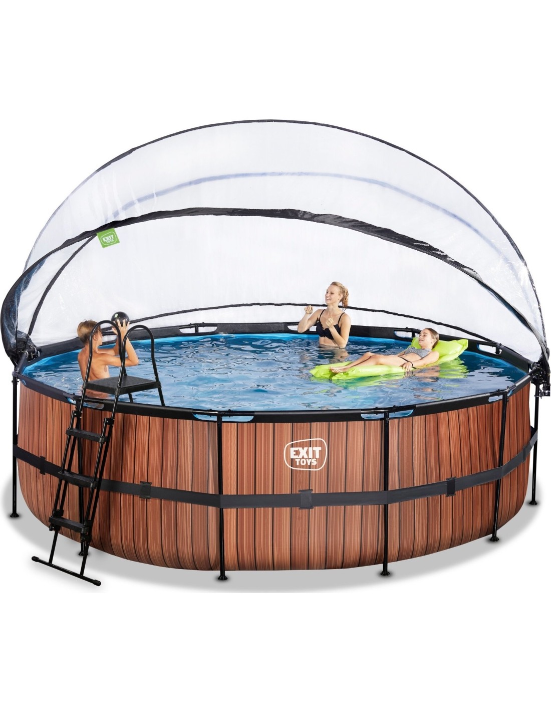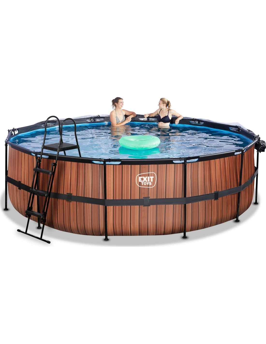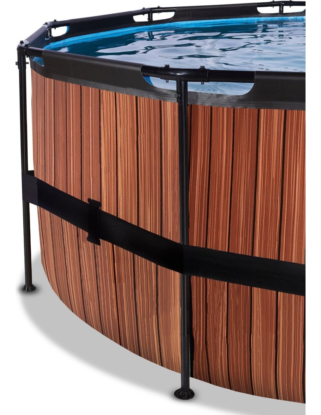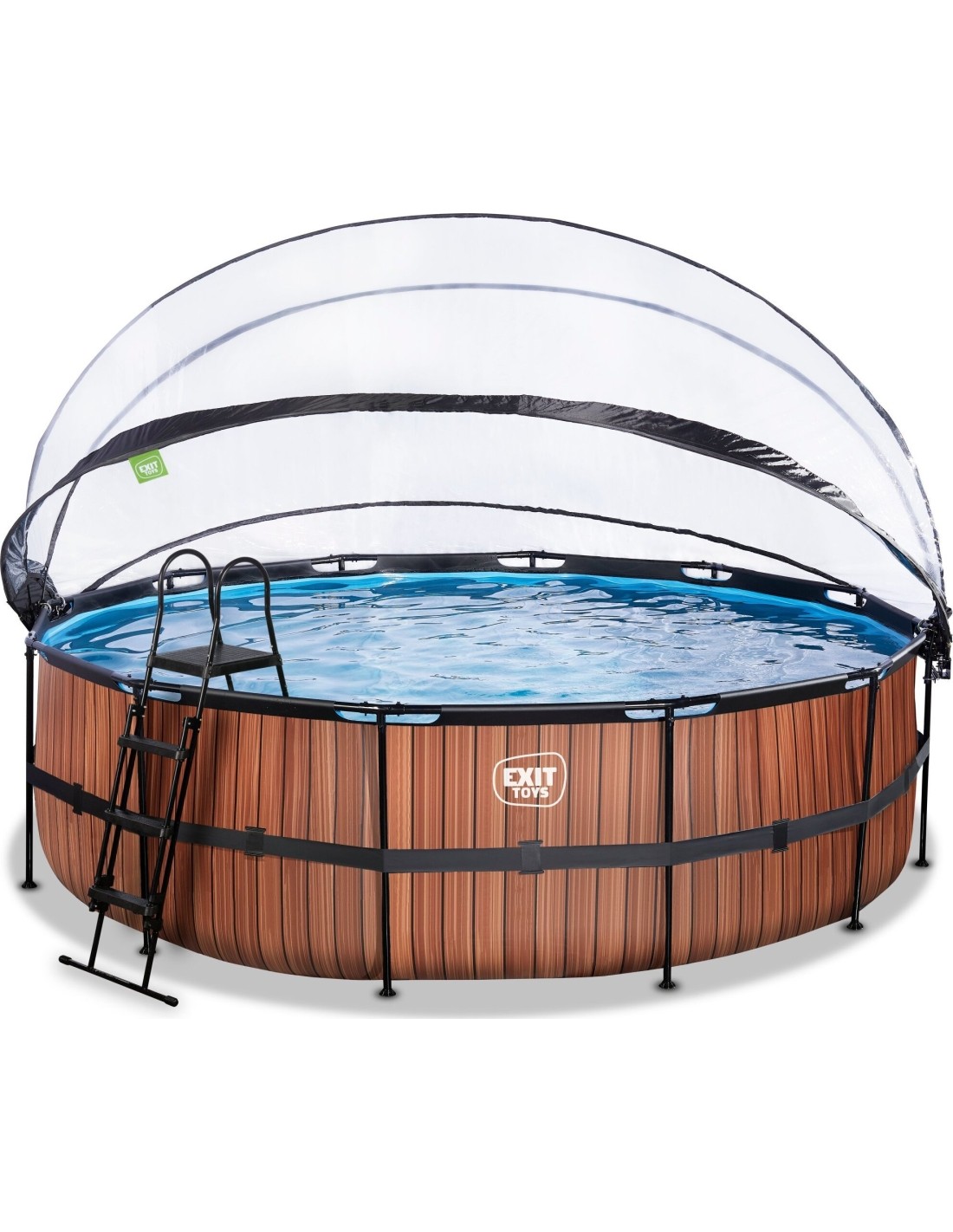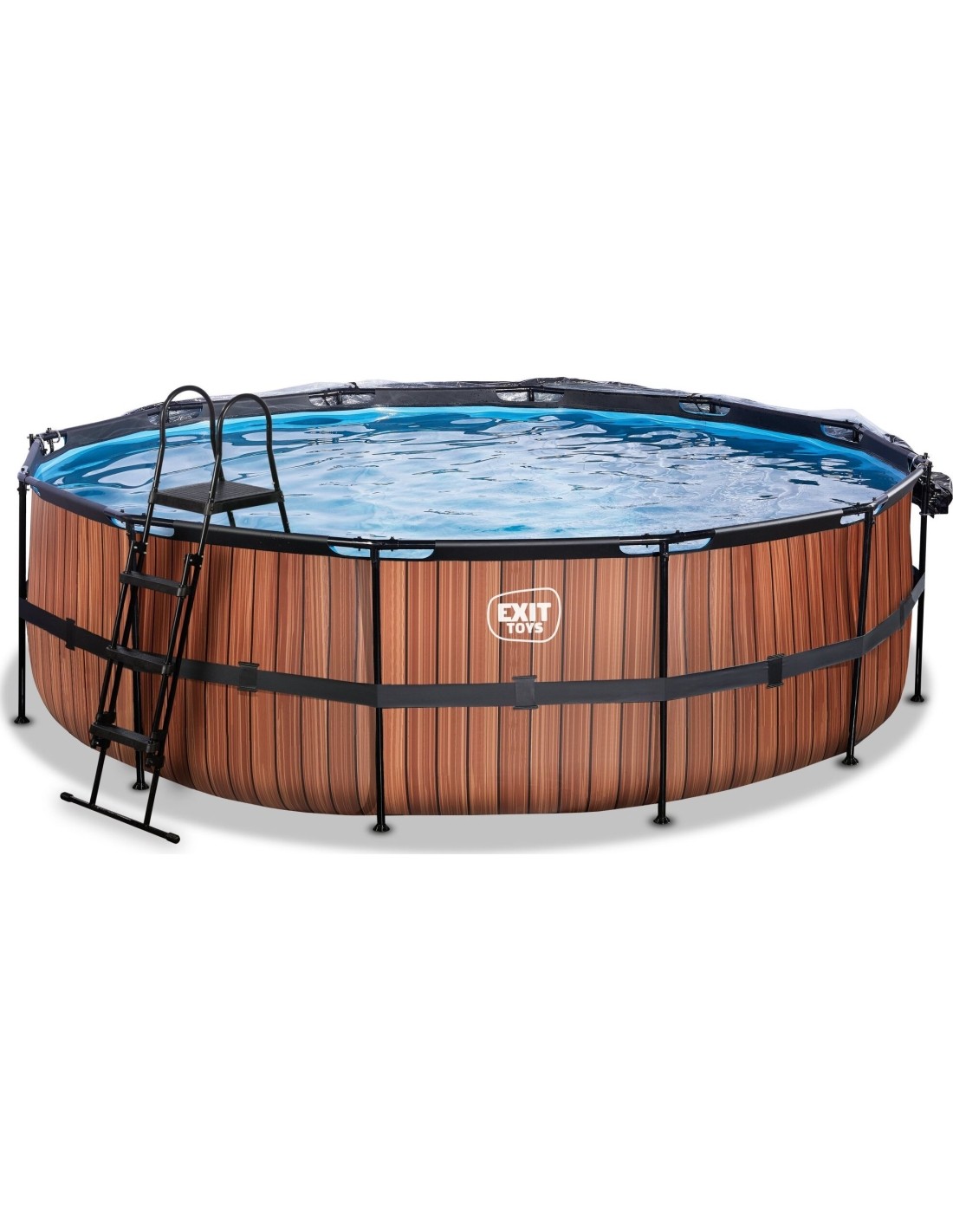 Basen EXIT Wood ø488 x 122 cm to okrągły basen ramowy z kopułą. Basen o drewnianym wyglądzie jest standardowo wyposażony w pompę z filtrem piaskowym, pompę ciepła oraz drabinkę basenową, dzięki której można bezpiecznie wejść i wyjść z basenu. Basen Wood ma nowoczesny i solidny wzór drewna na boku i tworzy wyróżniającą się cechę dla ogrodu. Wnętrze basenu jest niebieskie, aby stworzyć uczucie świeżości w basenie. Basen EXIT wyposażony jest w mocne 3-warstwowe ściany, wykonane z PVC i poliestru. Z kopułą EXIT do basenów nie jesteś już zależny od prognoz pogody. Kopuła utrzymuje brud z dala od wody, a także działa jako zrównoważone rozwiązanie do ogrzewania wody, ponieważ ciepło słoneczne jest utrzymywane pod kopułą. Kopuła jest łatwa do otwarcia dzięki unikalnemu mechanizmowi zawiasów, a ponieważ jest przezroczysta, można nadal mieć oko na to, co dzieje się poza basenem. Do basenu EXIT Wood dołączone są różne akcesoria. Na przykład pompa z filtrem piaskowym usuwa nawet najmniejsze cząsteczki z basenu, pompując wodę zaciekle przez złoże filtracyjne. Natomiast dołączona pompa ciepła stanowi prawdziwe dopełnienie basenu. Pompa ciepła łączy się z pompą filtra piaskowego i może ogrzać basen do 40 stopni. Odkryj, jak wytrzymały może być okrągły basen naziemny: Malowana proszkowo stalowa rama i solidne nogi basenu EXIT Wood zapewniają, że basen zawsze pozostaje stabilny i będzie służył przez lata.