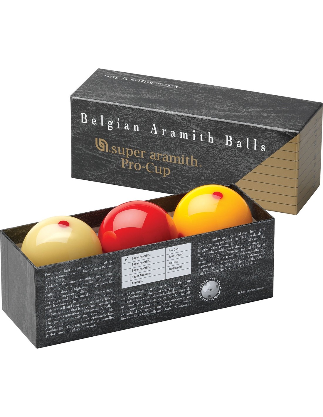 De Super Aramith Pro Cup set is gemaakt van geavanceerde fenolhars, met een volledig uitgebalanceerd zwaartepunt voor een perfect rolvermogen. Deze ballen zijn zodanig gecalibreerd dat een optimale kaats ontstaat, waarmee u optimale controle heeft over elke stoot. Aramith ballen zijn super impact bestendig, en behouden hun kleur, glans en gaafheid veel langer dan de gemiddelde polyester bal. Deze optimale structuur zorgt ervoor dat ook het laken veel langer in topconditie blijft! Een slimme investering dus. De Pro Cup ballen zijn voorzien van rode stippen waarmee de balrotatie uitstekend te volgen is.