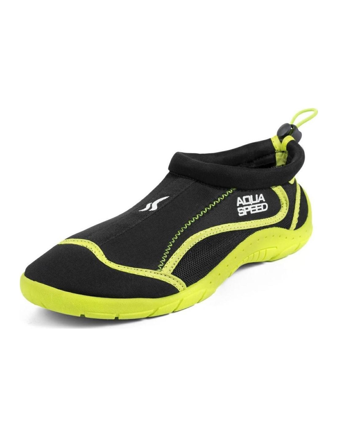 This vibrant aquashoe model from Aqua Speed is great for protecting your feet on the beach and in the sea (from sea urchin spikes, debris, sharp rocks) and for wearing while snorkeling, swimming, rafting, kayaking etc. On the heel it has an elastic strap with a stopper for perfect fit and hard sole with traction to reduce slipping (however you should thread wet and slippery surfaces with caution!). The upper part of the shoe has mesh fabric insetrs for breathability and drainage. Made of materials resilient to operation of salty water and sun. Warning: Aquashoe does not fully protect from slipping, it should not be used on wet, slippery poolsides and other slippery surfaces!