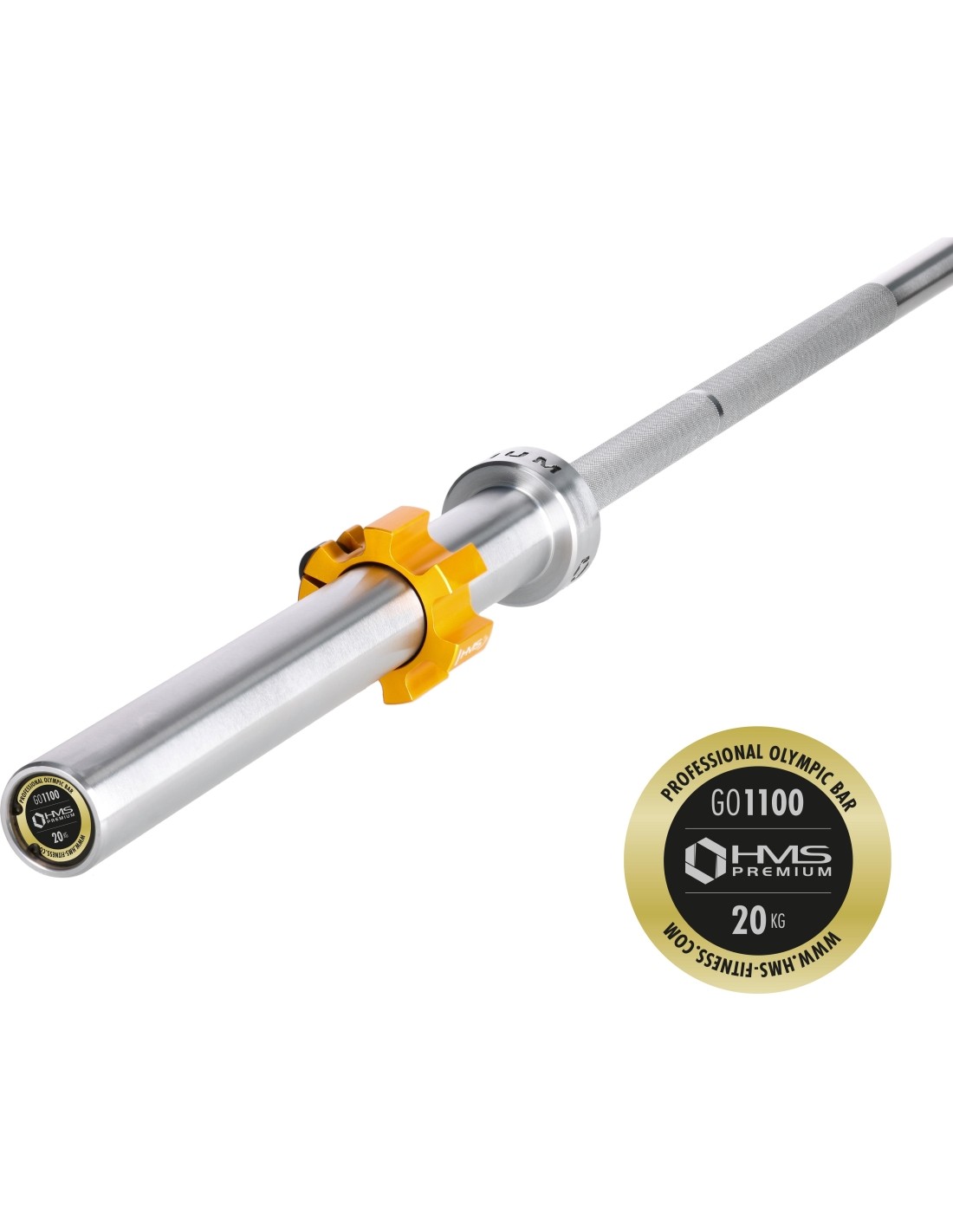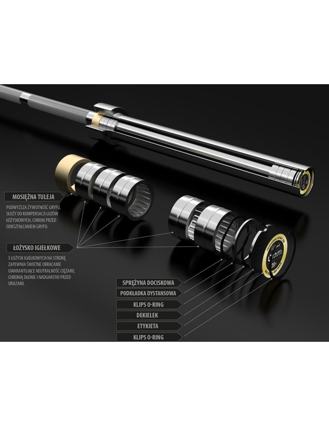 Gryf olimpijski GO1100 HMS posiada 10 łożysk igiełkowych (po 5 z każdej strony), dzięki czemu obrót obciążenia jest płynny i cichy. Jego konstrukcja eliminuje naprężenia na końcach cylindrów, dzięki czemu łożysko może być dłużej używane.