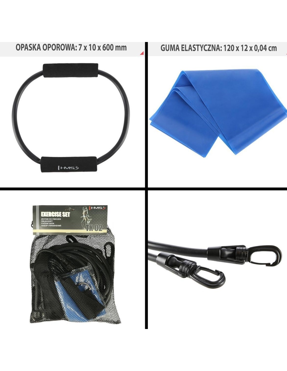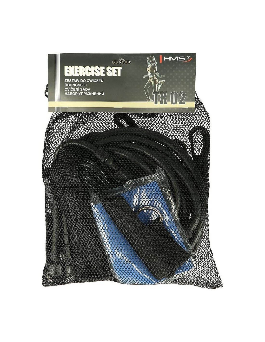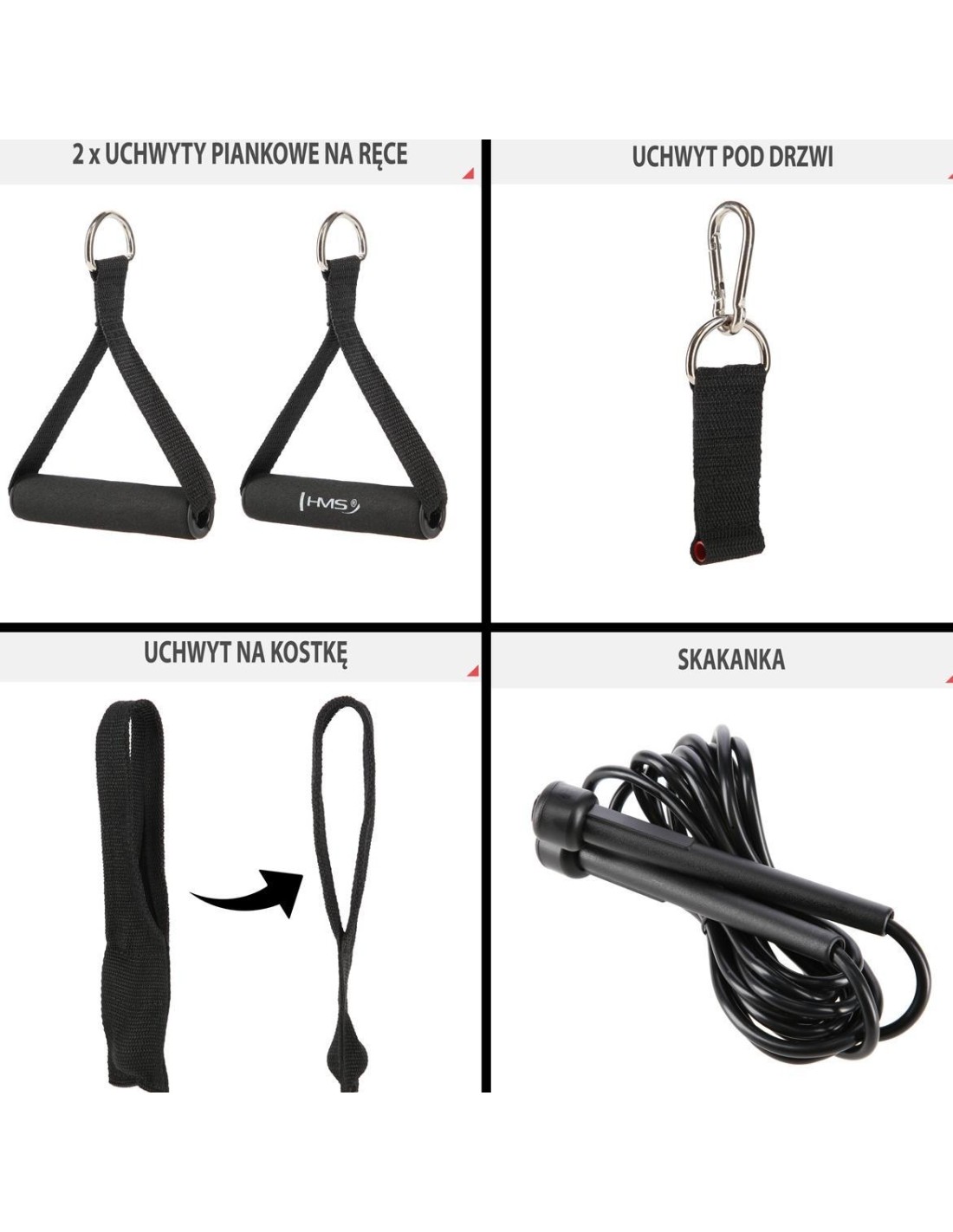 TX02 HMS - to zestaw do ćwiczeń. Produkt wykorzystuje masę ciała użytkownika do poprawienia jego sprawności i siły. Wysoka jakość, przemyślana konstrukcja i trwałość są gwarantem udanego treningu w każdych warunkach. W skład zestawu wchodzą cztery gumy oporowe, jedna guma elastyczna, jedna opaska oporowa, dwa piankowe uchwyty na ręce, jeden uchwyt na kostkę, jeden uchwyt pod drzwi oraz skakanka. Przyrząd to sposób na nowoczesny trening utrzymany w duchu CrossFitu. Poszczególna para linek ma inną sztywność co pozwala wybrać różną intensywność ćwiczeń oporowych. Na każdej z nich znajduje się uchwyt, który umożliwia realizację kompleksowego treningu siłowego wszystkich grup mięśni.