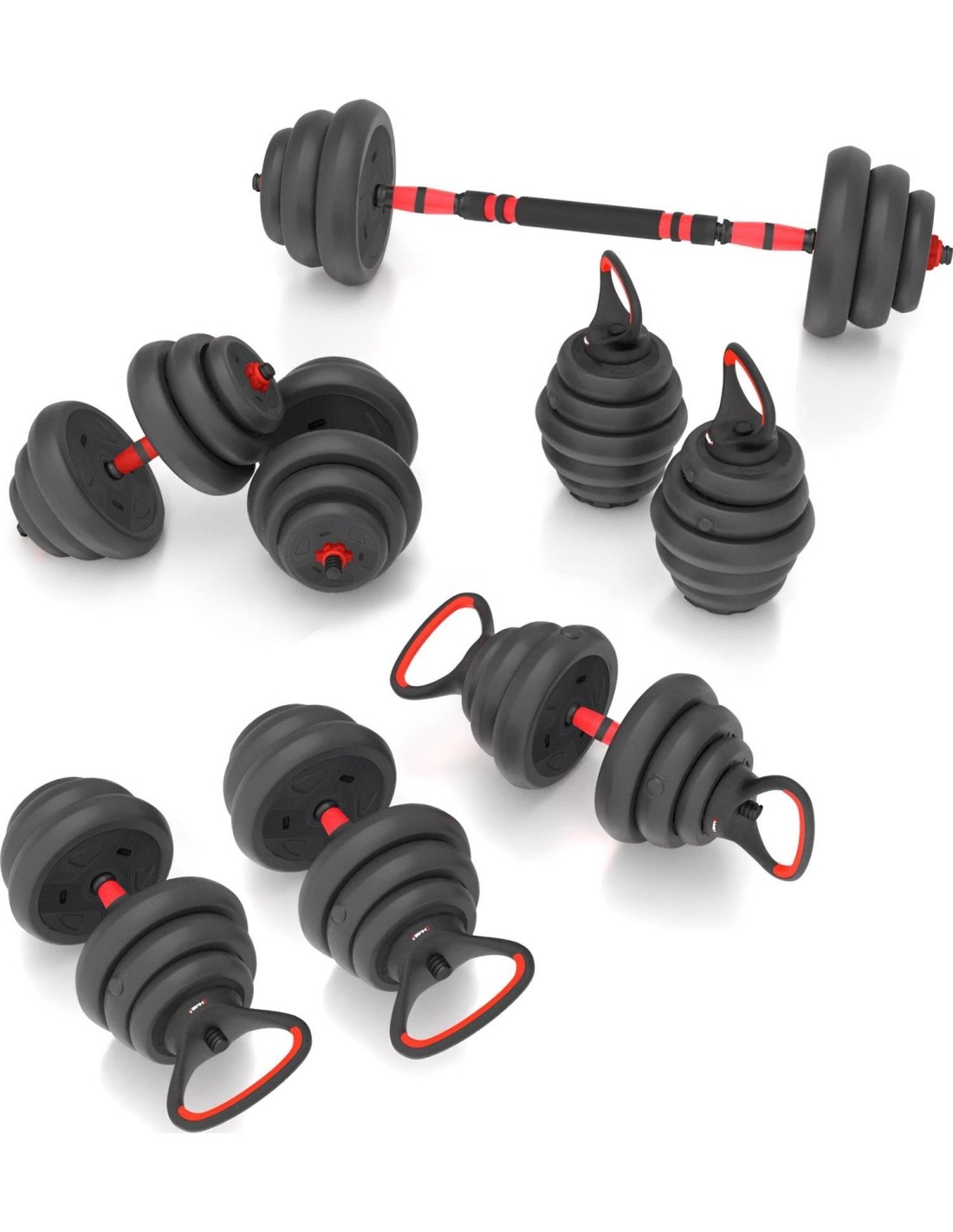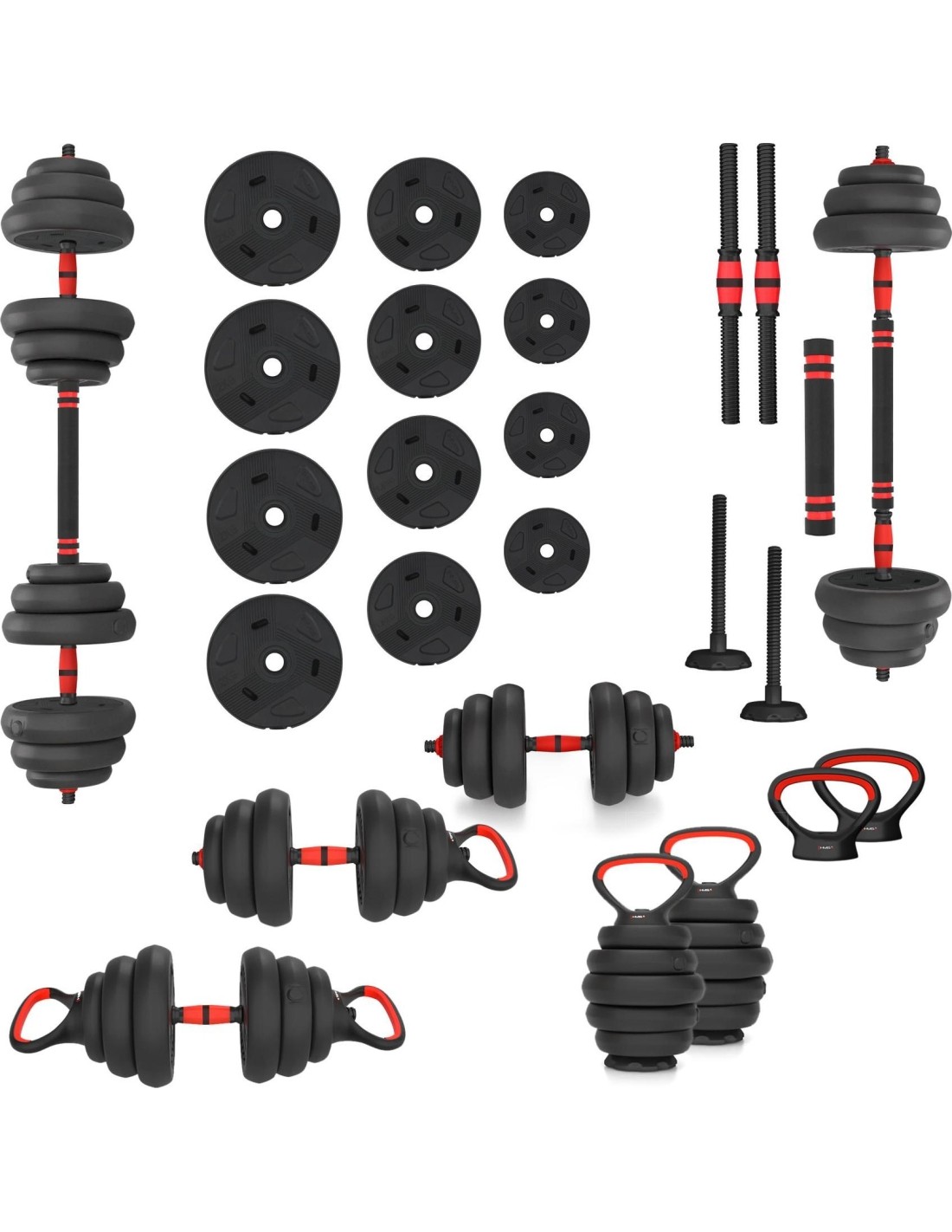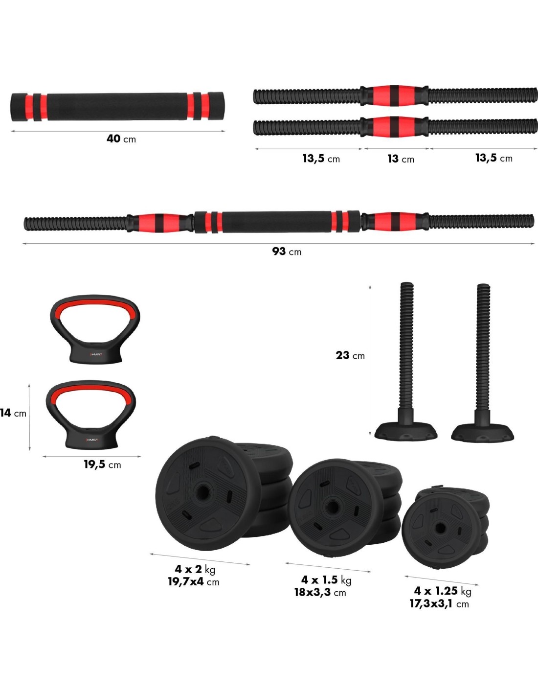 SGN120 PRO SET 6IN1 WEIGHT SET 20KG HMS SGN 6w1 is a revolutionary product from HMS that allows you to perform multiple strength exercises with one set of equipment. SGN 6w1 consists of twelve plates, two short griffins, one griffin extension, two handles and two kettlebell stands and clamps. You can use them to create the following instruments: Barbell: Connect two griffins together using the extension, adjust the load and enjoy your workout. The barbell allows you to perform multi-joint exercises such as squats, press-ups, deadlifts and tosses. These exercises engage multiple muscle groups at once and improve coordination, strength, endurance and muscle mass. With the SGN 6in1, you can extend your barbell, which allows you to customize it to your needs with a wider grip. A wider grip requires more stability and balance, which strengthens deep and postural muscles and improves posture. Two dumbbells: Mount the weights on both sides on the griffin and tighten the clamps decently. Two dumbbells are perfect for exercises such as biceps, triceps, shoulders, chest or back. Training with dumbbells is versatile, as it allows you to perform exercises for every part of the body and replicate all basic human movement patterns. You can exercise both strength and endurance. Two kettlebells: put the plates on a stand and screw the handle to the kettlebell. This set allows you to train with one kettlebell as well as two. Kettlebell is a type of weight that is used to perform many types of exercises, such as ballistic exercises that combine cardio, strength and flexibility training. Kettlebell exercises also improve cardiovascular fitness, coordination, stability and muscular endurance. Two double handle dumbbell: You can tighten the handle on one side to the dumbbell. You will then get something like a kettlebell, but its unusual shape allows you to perform special exercises. Such a solution will make it easier to perform a French press or a squat with a barbell. Dumbbell with a triple handle: Install handles on both sides of the dumbbell. A dumbbell with a triple handle allows you to have a secure grip on both sides and perform exercises such as - dumbbell press lying down, dumbbell raise sitting, dumbbell press standing or dumbbell raise in a trunk drop. Exercising with dumbbells with two handles on the sides can improve strength, endurance, coordination and muscle sculpture. Two push-up supports: Training on push-up supports is a great way to strengthen and shape your chest, shoulder and abdominal muscles. Push-up supports allow for a greater range of motion and reduce strain on your wrists. You can perform different types of push-ups by changing the position of the handles and the angle of your body. SGN 6in1 is an essential piece of equipment for your home gym. Exercise all your muscle parts with one set! Specification: Material: PVC + steel + cement Bar dimensions: Length: 40 cm Length of the gripping part: 13 cm Diameter: 28 mm Weight: 0.25 kg Connecting dimensions: Length: 40 cm Diameter: 45 mm Weight: 0.4kg Dimensions of handles (supports): Length: 19.5 cm Height: 14 cm Diameter: 25 mm Weight: 0.35 kg Dimensions of the kettlebell stand: Height: 21 cm Maximum kettlebell load: 20 kg Weight of the entire set: 20 kg Number of plates and plate dimensions: 1.25 kg - 17.3 x 3.1 cm (4 pcs.) 1.5 kg – 18 x 3.3 cm (4 pcs.) 2 kg – 19.7 x 4 cm (4 pcs.) Remarks: Not for commercial use 24 months warranty