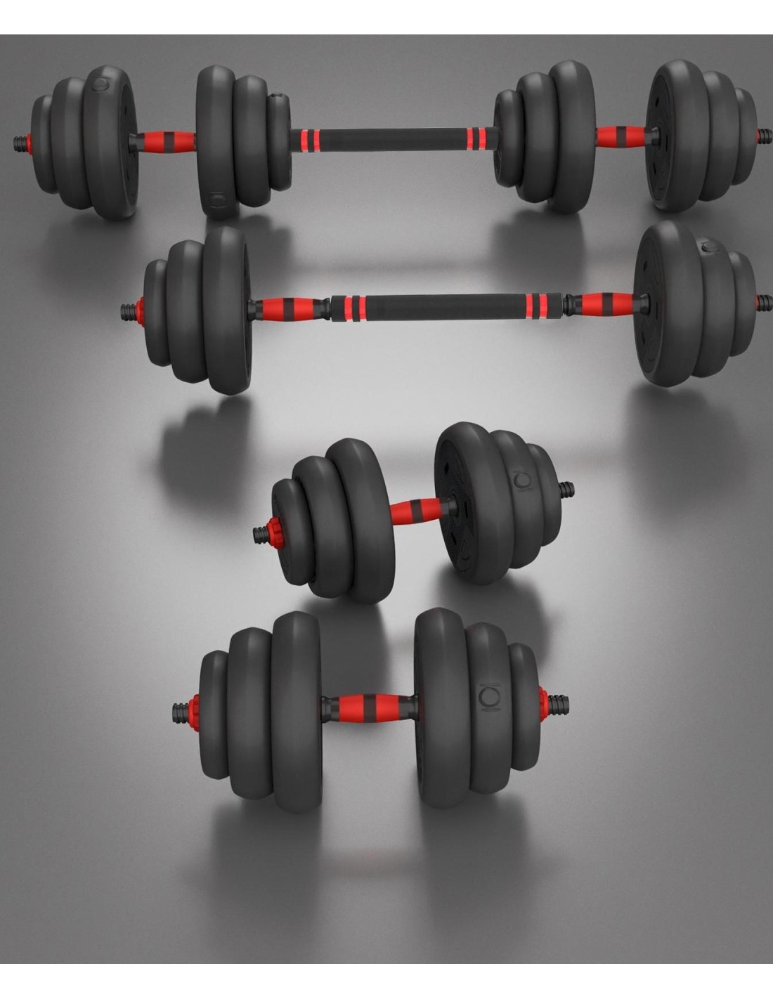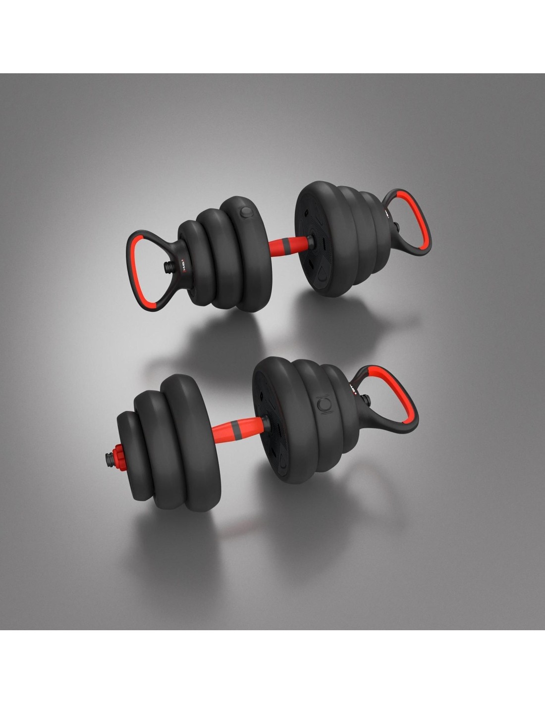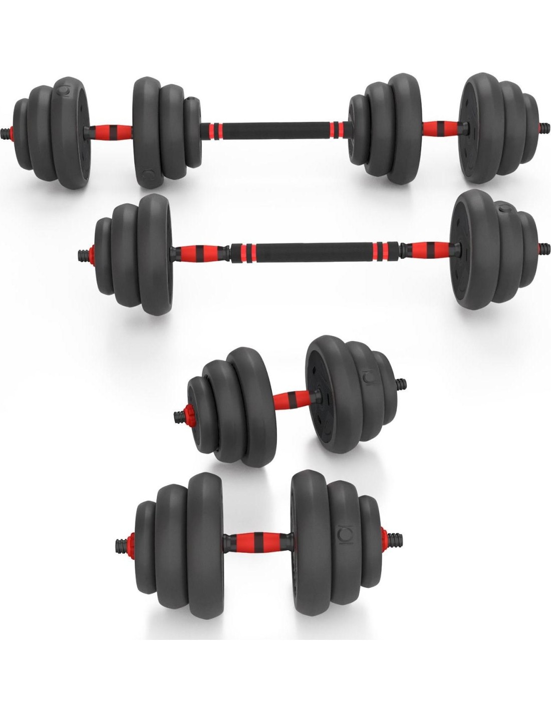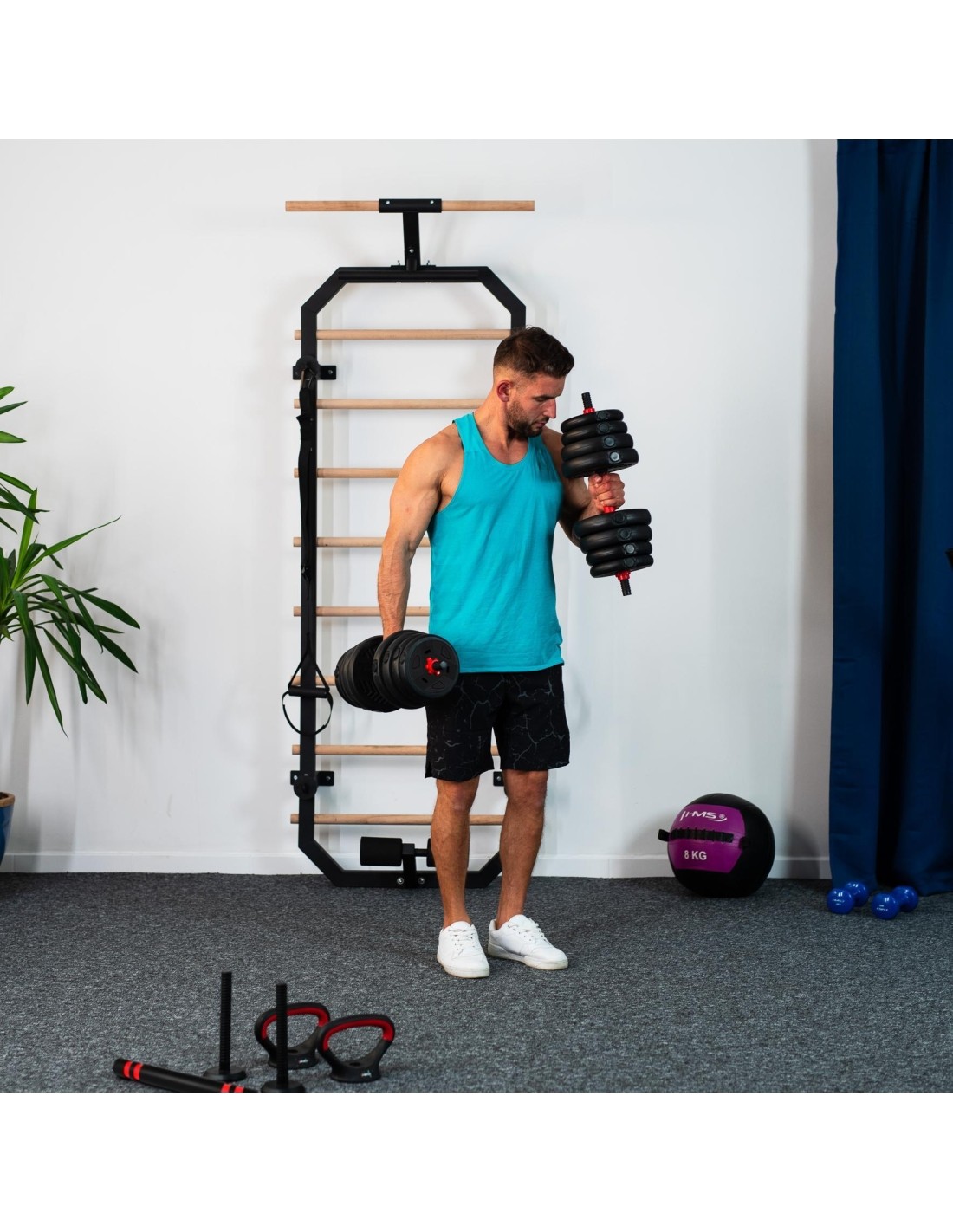 SGN120 PRO SET 6IN1 WEIGHT SET 20KG HMS SGN 6w1 is a revolutionary product from HMS that allows you to perform multiple strength exercises with one set of equipment. SGN 6w1 consists of twelve plates, two short griffins, one griffin extension, two handles and two kettlebell stands and clamps. You can use them to create the following instruments: Barbell: Connect two griffins together using the extension, adjust the load and enjoy your workout. The barbell allows you to perform multi-joint exercises such as squats, press-ups, deadlifts and tosses. These exercises engage multiple muscle groups at once and improve coordination, strength, endurance and muscle mass. With the SGN 6in1, you can extend your barbell, which allows you to customize it to your needs with a wider grip. A wider grip requires more stability and balance, which strengthens deep and postural muscles and improves posture. Two dumbbells: Mount the weights on both sides on the griffin and tighten the clamps decently. Two dumbbells are perfect for exercises such as biceps, triceps, shoulders, chest or back. Training with dumbbells is versatile, as it allows you to perform exercises for every part of the body and replicate all basic human movement patterns. You can exercise both strength and endurance. Two kettlebells: put the plates on a stand and screw the handle to the kettlebell. This set allows you to train with one kettlebell as well as two. Kettlebell is a type of weight that is used to perform many types of exercises, such as ballistic exercises that combine cardio, strength and flexibility training. Kettlebell exercises also improve cardiovascular fitness, coordination, stability and muscular endurance. Two double handle dumbbell: You can tighten the handle on one side to the dumbbell. You will then get something like a kettlebell, but its unusual shape allows you to perform special exercises. Such a solution will make it easier to perform a French press or a squat with a barbell. Dumbbell with a triple handle: Install handles on both sides of the dumbbell. A dumbbell with a triple handle allows you to have a secure grip on both sides and perform exercises such as - dumbbell press lying down, dumbbell raise sitting, dumbbell press standing or dumbbell raise in a trunk drop. Exercising with dumbbells with two handles on the sides can improve strength, endurance, coordination and muscle sculpture. Two push-up supports: Training on push-up supports is a great way to strengthen and shape your chest, shoulder and abdominal muscles. Push-up supports allow for a greater range of motion and reduce strain on your wrists. You can perform different types of push-ups by changing the position of the handles and the angle of your body. SGN 6in1 is an essential piece of equipment for your home gym. Exercise all your muscle parts with one set! Specification: Material: PVC + steel + cement Bar dimensions: Length: 40 cm Length of the gripping part: 13 cm Diameter: 28 mm Weight: 0.25 kg Connecting dimensions: Length: 40 cm Diameter: 45 mm Weight: 0.4kg Dimensions of handles (supports): Length: 19.5 cm Height: 14 cm Diameter: 25 mm Weight: 0.35 kg Dimensions of the kettlebell stand: Height: 21 cm Maximum kettlebell load: 20 kg Weight of the entire set: 20 kg Number of plates and plate dimensions: 1.25 kg - 17.3 x 3.1 cm (4 pcs.) 1.5 kg – 18 x 3.3 cm (4 pcs.) 2 kg – 19.7 x 4 cm (4 pcs.) Remarks: Not for commercial use 24 months warranty