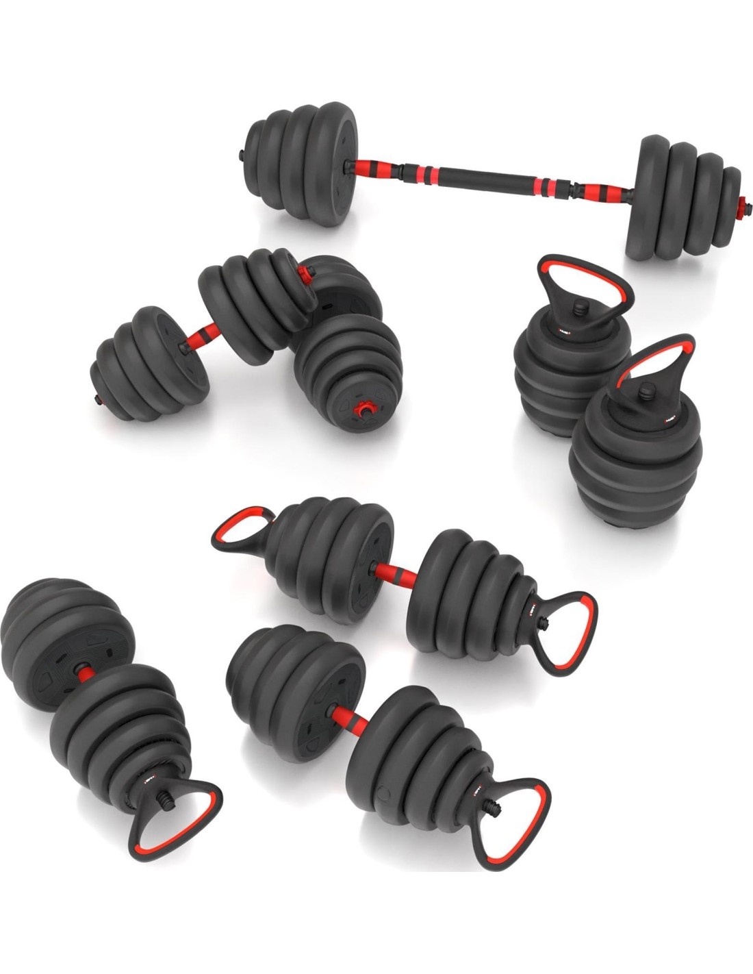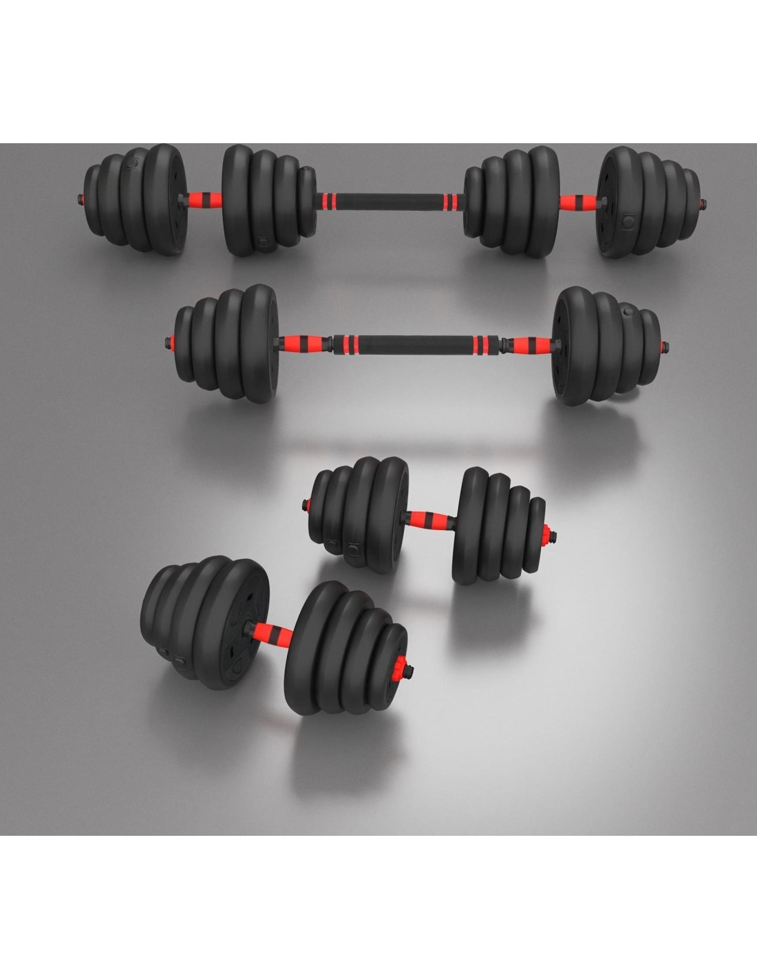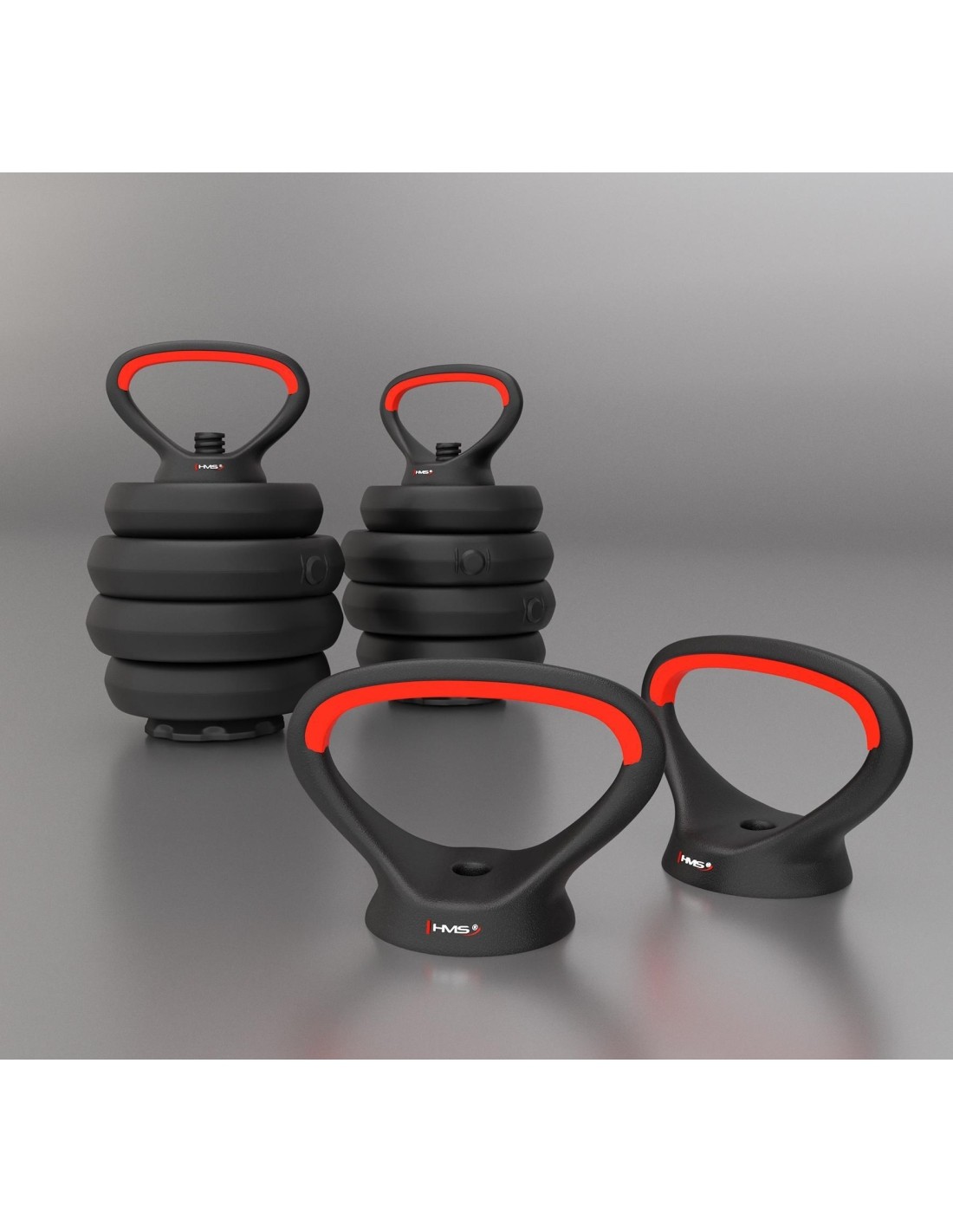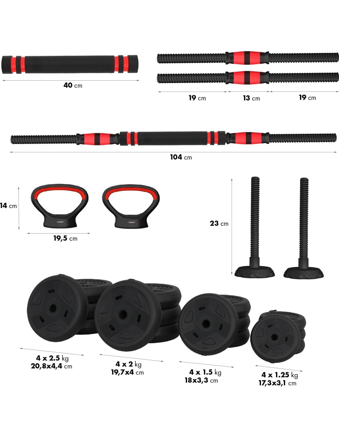 SGN130 PRO SET 6IN1 WEIGHT SET 30KG HMS SGN 6w1 is a revolutionary product from HMS that allows you to perform multiple strength exercises with one set of equipment. SGN 6w1 consists of sixteen plates, two short griffins, one griffin extension, two handles and two kettlebell stands and clamps. You can use them to create the following instruments: Barbell: Connect two griffins together using the extension, adjust the load and enjoy your workout. The barbell allows you to perform multi-joint exercises such as squats, press-ups, deadlifts and tosses. These exercises engage multiple muscle groups at once and improve coordination, strength, endurance and muscle mass. With the SGN 6in1, you can extend your barbell, which allows you to customize it to your needs with a wider grip. A wider grip requires more stability and balance, which strengthens deep and postural muscles and improves posture. Two dumbbells: Mount the weights on both sides on the griffin and tighten the clamps decently. Two dumbbells are perfect for exercises such as biceps, triceps, shoulders, chest or back. Training with dumbbells is versatile, as it allows you to perform exercises for every part of the body and replicate all basic human movement patterns. You can exercise both strength and endurance. Two kettlebells: put the plates on a stand and screw the handle to the kettlebell. This set allows you to train with one kettlebell as well as two. Kettlebell is a type of weight that is used to perform many types of exercises, such as ballistic exercises that combine cardio, strength and flexibility training. Kettlebell exercises also improve cardiovascular fitness, coordination, stability and muscular endurance. Two double handle dumbbell: You can tighten the handle on one side to the dumbbell. You will then get something like a kettlebell, but its unusual shape allows you to perform special exercises. Such a solution will make it easier to perform a French press or a squat with a barbell. Dumbbell with a triple handle: Install handles on both sides of the dumbbell. A dumbbell with a triple handle allows you to have a secure grip on both sides and perform exercises such as - dumbbell press lying down, dumbbell raise sitting, dumbbell press standing or dumbbell raise in a trunk drop. Exercising with dumbbells with two handles on the sides can improve strength, endurance, coordination and muscle sculpture. Two push-up supports: Training on push-up supports is a great way to strengthen and shape your chest, shoulder and abdominal muscles. Push-up supports allow for a greater range of motion and reduce strain on your wrists. You can perform different types of push-ups by changing the position of the handles and the angle of your body. SGN 6in1 is an essential piece of equipment for your home gym. Exercise all your muscle parts with one set! Specification: Material: PVC + steel + cement Bar dimensions: Length: 51 cm Length of the gripping part: 13 cm Diameter: 28 mm Weight: 0.25 kg Connecting dimensions: Length: 40 cm Diameter: 45 mm Weight: 0.4kg Dimensions of handles (supports): Length: 19.5 cm Height: 14 cm Diameter: 25 mm Weight: 0.35 kg Dimensions of the kettlebell stand: Height: 21 cm Maximum kettlebell load: 20 kg Weight of the entire set: 30 kg Number of plates and plate dimensions: 1.25 kg - 17.3 x 3.1 cm (4 pcs.) 1.5 kg – 18 x 3.3 cm (4 pcs.) 2 kg – 19.7 x 4 cm (4 pcs.) 2.5 kg - 20.8 x 4.4 cm Remarks: Not for commercial use 24 months warranty