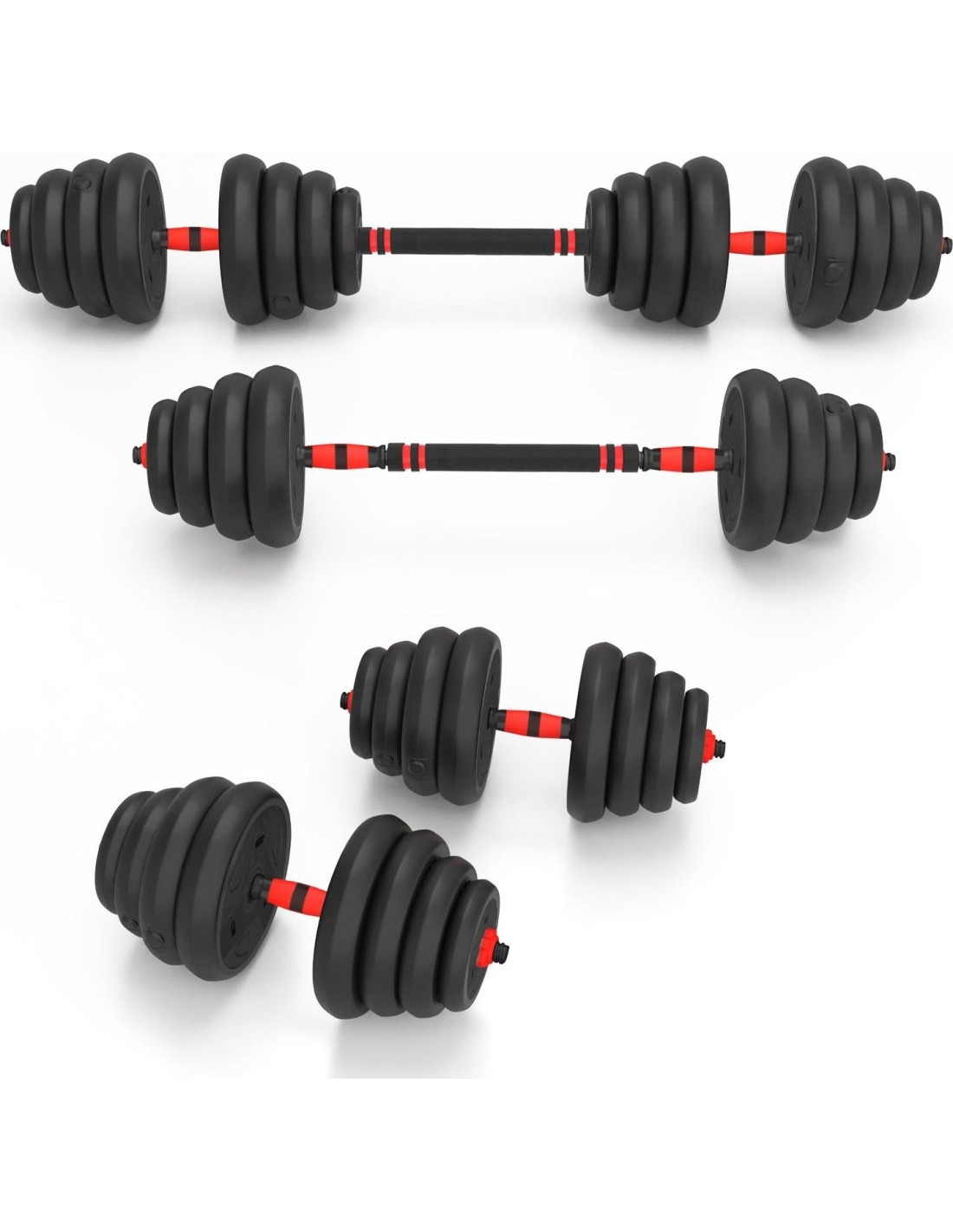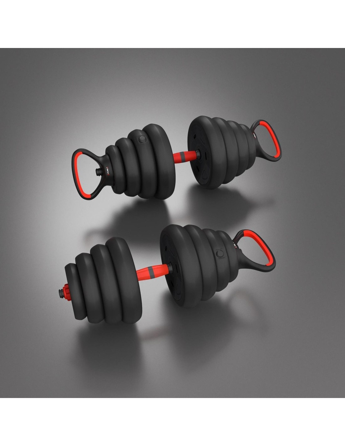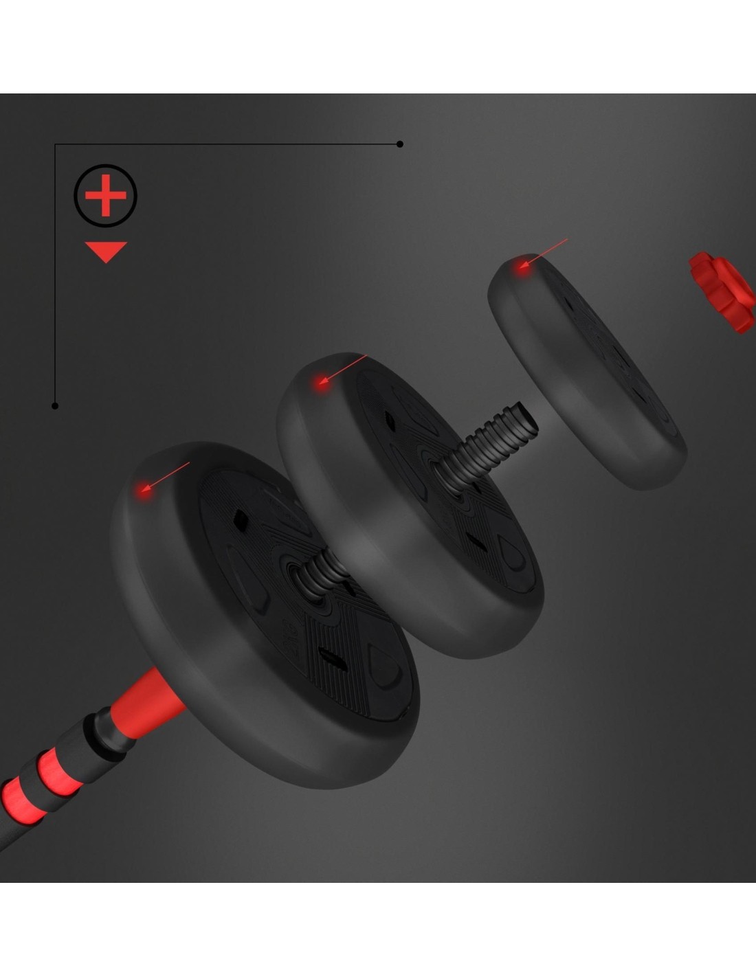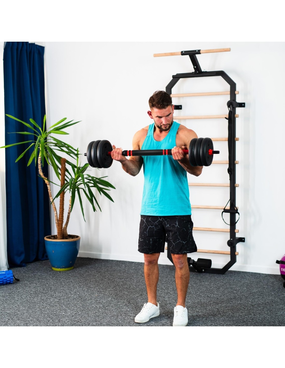 SGN130 PRO SET 6IN1 WEIGHT SET 30KG HMS SGN 6w1 is a revolutionary product from HMS that allows you to perform multiple strength exercises with one set of equipment. SGN 6w1 consists of sixteen plates, two short griffins, one griffin extension, two handles and two kettlebell stands and clamps. You can use them to create the following instruments: Barbell: Connect two griffins together using the extension, adjust the load and enjoy your workout. The barbell allows you to perform multi-joint exercises such as squats, press-ups, deadlifts and tosses. These exercises engage multiple muscle groups at once and improve coordination, strength, endurance and muscle mass. With the SGN 6in1, you can extend your barbell, which allows you to customize it to your needs with a wider grip. A wider grip requires more stability and balance, which strengthens deep and postural muscles and improves posture. Two dumbbells: Mount the weights on both sides on the griffin and tighten the clamps decently. Two dumbbells are perfect for exercises such as biceps, triceps, shoulders, chest or back. Training with dumbbells is versatile, as it allows you to perform exercises for every part of the body and replicate all basic human movement patterns. You can exercise both strength and endurance. Two kettlebells: put the plates on a stand and screw the handle to the kettlebell. This set allows you to train with one kettlebell as well as two. Kettlebell is a type of weight that is used to perform many types of exercises, such as ballistic exercises that combine cardio, strength and flexibility training. Kettlebell exercises also improve cardiovascular fitness, coordination, stability and muscular endurance. Two double handle dumbbell: You can tighten the handle on one side to the dumbbell. You will then get something like a kettlebell, but its unusual shape allows you to perform special exercises. Such a solution will make it easier to perform a French press or a squat with a barbell. Dumbbell with a triple handle: Install handles on both sides of the dumbbell. A dumbbell with a triple handle allows you to have a secure grip on both sides and perform exercises such as - dumbbell press lying down, dumbbell raise sitting, dumbbell press standing or dumbbell raise in a trunk drop. Exercising with dumbbells with two handles on the sides can improve strength, endurance, coordination and muscle sculpture. Two push-up supports: Training on push-up supports is a great way to strengthen and shape your chest, shoulder and abdominal muscles. Push-up supports allow for a greater range of motion and reduce strain on your wrists. You can perform different types of push-ups by changing the position of the handles and the angle of your body. SGN 6in1 is an essential piece of equipment for your home gym. Exercise all your muscle parts with one set! Specification: Material: PVC + steel + cement Bar dimensions: Length: 51 cm Length of the gripping part: 13 cm Diameter: 28 mm Weight: 0.25 kg Connecting dimensions: Length: 40 cm Diameter: 45 mm Weight: 0.4kg Dimensions of handles (supports): Length: 19.5 cm Height: 14 cm Diameter: 25 mm Weight: 0.35 kg Dimensions of the kettlebell stand: Height: 21 cm Maximum kettlebell load: 20 kg Weight of the entire set: 30 kg Number of plates and plate dimensions: 1.25 kg - 17.3 x 3.1 cm (4 pcs.) 1.5 kg – 18 x 3.3 cm (4 pcs.) 2 kg – 19.7 x 4 cm (4 pcs.) 2.5 kg - 20.8 x 4.4 cm Remarks: Not for commercial use 24 months warranty