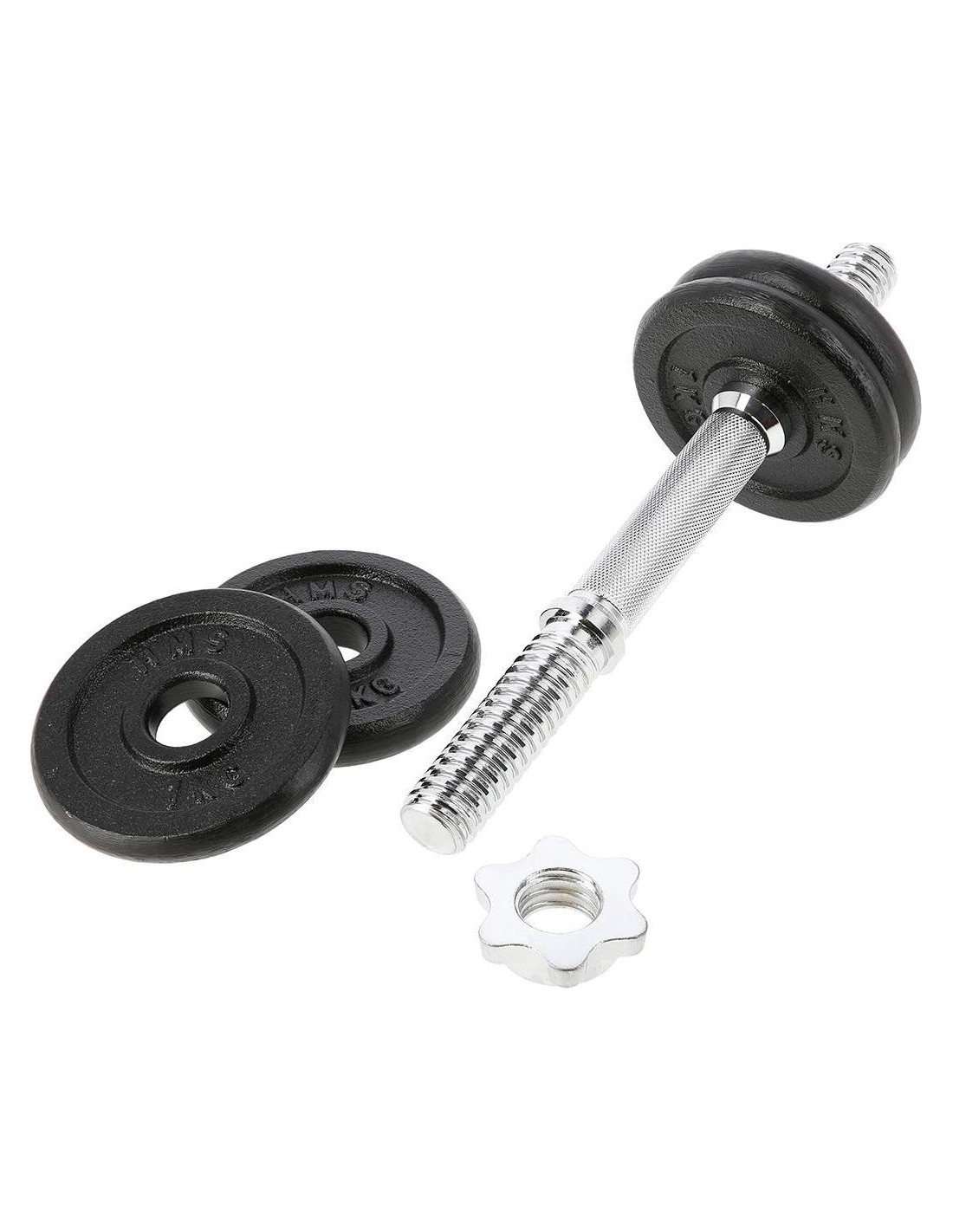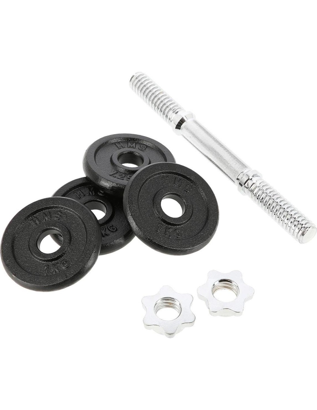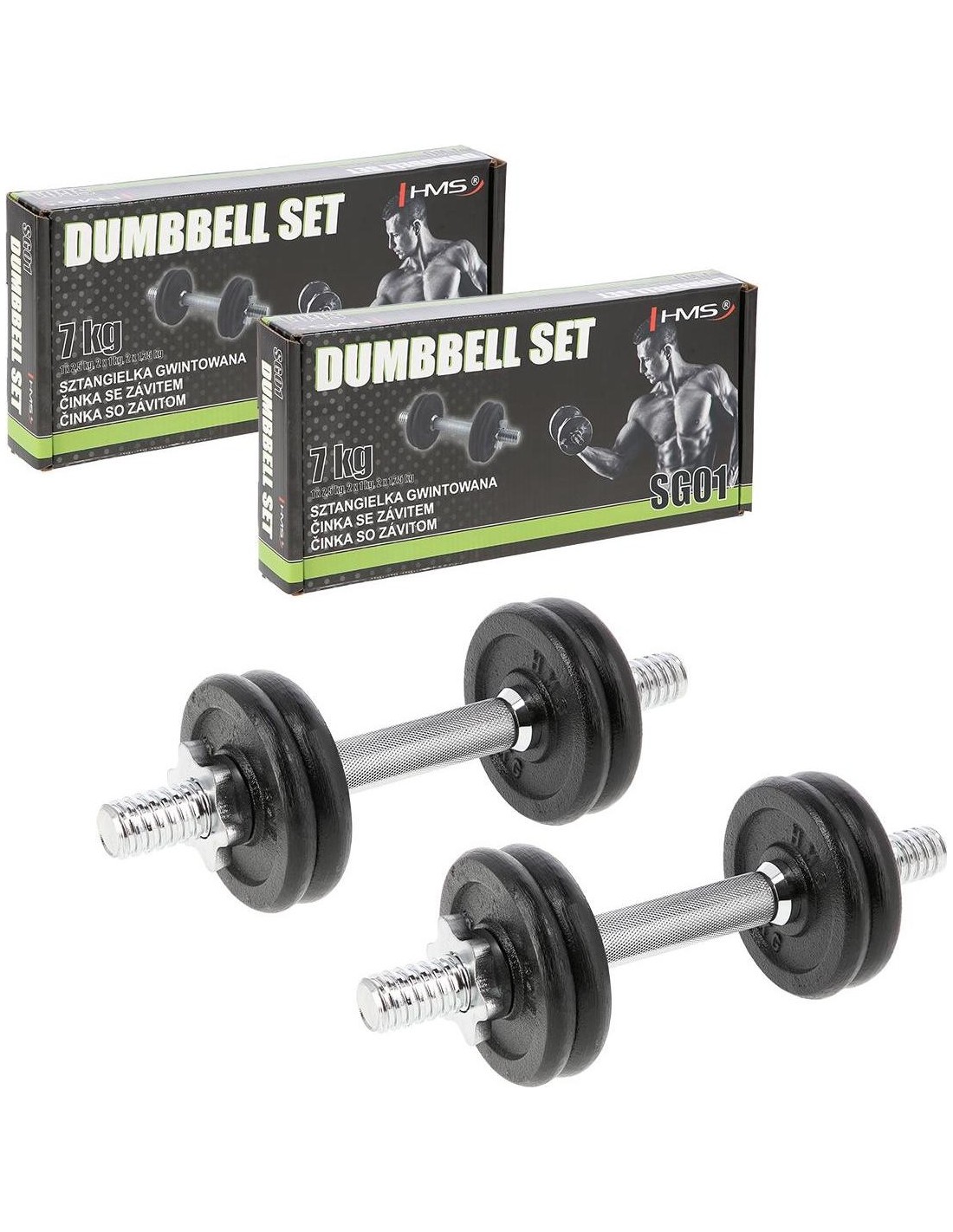 SG02 CAST IRON DUMBBELLS 2x7KG HMS, a classic and an essential for every home gym. The set includes: 2x straight grips, 4x 1kg plates, 4x 1.25kg plates and 4x star clamps. The first component is made of nickel-plated steel. The plates, on the other hand, are cast iron. The griffin has a grooved grip, so that it does not slip during exercise. The threaded barbells, combined with the clamps, guarantee even pressure on the weights. The product is suitable for both advanced and beginner users. Start taking care of your fitness today with the professional barbells with a total weight of 14 kg. This is ideal for training at home and in the gym. Specification: Length of the barbell: 35 cm Diameter of the neck: 30 mm 2x straight 2kg barbell 4x 0.25 kg clamp 4x 1kg plate 4x discs 1,25kg Disc bore diameter: 31.5mm Weight of set: 14kg Remarks: 24 months warranty