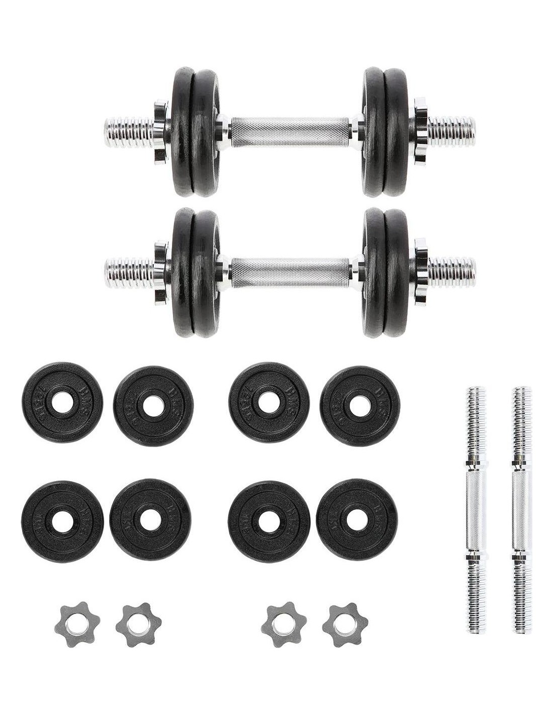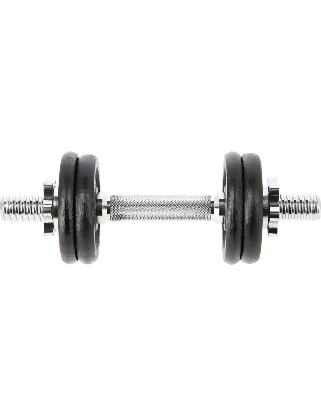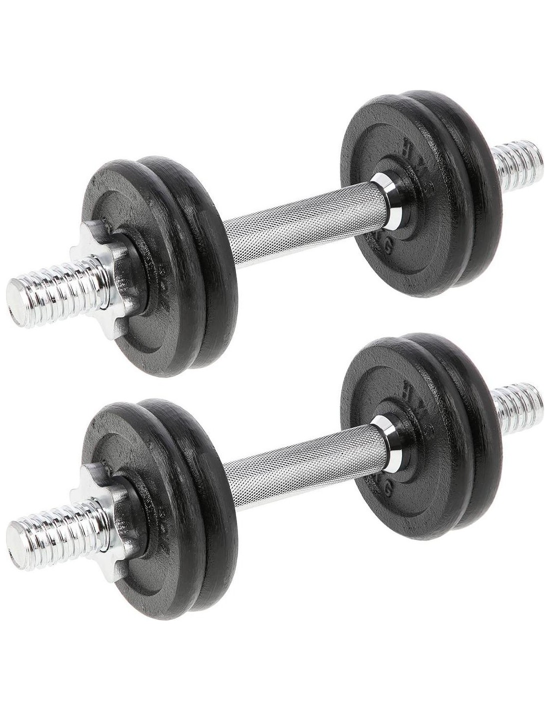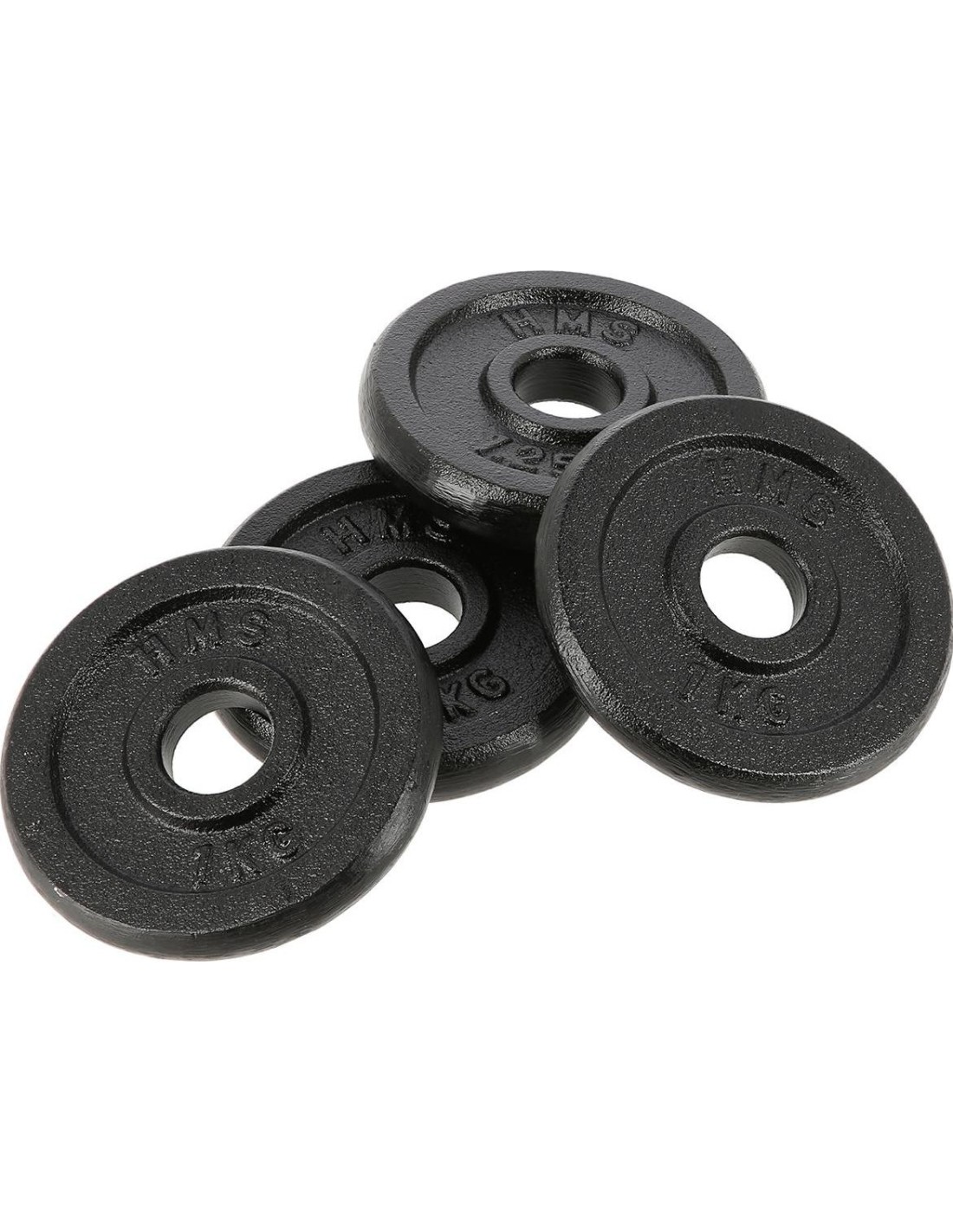 SG02 CAST IRON DUMBBELLS 2x7KG HMS, a classic and an essential for every home gym. The set includes: 2x straight grips, 4x 1kg plates, 4x 1.25kg plates and 4x star clamps. The first component is made of nickel-plated steel. The plates, on the other hand, are cast iron. The griffin has a grooved grip, so that it does not slip during exercise. The threaded barbells, combined with the clamps, guarantee even pressure on the weights. The product is suitable for both advanced and beginner users. Start taking care of your fitness today with the professional barbells with a total weight of 14 kg. This is ideal for training at home and in the gym. Specification: Length of the barbell: 35 cm Diameter of the neck: 30 mm 2x straight 2kg barbell 4x 0.25 kg clamp 4x 1kg plate 4x discs 1,25kg Disc bore diameter: 31.5mm Weight of set: 14kg Remarks: 24 months warranty