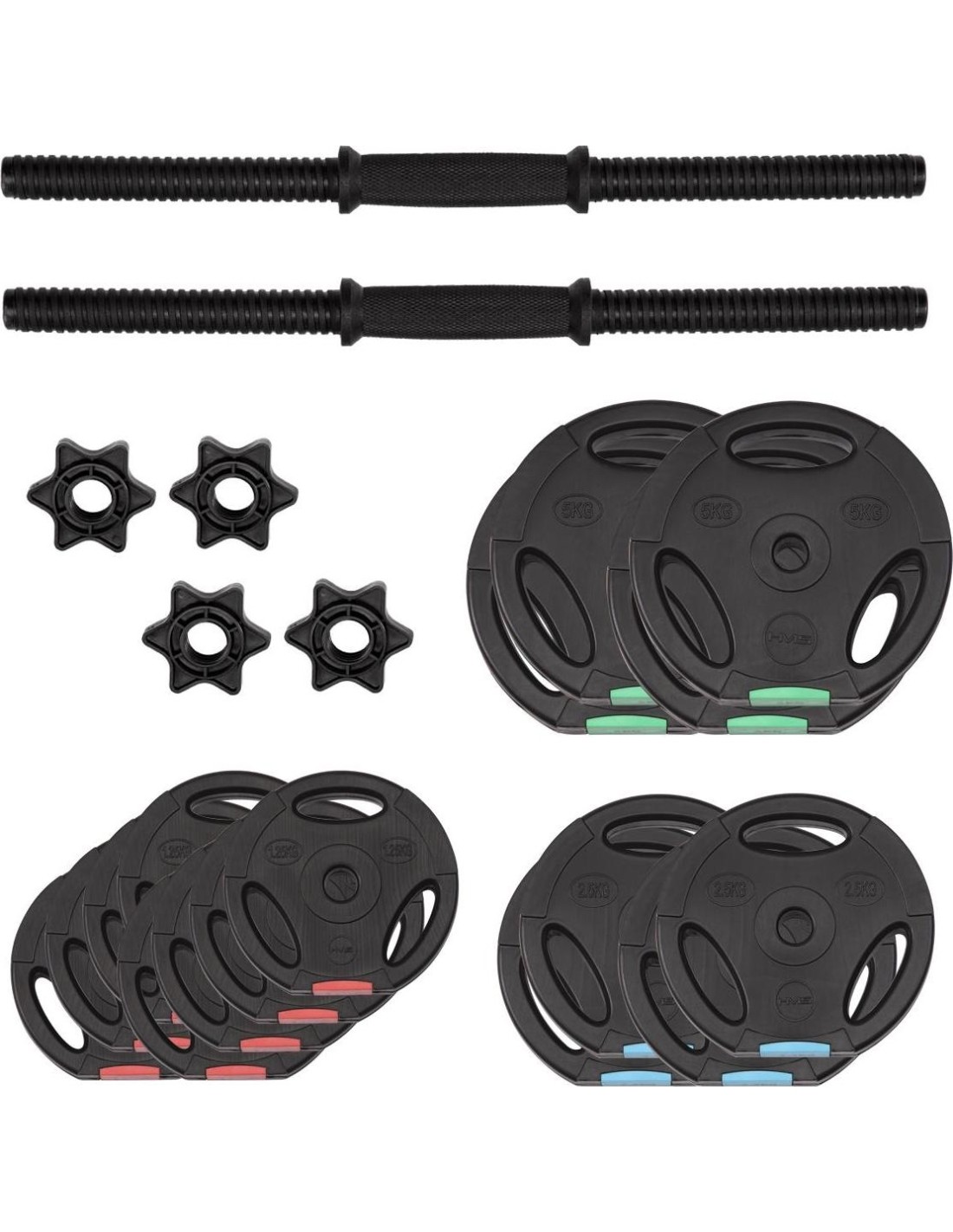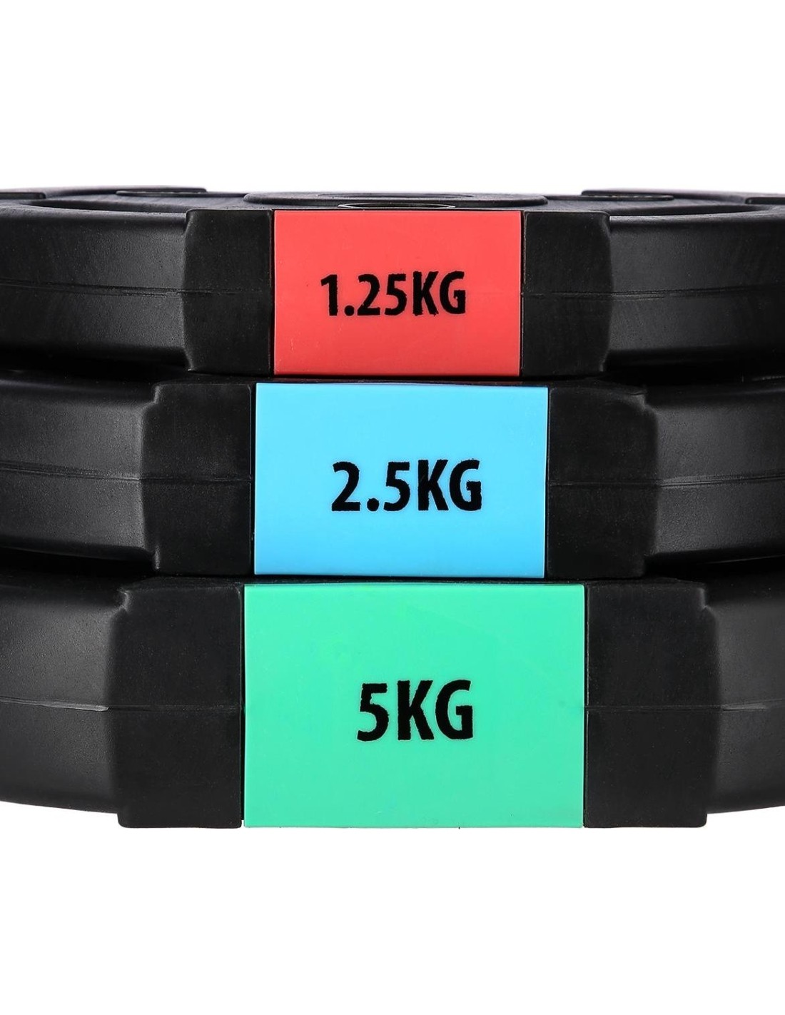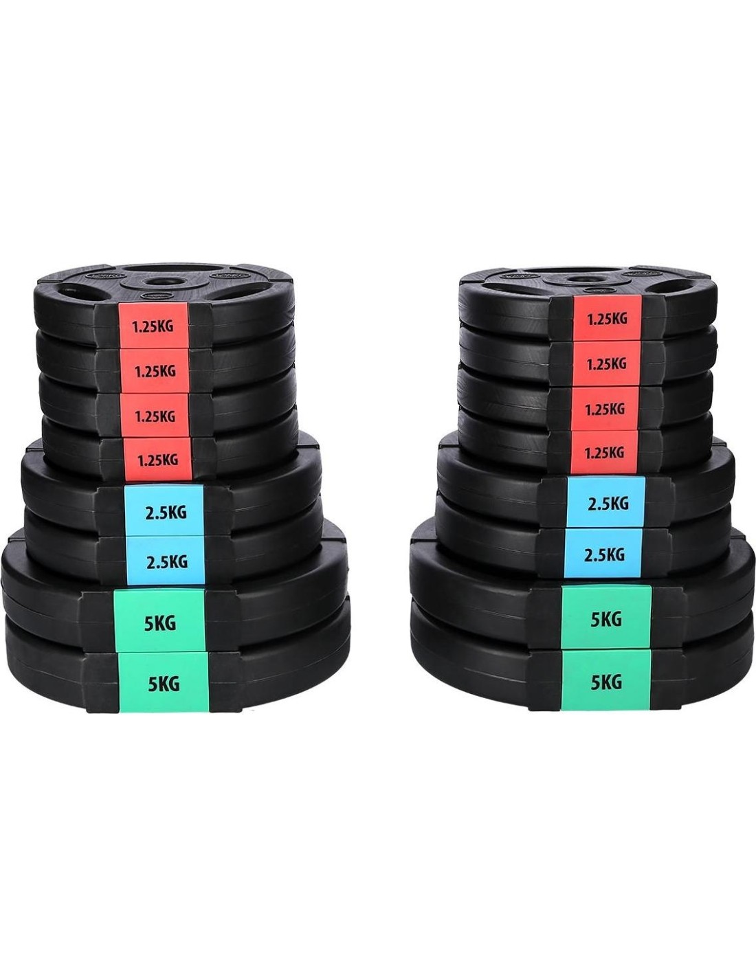 - Liczba obciążeń w zestawie: 8x 1,25 kg / 4x 2,5 kg / 4x 5 kg .
