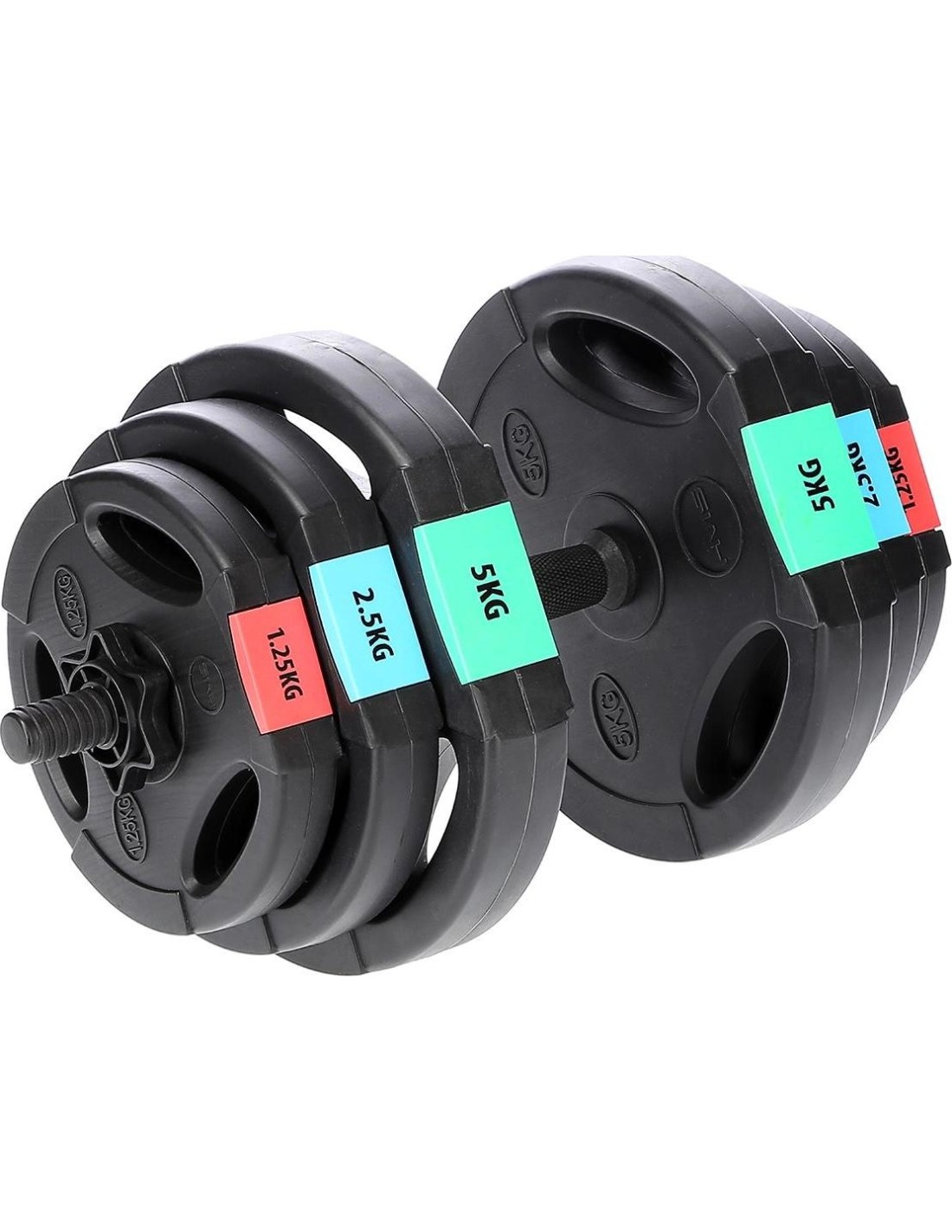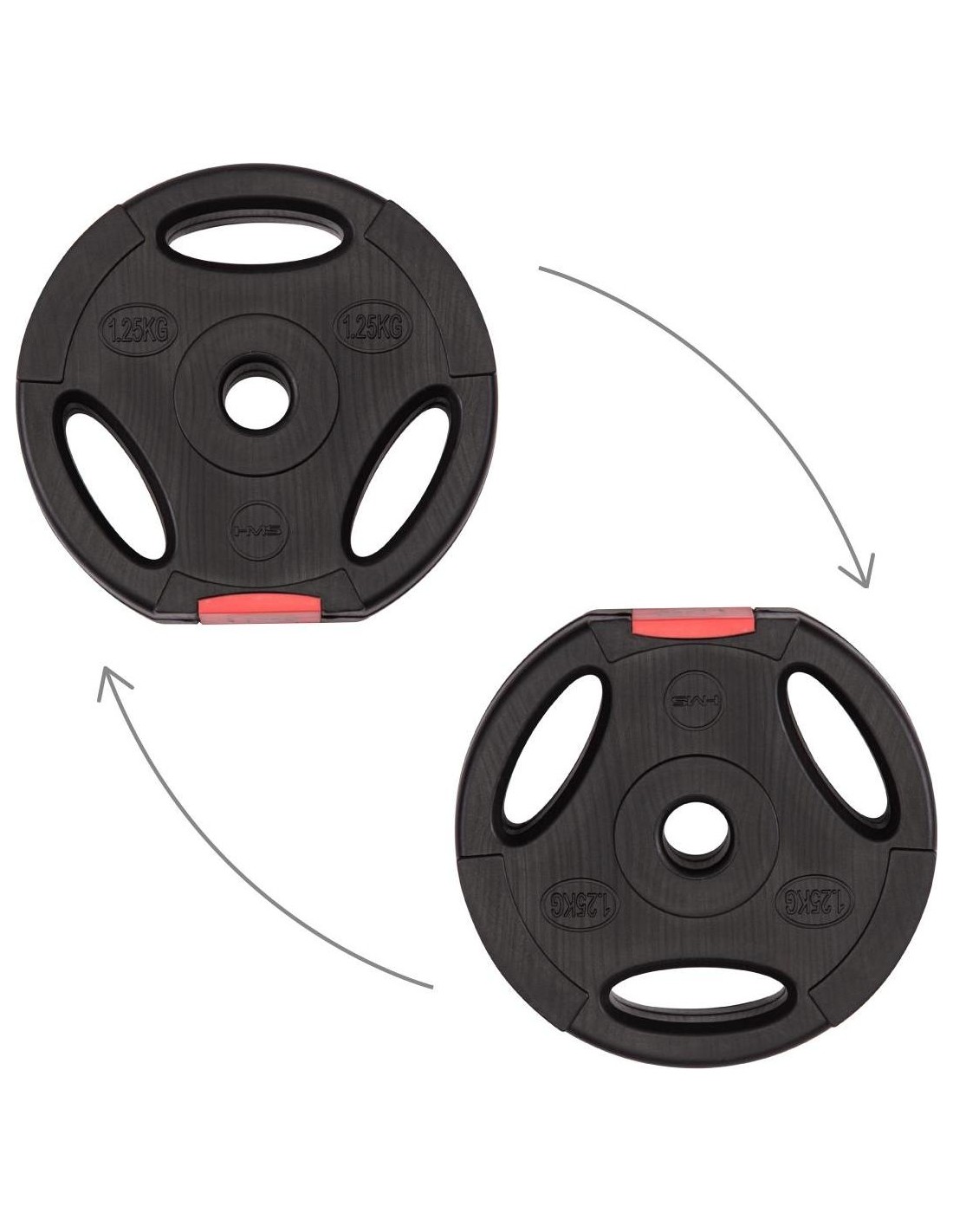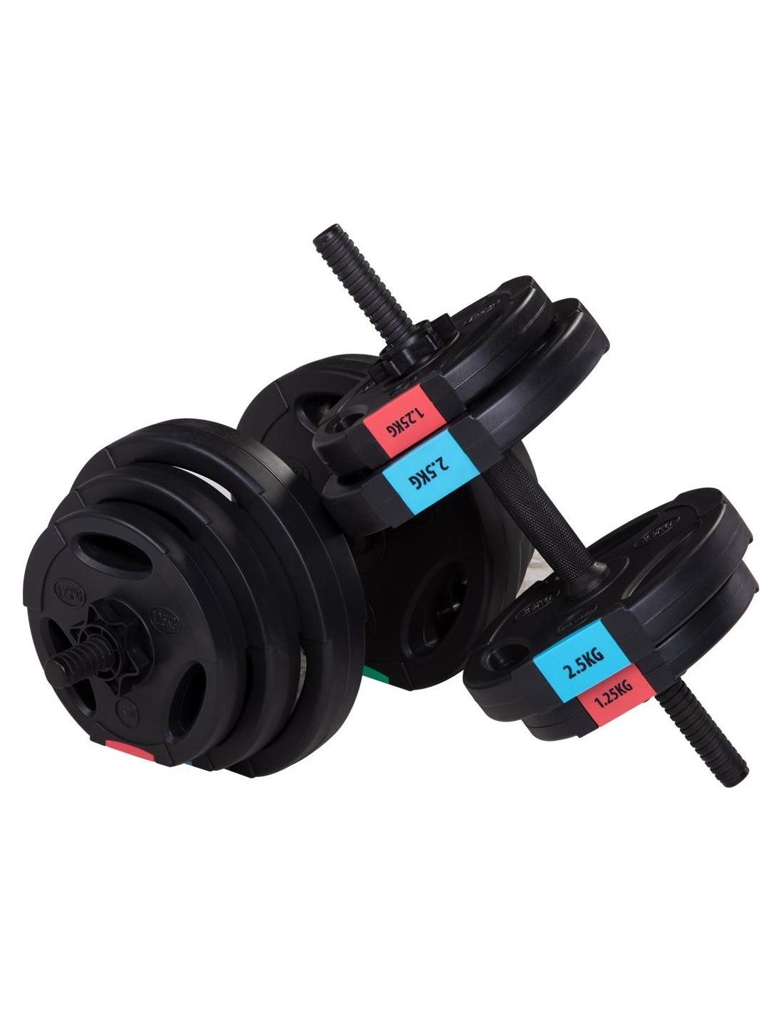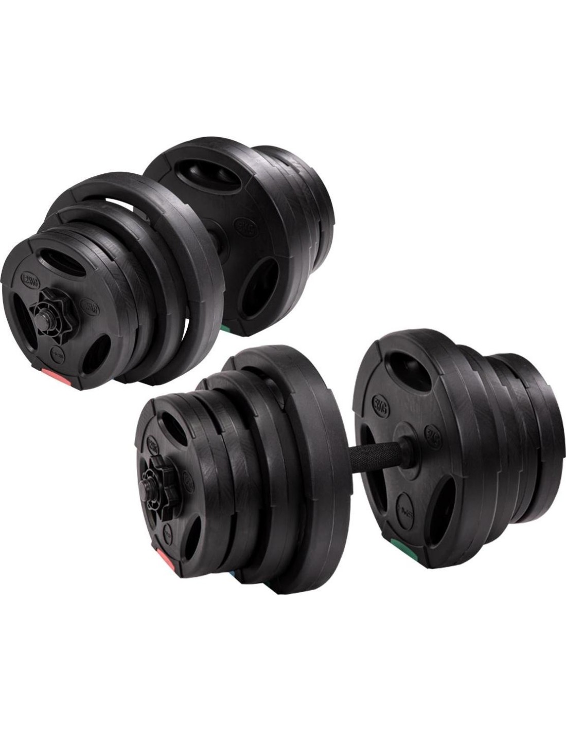 - Liczba obciążeń w zestawie: 8x 1,25 kg / 4x 2,5 kg / 4x 5 kg .