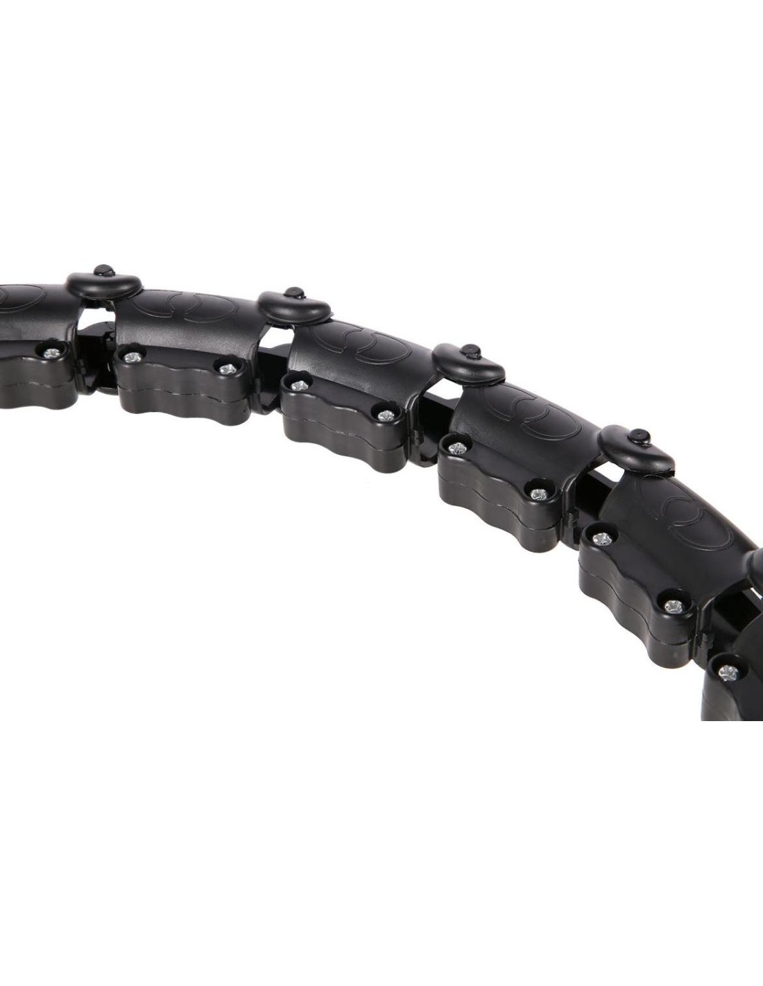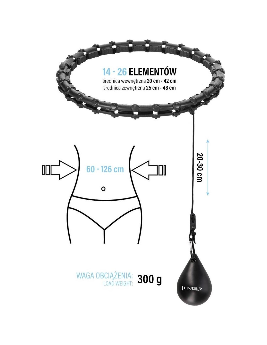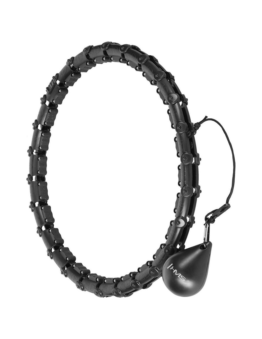 HHW11 HULA HOP BLACK WITH WEIGHT HMS HHW11 HMS is an adjustable hula hoop with a gravity ball for fitness. It allows for simultaneous training and 360-degree waist massage. It is perfect for strengthening and firming the muscle corset, among other things. Thanks to the adjustable circumference, the HHW11 will never fall off during exercise, so home cardio training can be long and enjoyable. The HHW11 is a product designed for plus size people who want to improve their fitness and figure. How does HHW11 work? The operation of HHW11 is very simple and intuitive. It is a closed loop that has a rail with an attached gravity ball (weight). During circular movements of the hips, centrifugal force begins to act, which moves the gravity ball along the circle, putting the abdominal muscles and torso in a state of tension. Training and massage in one During a 360-degree movement, the heads located in each segment of the hula hoop alternately press on the body, causing an additional massage effect, providing a pleasant feeling. The three-dimensional massage technique quickly stimulates the muscles, and the built-in protrusions enhance the massage effect. You can adjust the intensity of the massage by rotating speed. Circumference adjustment Quickly and easily reduce or increase the size of the circle by inserting or removing as many elements as you need. HHW11 has a total of 26 elements. The size can be set in the range of 14 to 26 elements, i.e. waist circumference from 63 to 126 cm. Thanks to this, the device will never fall off during training. Beginners can also use it. User comfort The device has a high-quality construction made of ABS and PP materials. The rail is mounted on ball bearings made of stainless steel. All this together makes the rotation flexible and undisturbed, which further enhances the feeling of satisfaction during training. The gravity ball is filled with sand, which increases safety. Compact size and easy assembly We open the loop using clips. Then, to connect subsequent elements, insert one element into another so that the protrusions fit into the appropriate holes. When reducing elements, grab one element with one hand and squeeze it in such a way as to pull out protrusions from holes. Then insert the rail with a gravity ball into the loop and close the clips. Thanks to its compact size, HHW11 is easy to carry. Benefits of training with hula hoop First of all, training with HHW11 will slim down your stomach and slim your waist. It will also contribute to reducing fat tissue from around your thighs and buttocks. Additionally, it will help strengthen your shoulder girdle and arms. Another advantage through strengthening abdominal muscles and torso will be a clear improvement in posture. The Hula hop plus size HHW11 is the perfect way to exercise at home to improve your wellbeing and health. Exercise effects Slim waist Flat stomach Cellulite reduction Shapely arms Firm thighs and buttocks Better blood flow Improved posture Specification: Material: ABS + PP Color: Black Circumference adjustment: 14 - 26 elements Waist: 60 - 126 cm Inner diameter: 20 cm - 42 cm Outer diameter: 25 cm - 48 cm Weight of the load: 300 g Length of the strap with the load: 20 - 30 cm Ball bearings, stainless steel Convenient fastening Remarks: Not for commercial use 24 months warranty