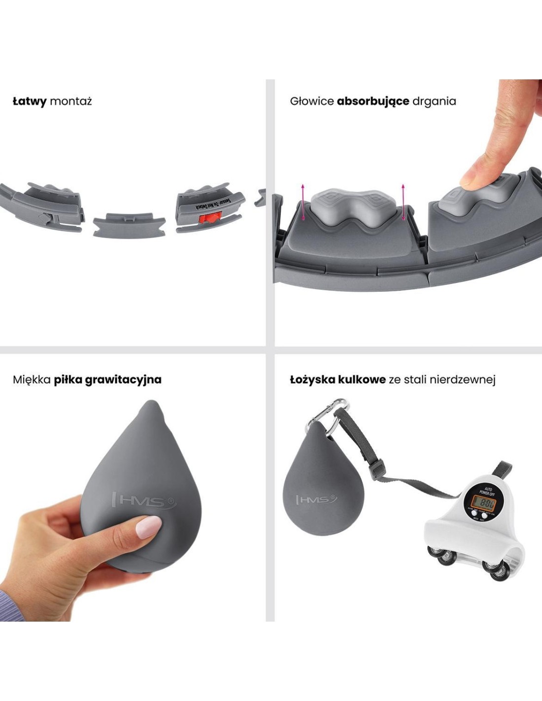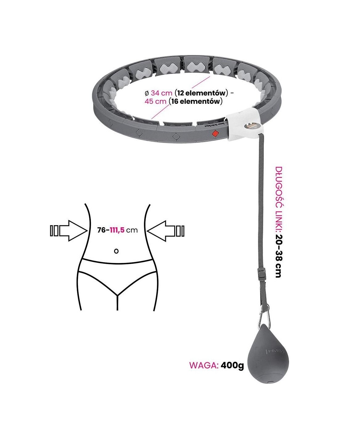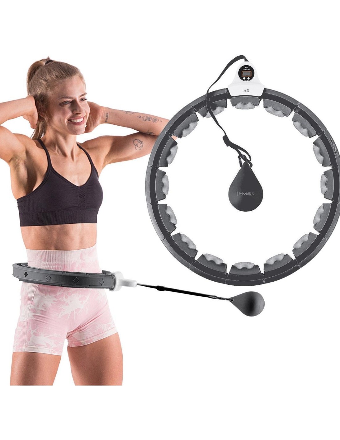 HHW06 HMS to inteligentne urządzenie z licznikiem 360 stopni i masażem jednocześnie! Dzięki temu trening cardio będzie długi i przyjemny, a to gwarantuje jeszcze szybsze i lepsze efekty! Urządzenie skierowane jest zarówno do dzieci, jak i dorosłych. Jak działa HHW06? Jest to zamknięta pętla, która posiada szynę z przymocowanym obciążeniem. Podczas wykonywania okrężnych ruchów biodrami zaczyna działać siła odśrodkowa, która przesuwa obciążenie po okręgu, napinając mięśnie brzucha i tułowia. Uwaga: zacisk powinien być szczelnie zamknięty przed użyciem. Trening i masaż w jednym: Wykonując ruch 360 stopni sprężyny w głowicach umieszczonych na obwodzie pętli doskonale amortyzują obciążenia i dopasowują się do ciała, co powoduje dodatkowy efekt masażu zapewniając ciału przyjemne odczucia. Szeroki zakres regulacji urządzenia: HHW06 posiada łącznie 16 elementów. Rozmiar można ustawić od 12 do 16 elementów, czyli obwód talii od 76 cm do 111,5 cm (średnica pętli: od 34 cm do 45 cm). W rezultacie urządzenie nigdy nie spadnie podczas treningu, więc nawet początkujący mogą z niego korzystać. Regulacja pasa wraz z obciążeniem : Kolejną zaletą jest możliwość zmiany długości pasa z obciążeniem. Wynosi ona od 20 cm do 38 cm. Im dłuższy pas, tym większa siła odśrodkowa podczas treningu, a co za tym idzie, większy ciężar i większa trudność obrotów. Komfort użytkowania: Urządzenie posiada konstrukcję wykonaną z wysokiej jakości PVC. Szyna osadzona jest na łożyskach kulkowych wykonanych ze stali nierdzewnej. Wszystko to razem sprawia, że rotacja jest elastyczna i nieprzerwana, co dodatkowo zwiększa satysfakcję podczas treningu. Dodatkowo obciążenie pokryte jest miękką gumą zwiększającą bezpieczeństwo użytkownika i innych osób. Łatwa instalacja: Montaż odbywa się dzięki klipsom. Wystarczy nacisnąć klips, aby wyciągnąć lub włożyć dodatkowy element. Następnie należy włożyć szynę z ładunkiem do pętli, wyregulować długość pasa i gotowe. Ważne jest, aby nie wyciągać elementu, w którym znajduje się czujnik odpowiedzialny za dostarczanie danych. Inteligentny wyświetlacz LCD HHW06 został wyposażony w duży wyświetlacz LCD, na którym wyświetlane są takie dane jak czas treningu, liczba spalonych kalorii oraz liczba powtórzeń (obrotów). Dzięki temu monitorowanie swoich osiągnięć podczas treningów jest znacznie łatwiejsze. Wygodny transport: Wszystkie elementy urządzenia z łatwością mieszczą się w plecaku lub torbie na siłownię. Korzyści z treningu z hula-hoop : Przede wszystkim trening z HHW06 wyszczupli brzuch i wysmukli talię. Przyczyni się również do redukcji tkanki tłuszczowej z okolic ud i pośladków. Dodatkowo wzmocni obręcz barkową i ramiona. Kolejną zaletą, wynikającą ze wzmocnienia mięśni brzucha i tułowia, jest wyraźna poprawa postawy użytkownika. Zaledwie pół godziny ciągłego treningu z HHW06 to odpowiednik godziny pływania i trzech godzin biegania! Specyfikacja: Materiał: PVC, ABS, PP, TPR Kolor: czarny Regulacja obwodu: 12 - 16 elementów (średnica 34cm - 45cm) Talia: 75cm - 109cm Waga obciążenia: 400g. Regulacja pasa z obciążeniem: 20cm - 38cm Funkcje wyświetlacza: czas, kalorie, powtórzenia Wygodne zapięcie na klips Łożyska kulkowe, stal nierdzewna Uwagi: Nie jest przeznaczony do użytku komercyjnego Gwarancja 24 miesiące