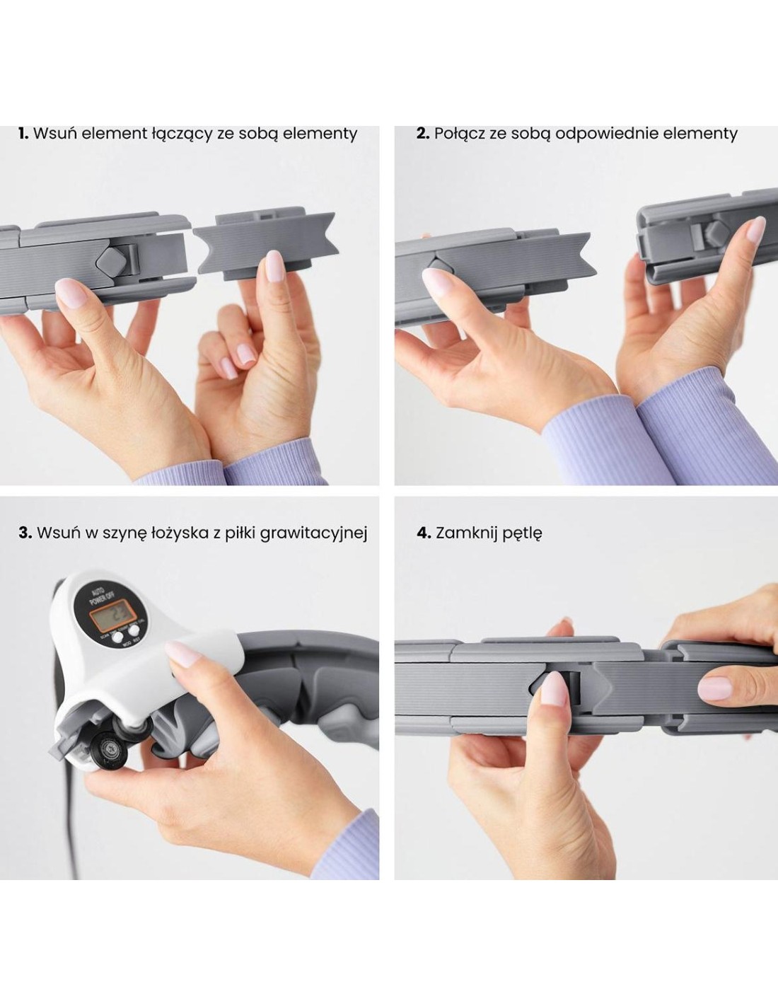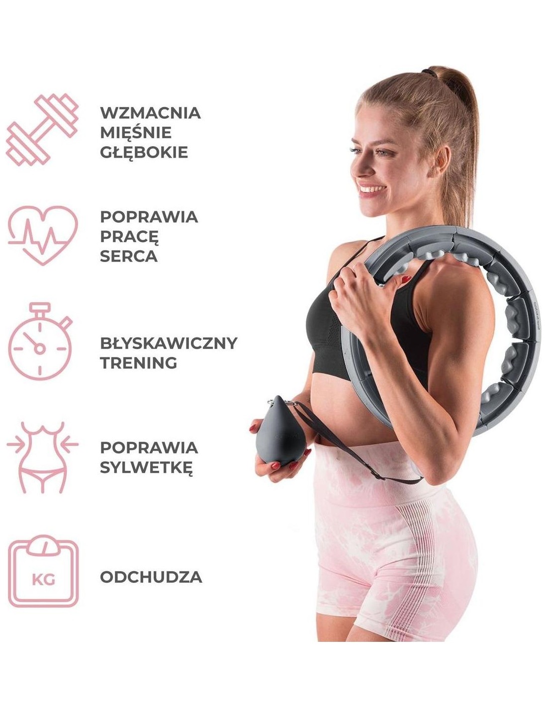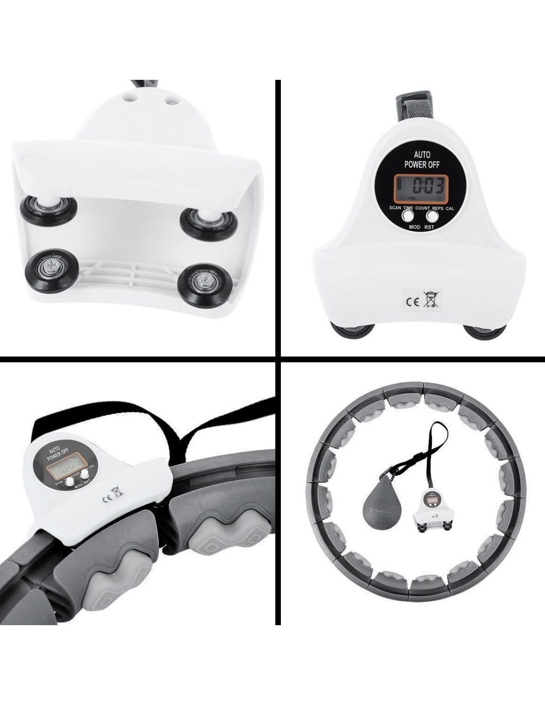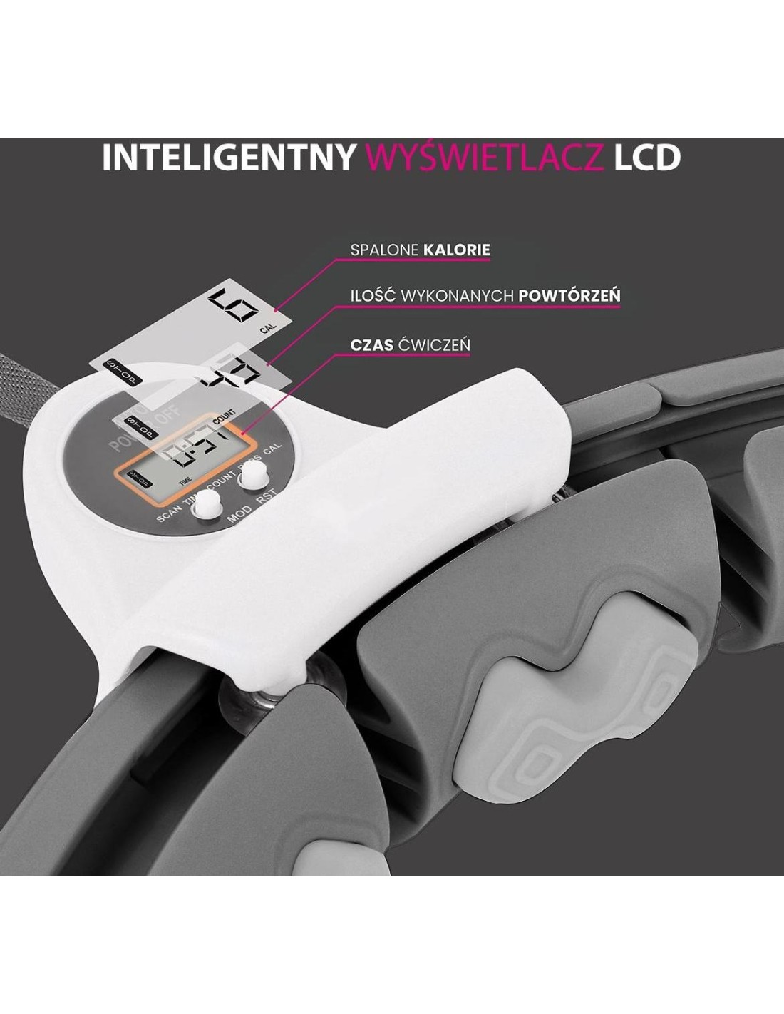 HHW06 HMS to inteligentne urządzenie z licznikiem 360 stopni i masażem jednocześnie! Dzięki temu trening cardio będzie długi i przyjemny, a to gwarantuje jeszcze szybsze i lepsze efekty! Urządzenie skierowane jest zarówno do dzieci, jak i dorosłych. Jak działa HHW06? Jest to zamknięta pętla, która posiada szynę z przymocowanym obciążeniem. Podczas wykonywania okrężnych ruchów biodrami zaczyna działać siła odśrodkowa, która przesuwa obciążenie po okręgu, napinając mięśnie brzucha i tułowia. Uwaga: zacisk powinien być szczelnie zamknięty przed użyciem. Trening i masaż w jednym: Wykonując ruch 360 stopni sprężyny w głowicach umieszczonych na obwodzie pętli doskonale amortyzują obciążenia i dopasowują się do ciała, co powoduje dodatkowy efekt masażu zapewniając ciału przyjemne odczucia. Szeroki zakres regulacji urządzenia: HHW06 posiada łącznie 16 elementów. Rozmiar można ustawić od 12 do 16 elementów, czyli obwód talii od 76 cm do 111,5 cm (średnica pętli: od 34 cm do 45 cm). W rezultacie urządzenie nigdy nie spadnie podczas treningu, więc nawet początkujący mogą z niego korzystać. Regulacja pasa wraz z obciążeniem : Kolejną zaletą jest możliwość zmiany długości pasa z obciążeniem. Wynosi ona od 20 cm do 38 cm. Im dłuższy pas, tym większa siła odśrodkowa podczas treningu, a co za tym idzie, większy ciężar i większa trudność obrotów. Komfort użytkowania: Urządzenie posiada konstrukcję wykonaną z wysokiej jakości PVC. Szyna osadzona jest na łożyskach kulkowych wykonanych ze stali nierdzewnej. Wszystko to razem sprawia, że rotacja jest elastyczna i nieprzerwana, co dodatkowo zwiększa satysfakcję podczas treningu. Dodatkowo obciążenie pokryte jest miękką gumą zwiększającą bezpieczeństwo użytkownika i innych osób. Łatwa instalacja: Montaż odbywa się dzięki klipsom. Wystarczy nacisnąć klips, aby wyciągnąć lub włożyć dodatkowy element. Następnie należy włożyć szynę z ładunkiem do pętli, wyregulować długość pasa i gotowe. Ważne jest, aby nie wyciągać elementu, w którym znajduje się czujnik odpowiedzialny za dostarczanie danych. Inteligentny wyświetlacz LCD HHW06 został wyposażony w duży wyświetlacz LCD, na którym wyświetlane są takie dane jak czas treningu, liczba spalonych kalorii oraz liczba powtórzeń (obrotów). Dzięki temu monitorowanie swoich osiągnięć podczas treningów jest znacznie łatwiejsze. Wygodny transport: Wszystkie elementy urządzenia z łatwością mieszczą się w plecaku lub torbie na siłownię. Korzyści z treningu z hula-hoop : Przede wszystkim trening z HHW06 wyszczupli brzuch i wysmukli talię. Przyczyni się również do redukcji tkanki tłuszczowej z okolic ud i pośladków. Dodatkowo wzmocni obręcz barkową i ramiona. Kolejną zaletą, wynikającą ze wzmocnienia mięśni brzucha i tułowia, jest wyraźna poprawa postawy użytkownika. Zaledwie pół godziny ciągłego treningu z HHW06 to odpowiednik godziny pływania i trzech godzin biegania! Specyfikacja: Materiał: PVC, ABS, PP, TPR Kolor: czarny Regulacja obwodu: 12 - 16 elementów (średnica 34cm - 45cm) Talia: 75cm - 109cm Waga obciążenia: 400g. Regulacja pasa z obciążeniem: 20cm - 38cm Funkcje wyświetlacza: czas, kalorie, powtórzenia Wygodne zapięcie na klips Łożyska kulkowe, stal nierdzewna Uwagi: Nie jest przeznaczony do użytku komercyjnego Gwarancja 24 miesiące