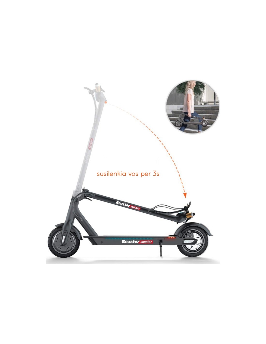 Beaster Scooter „BS06BL“ – tai praktiškas 350 W galios elektrinis paspirtukas, skirtas kiekvienam, kuris nori mieste keliauti išmaniai ir moderniai. Paspirtukas patogiai susilanksto ir sveria tik 14 kg, todėl jį nesunkiai galėsite persinešti, taip pat vežtis automobilyje. Prietaiso korpusas pasižymi ne tik lengvumu, tačiau ir išskirtiniu patvarumu bei atsparumu išorės poveikiui. Su „Beaster Scooter“ elektriniu paspirtuku galėsite mėgautis išskirtiniu laiko leidimu ir keliaudami patirti daugybę džiugių bei neužmirštamų akimirkų.