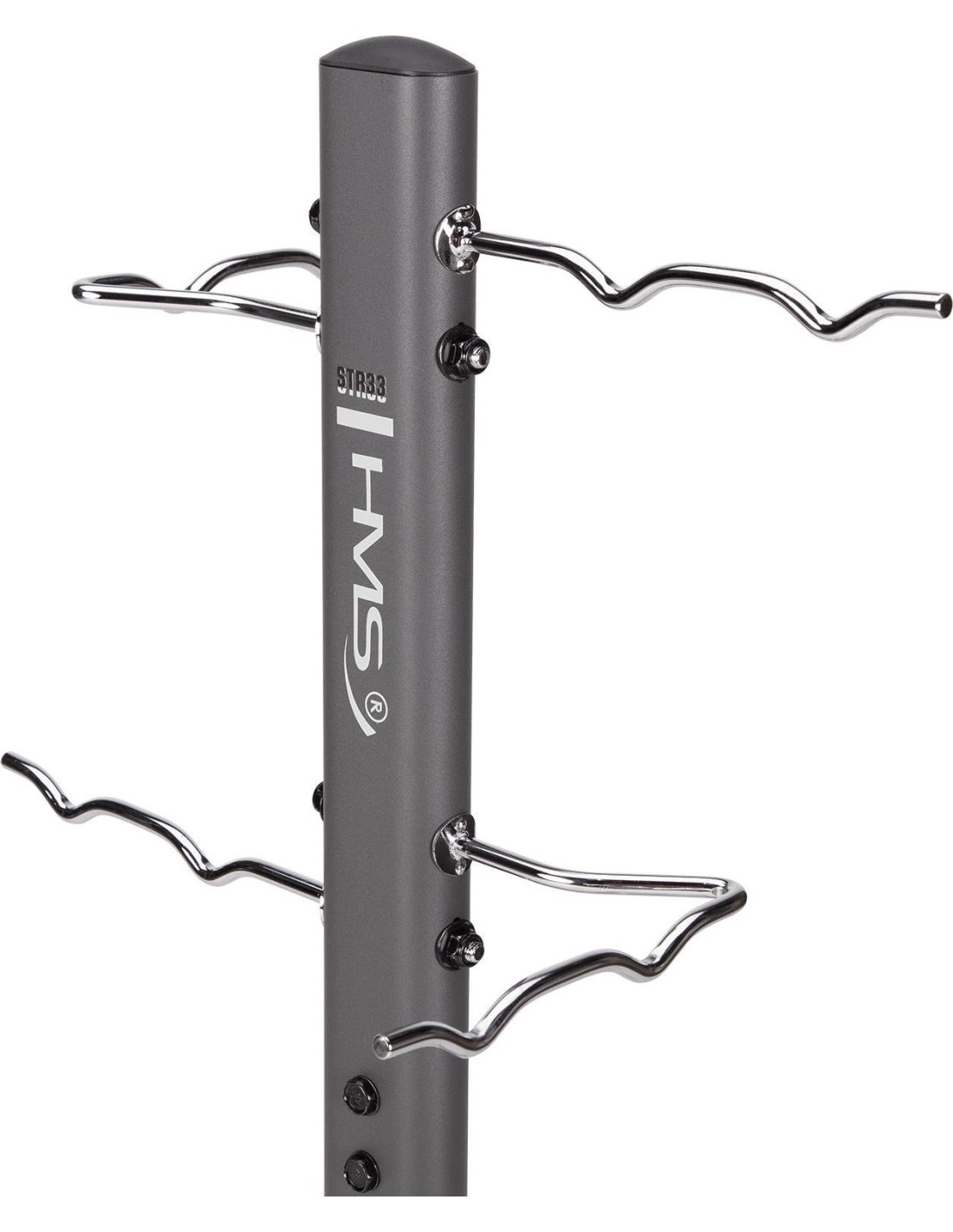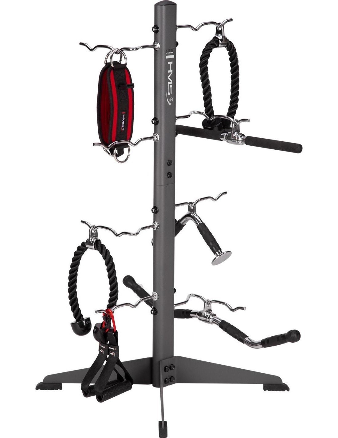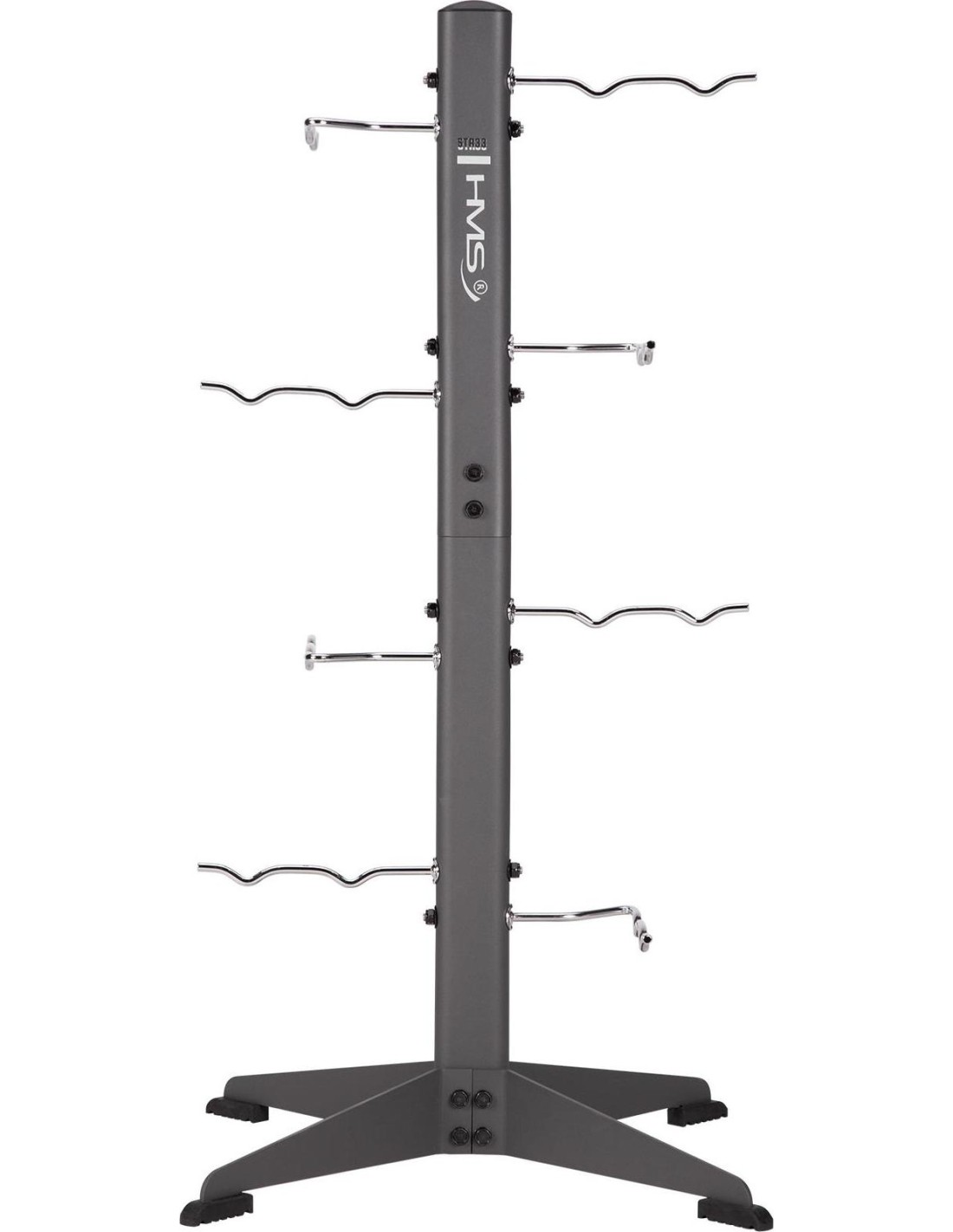 STR33 RACK FOR ACCESSORIES COMMERCIAL HMS Do you have a lot of strength training and fitness accessories that take up space and you don't know how to arrange them? Would you like to have your equipment always at hand? The STR33 stand from HMS will be the perfect solution for you. STR33 is a stand that has wide legs at the bottom, which provides it with great stability and durability. The stand is equipped with eight independent hooks on which you can hang various fitness accessories, such as skipping ropes, handles or ropes. Each hook will support a maximum load of up to 30 kg, so you don't have to worry about damaging the stand or equipment. STR33 is suitable for use in clubs, gyms and homes. You can place it anywhere because it is small and lightweight. The stand is also easy to assemble and clean, so you won't have any problems. The HMS stand is a perfect choice for anyone who values order in their training space. Specification: Height: 124 cm Width: 81 cm Straight hook length: 25 cm Length of the foldable hook: 38 cm Frame: 42x79 mm Number of hooks: 8 Hook diameter: 1 cm Anti-slip feet: yes Material: steel Maximum load per hook: 30 kg Remarks: Class: S Warranty 12 months for commercial use Warranty 24 months for domestic use