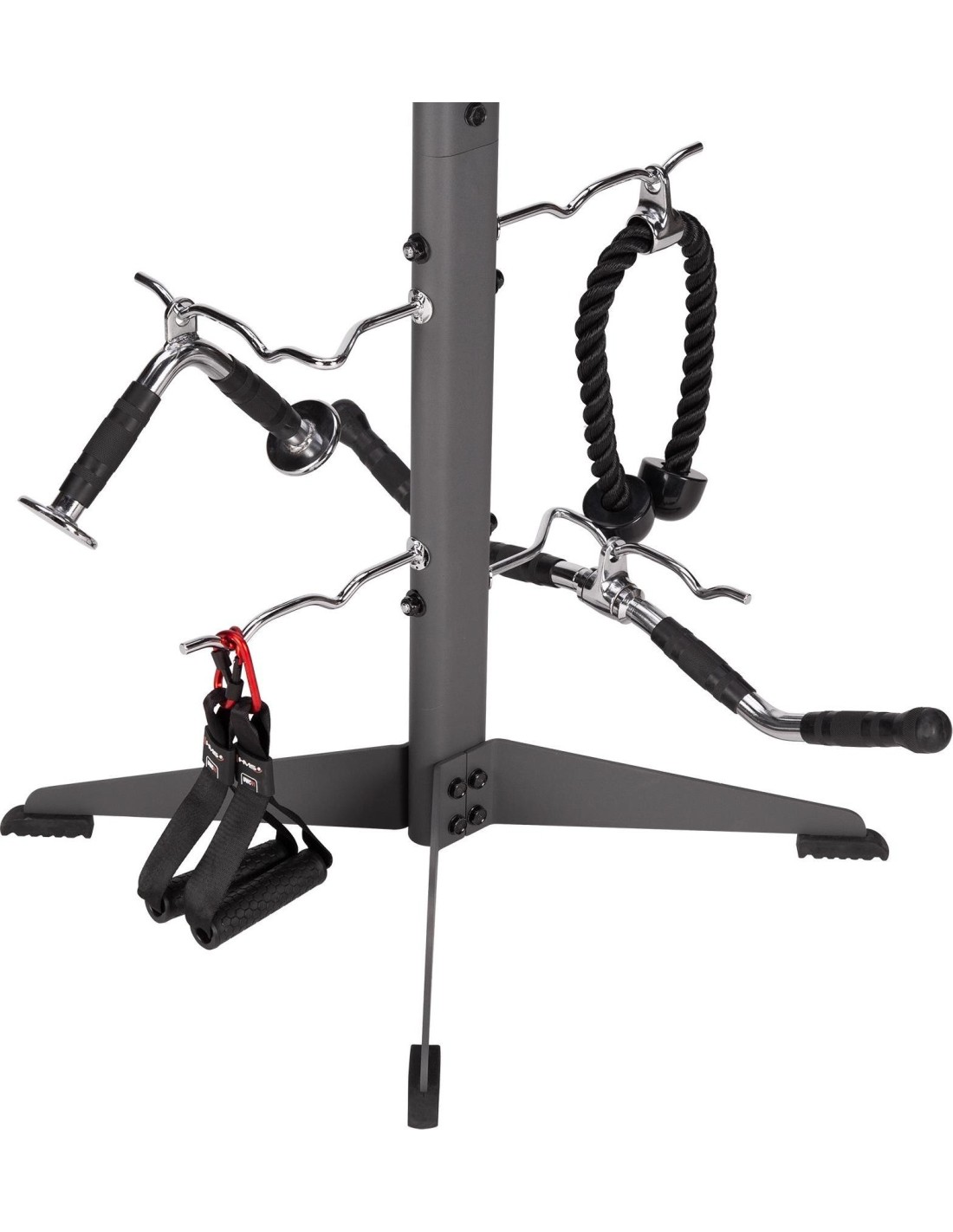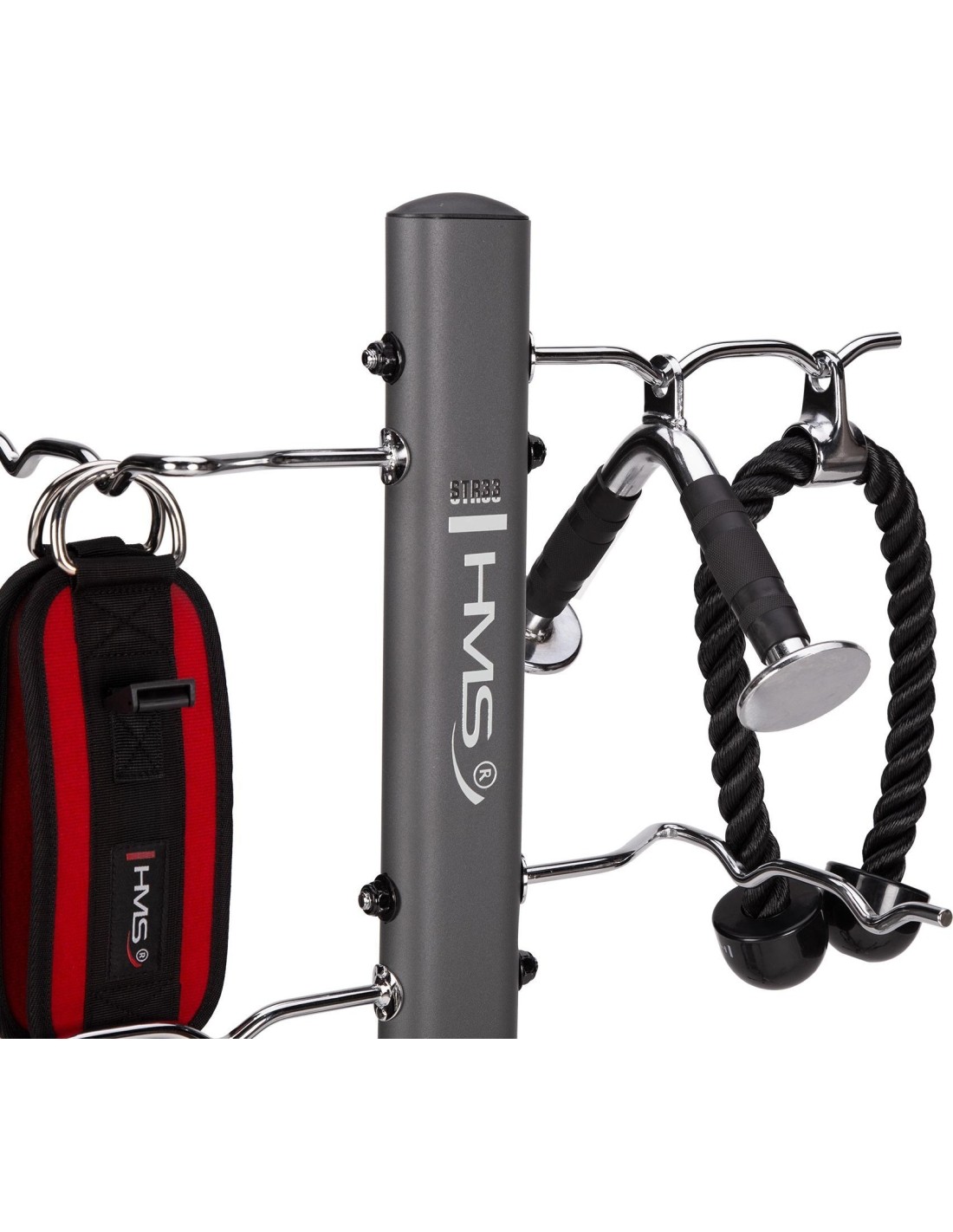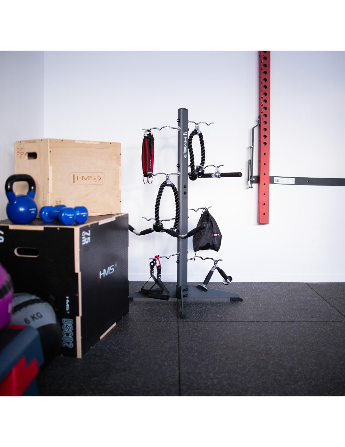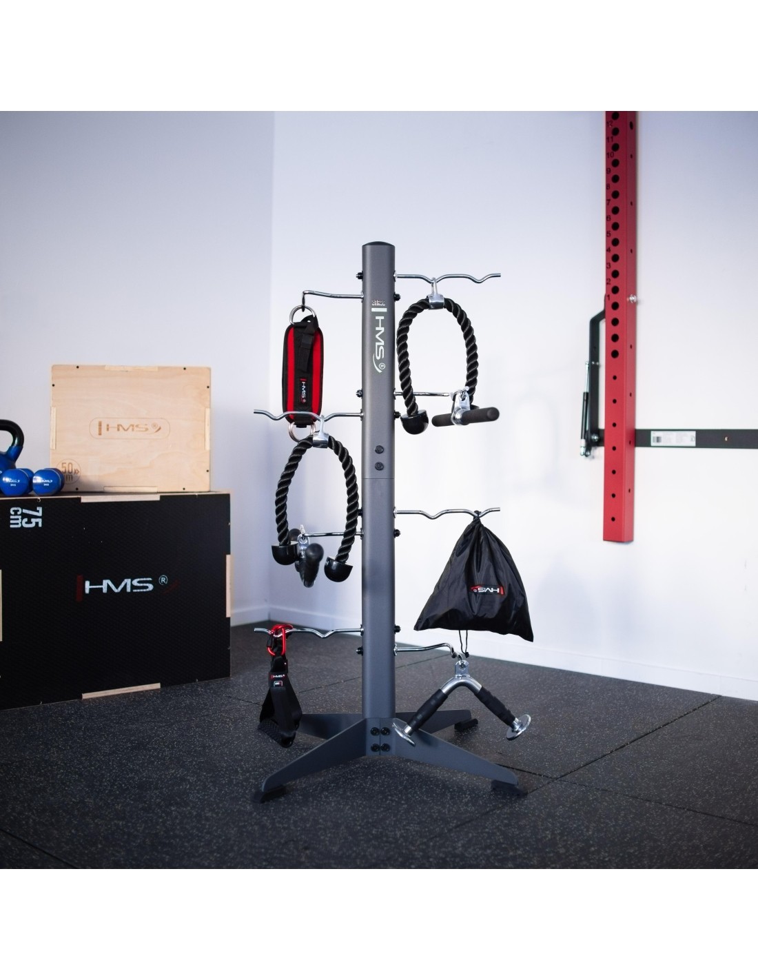 STR33 RACK FOR ACCESSORIES COMMERCIAL HMS Do you have a lot of strength training and fitness accessories that take up space and you don't know how to arrange them? Would you like to have your equipment always at hand? The STR33 stand from HMS will be the perfect solution for you. STR33 is a stand that has wide legs at the bottom, which provides it with great stability and durability. The stand is equipped with eight independent hooks on which you can hang various fitness accessories, such as skipping ropes, handles or ropes. Each hook will support a maximum load of up to 30 kg, so you don't have to worry about damaging the stand or equipment. STR33 is suitable for use in clubs, gyms and homes. You can place it anywhere because it is small and lightweight. The stand is also easy to assemble and clean, so you won't have any problems. The HMS stand is a perfect choice for anyone who values order in their training space. Specification: Height: 124 cm Width: 81 cm Straight hook length: 25 cm Length of the foldable hook: 38 cm Frame: 42x79 mm Number of hooks: 8 Hook diameter: 1 cm Anti-slip feet: yes Material: steel Maximum load per hook: 30 kg Remarks: Class: S Warranty 12 months for commercial use Warranty 24 months for domestic use