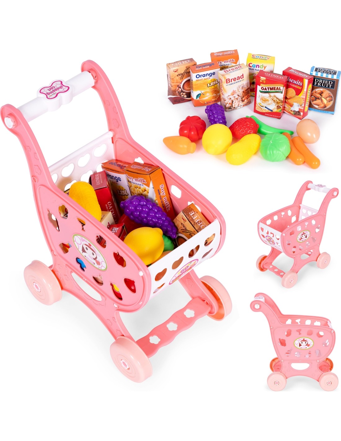 Zestaw obejmuje autentycznie wyglądający wózek zakupowy z różnorodnymi produktami spożywczymi, który pomaga rozwijać zdolności motoryczne i organizacyjne. Maluchy mogą cieszyć się wieloma imitacjami prawdziwych produktów, od warzyw po słodycze, co sprawia, że nauka zakupów staje się fascynującym doświadczeniem.