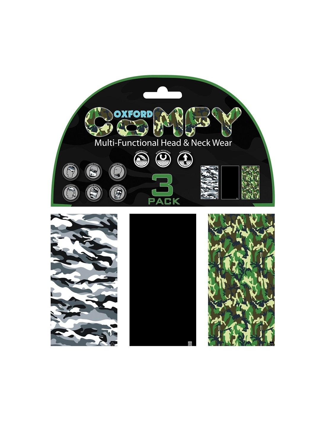 Uniwersalny wielofunkcyjny ocieplacz na szyję Oxford Comfy 3-Pack to zestaw 3 ocieplaczy na szyję, które mają za zadanie ogrzać Twoją szyję i głowę. Wykonany z przyjemnych materiałów, ocieplacz zapewnia wysoki poziom komfortu. Jest praktyczny, łatwy w przechowywaniu i nadaje się do wszelkiego rodzaju aktywności na świeżym powietrzu. Dlatego też jest popularny wśród rowerzystów. Może być używany jako szalik, kominiarka, opaska na głowę, czapka z kapturem, gumka itp.
