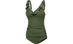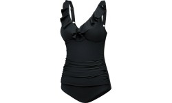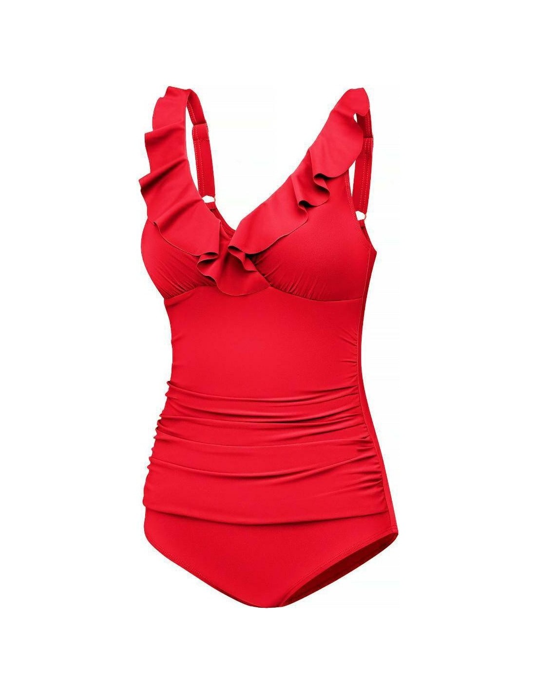 Discover extraordinary elegance and sophisticated style with our women's one-piece swimsuit featuring a delicate ruffle at the neckline. This unique design blends classic and modern elements, ensuring you feel confident and stunning both at the beach and by the pool. Our one-piece swimsuit has adjustable straps for a perfect fit, providing comfort and bust support. Additionally, the ruching on the stomach creates a slimming effect, subtly highlighting your figure's assets. Made from VITA fabric (78% recycled polyamide, 28% elastane) High chlorine resistance Built-in bra with soft, foam cups Adjustable straps Front draped material for slimming/shaping effect Full back coverage Tummy-control mesh at the front