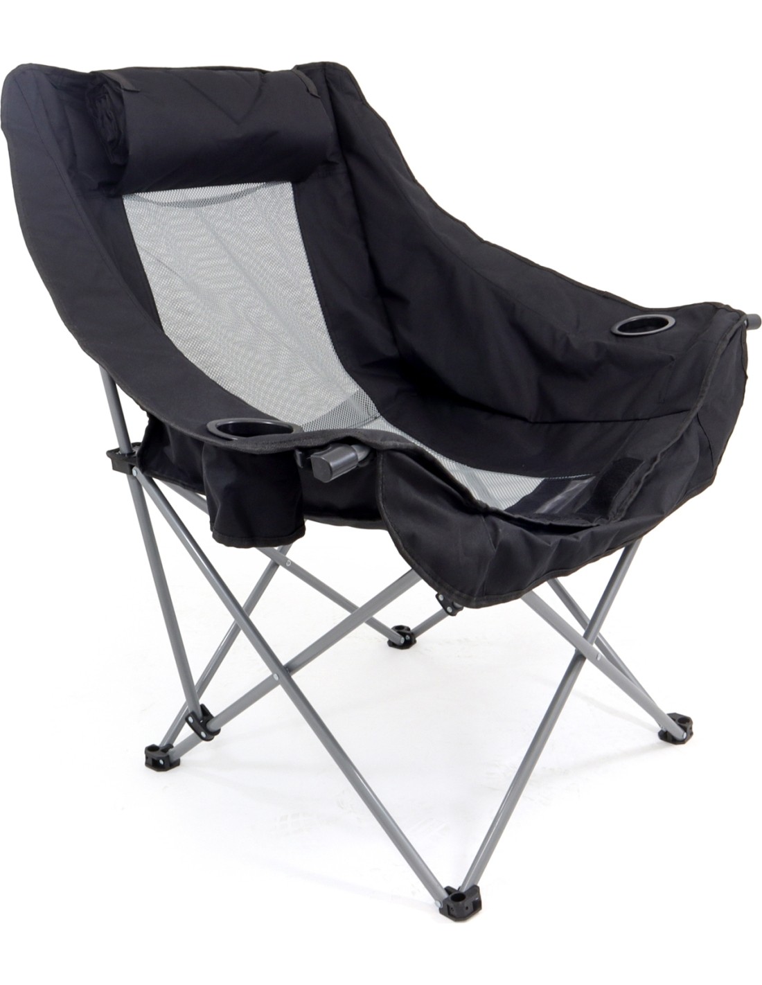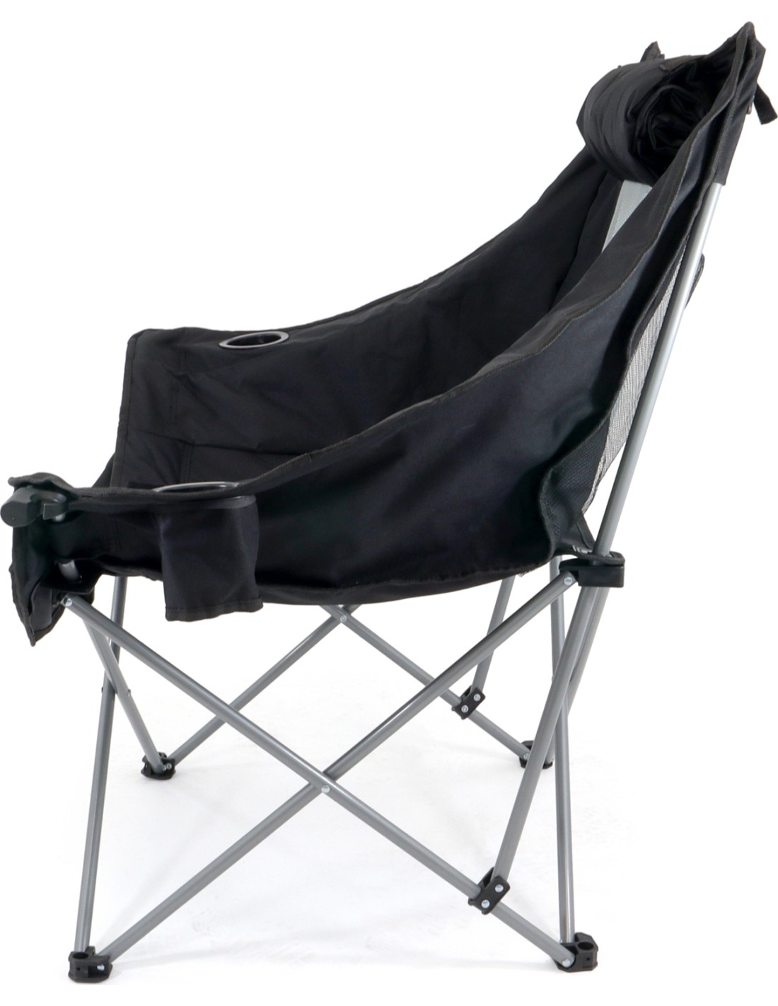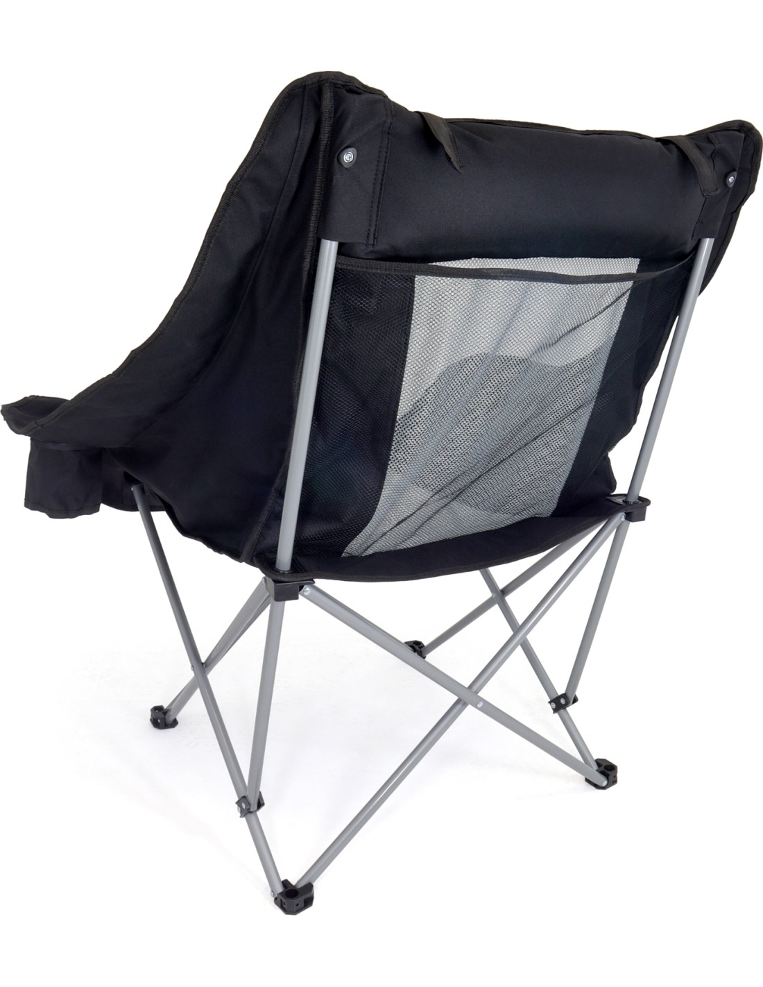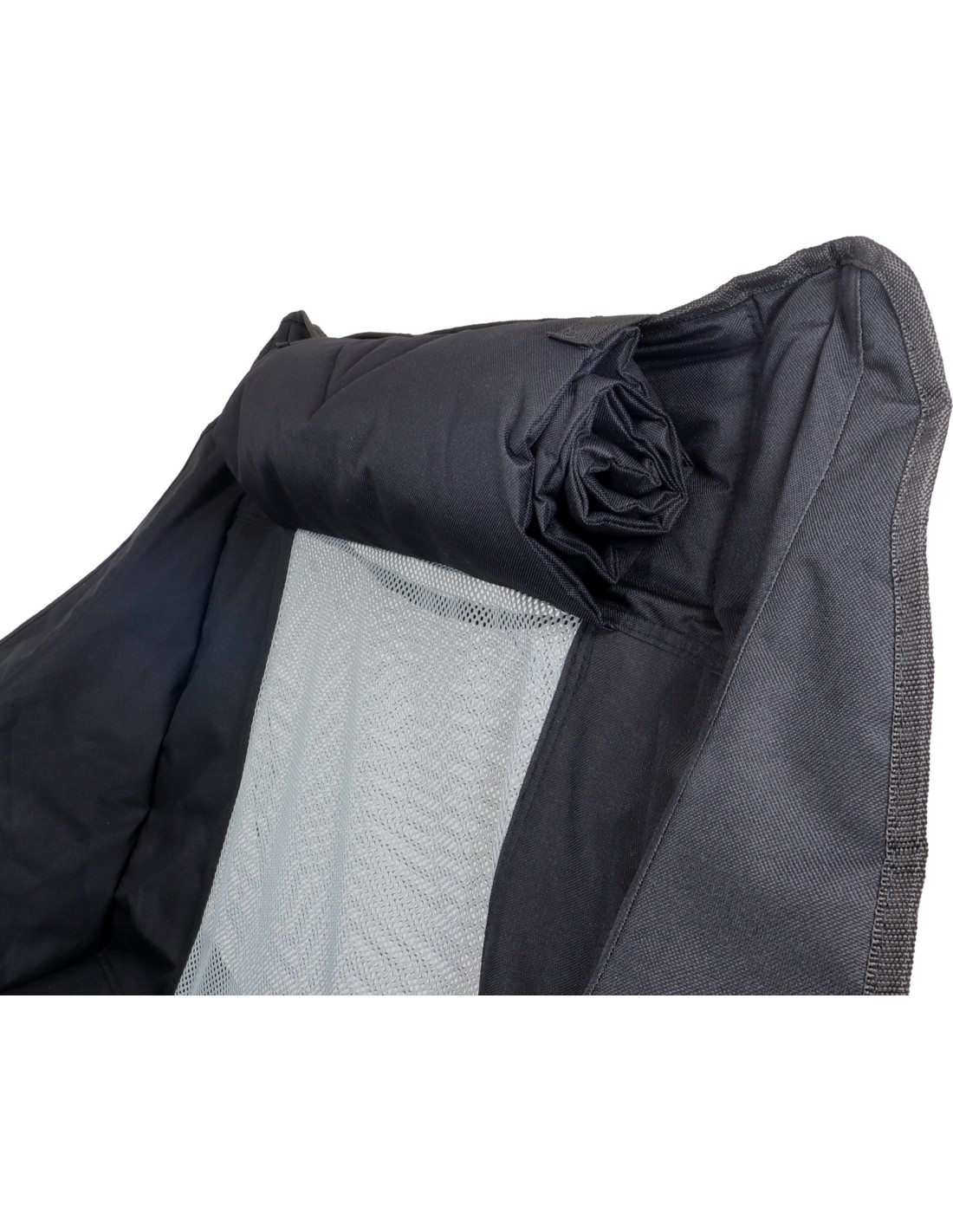 This sturdy folding chair offers a large and comfortable seat. The roll-up backrest ensures good ventilation and also serves as a headrest for maximum comfort. The padded seat and backrest ensure comfortable seating. Additional practical features such as a drink and wine glass holder and an organizer compartment make the chair particularly functional. The wide armrests also provide an extra dose of comfort.+ Roll-up backrest for good ventilation and headrest
