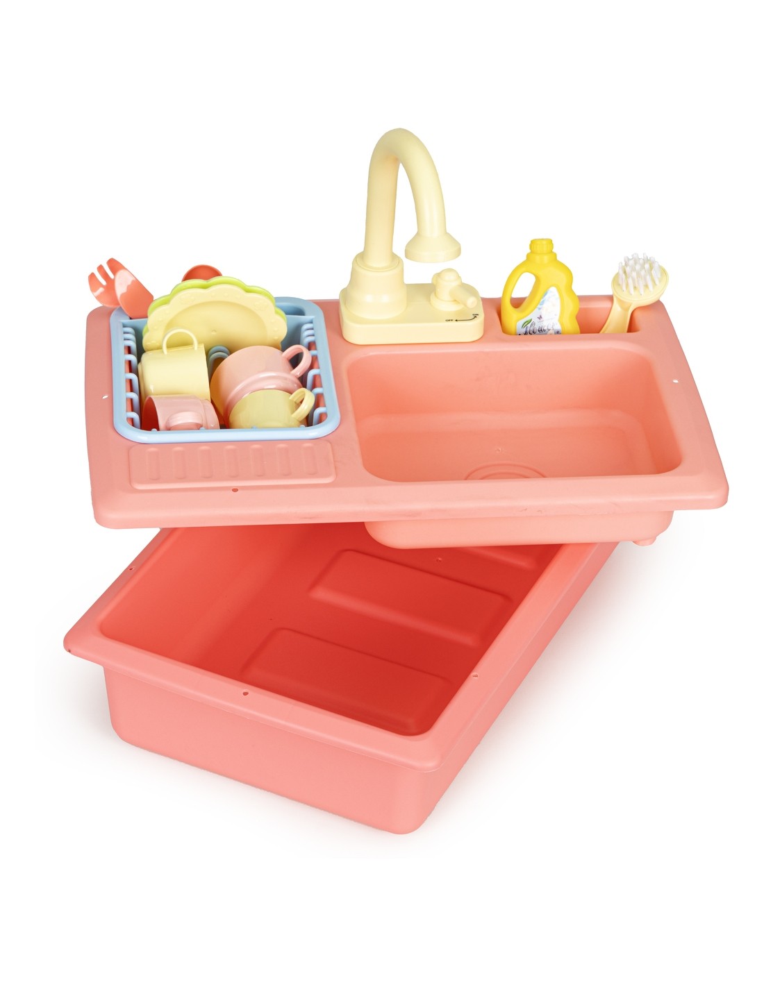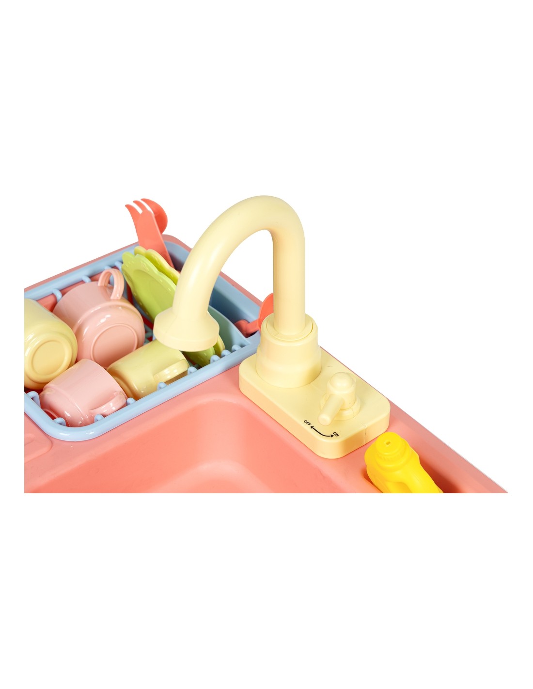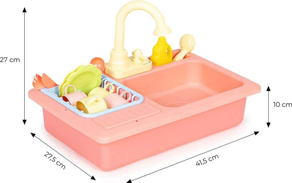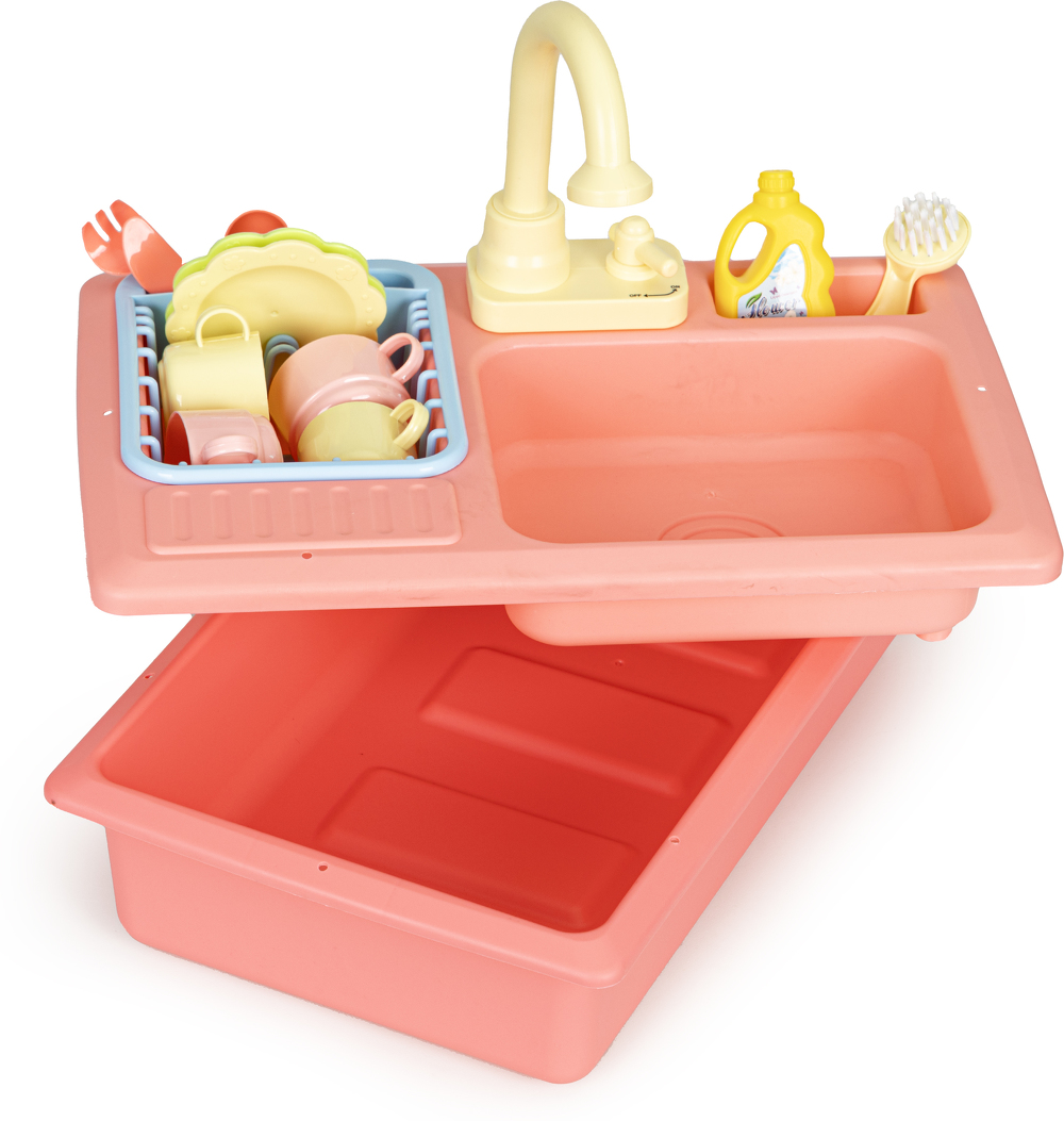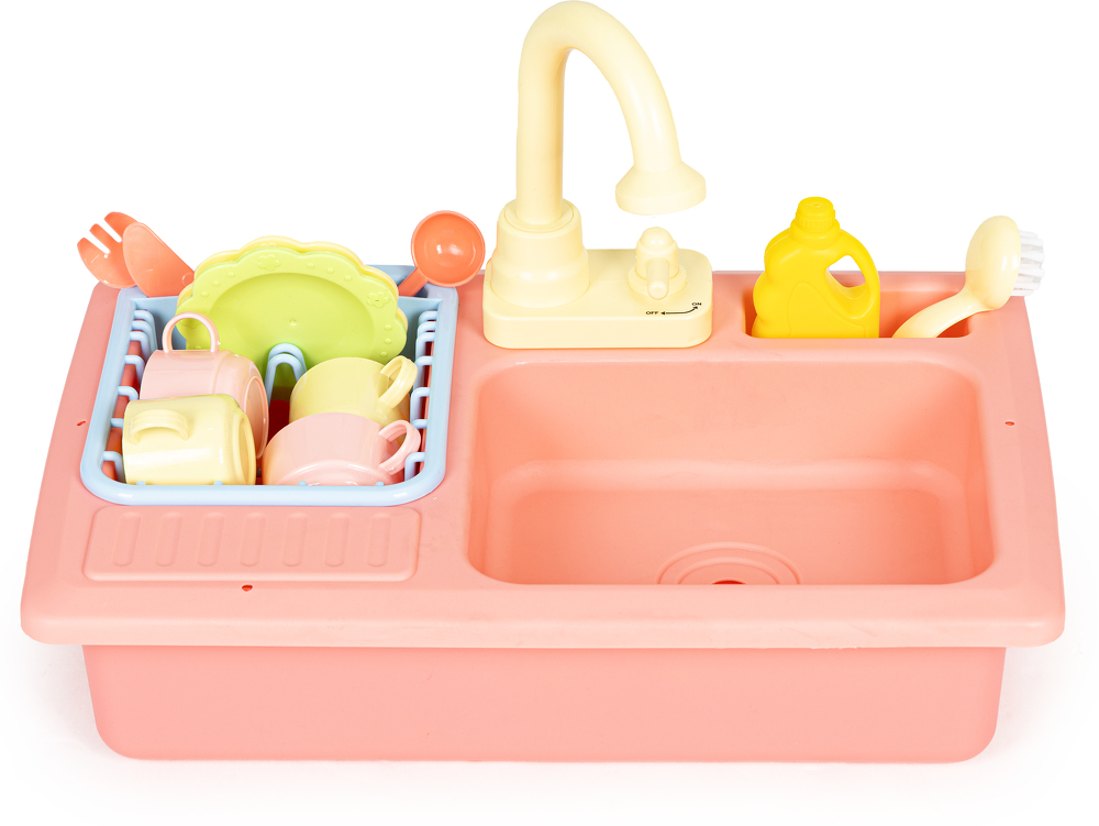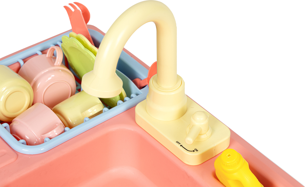 Zabawka została zaprojektowana na wzór prawdziwego, spotykanego w każdej kuchni zlewu, dzięki temu zabawa jest bardzo wciągająca. Po jego prawej stronie znajduje się wyciągana suszarka do odkładania umytych talerzy, filiżanek i sztućców, a obok kranu umieszczono specjalne miejsce na płyn i szczotkę do szorowania. Tuż pod kranem znajduje się mały kurek uruchamiający strumień wody, która wpada do komory zlewu, a dalej do odpływu i miski aby dzięki pompce znów trafić do kranu.