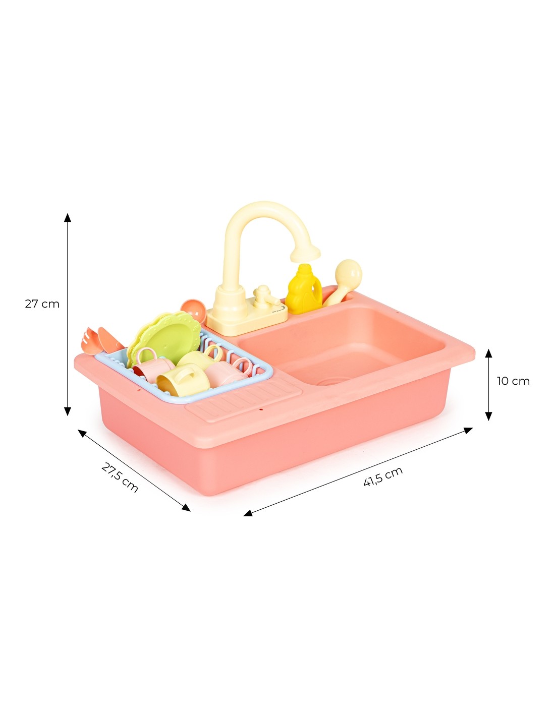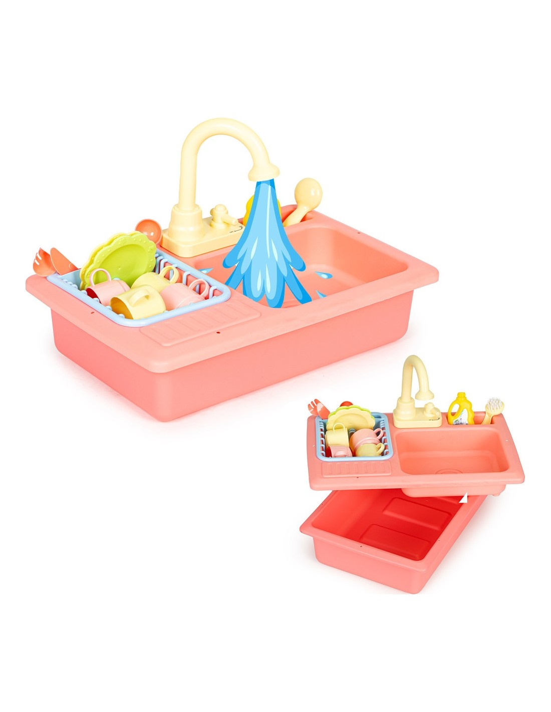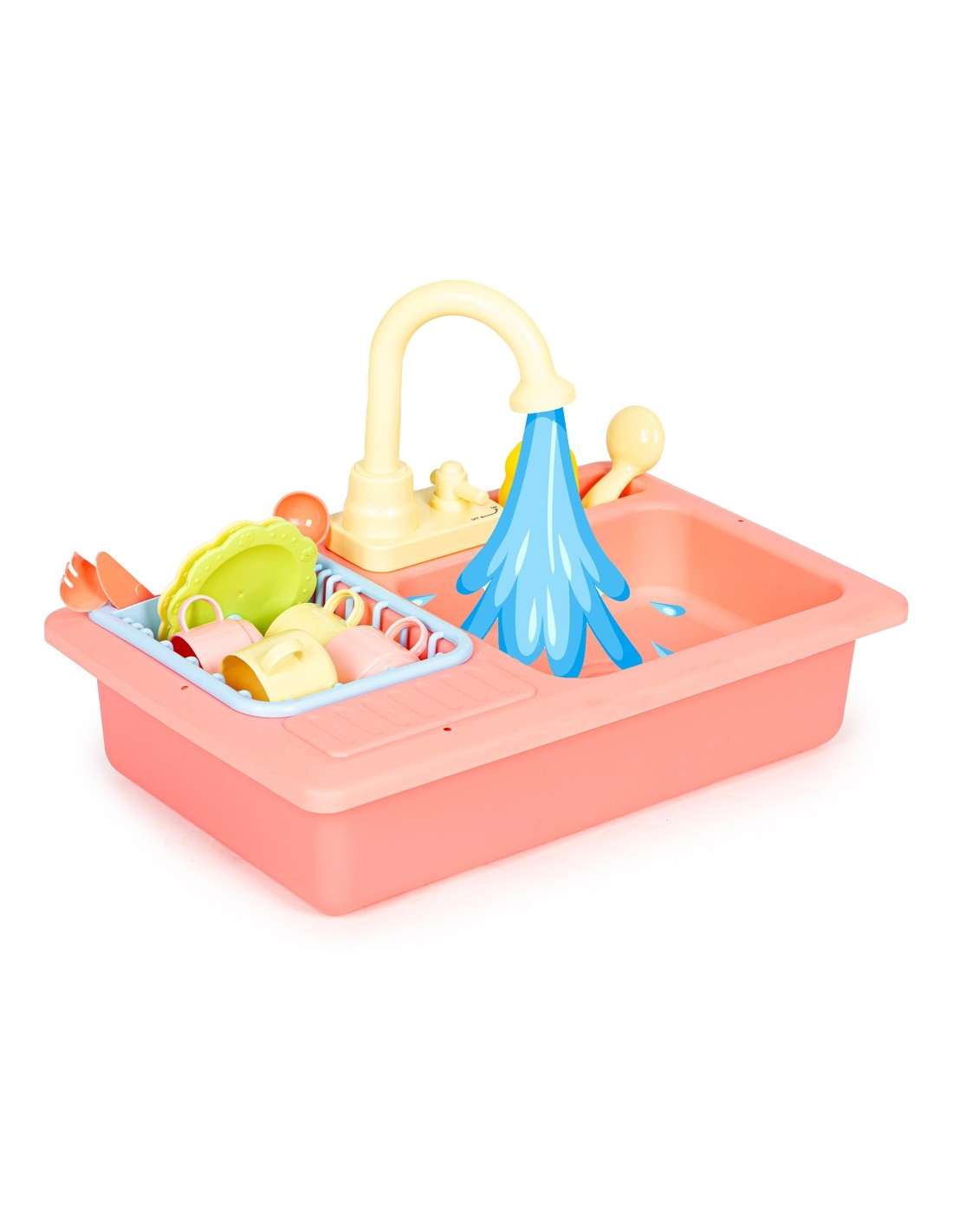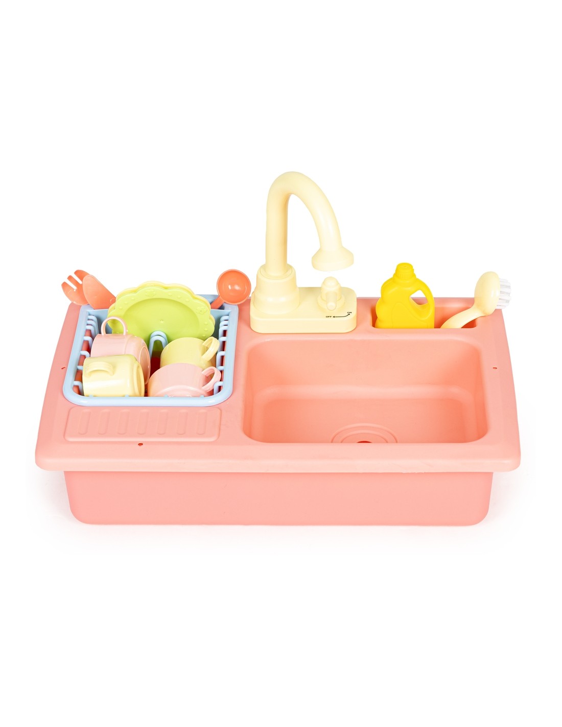 Zabawka została zaprojektowana na wzór prawdziwego, spotykanego w każdej kuchni zlewu, dzięki temu zabawa jest bardzo wciągająca. Po jego prawej stronie znajduje się wyciągana suszarka do odkładania umytych talerzy, filiżanek i sztućców, a obok kranu umieszczono specjalne miejsce na płyn i szczotkę do szorowania. Tuż pod kranem znajduje się mały kurek uruchamiający strumień wody, która wpada do komory zlewu, a dalej do odpływu i miski aby dzięki pompce znów trafić do kranu.