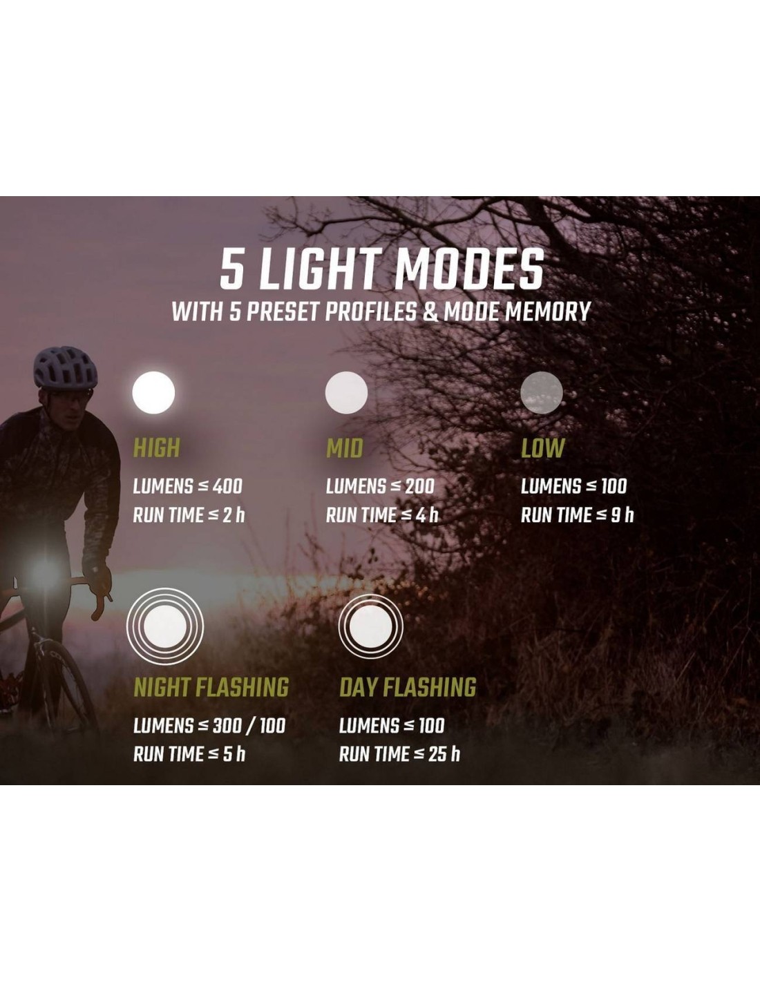 BUSTER 400 jest uniwersalnym urządzeniem na każdą okazję. Dzięki 400 lumenom i zasięgowi 120 metrów zapewnia najlepszą możliwą widoczność pobliskich dróg i ścieżek. Pięć trybów światła i moduł pamięci zapewniają, że zawsze dostępna jest odpowiednia ilość światła. Sześciostopniowy wskaźnik baterii w górnej części dokładnie pokazuje pozostały poziom naładowania baterii. OSRAM LED Maksymalny strumień świetlny: 400 lumenów Zasięg wiązki: ~120 m 5 trybów światła: Wysoki (400 lm), Średni (200 lm), Niski (100 lm), Nocny migający (300/100 lm) Dzienny migający (100 lm) Czas pracy: 2 h w trybie wysokim, 4 h w trybie średnim, 9 h w trybie niskim, 5 h w trybie nocnym, 30 h w trybie dziennym Czas ładowania: 3 h Regulowane w zakresie 360° mocowanie silikonowe z możliwością szybkiego zwolnienia Montaż bez użycia narzędzi Zabezpieczenie przed włączeniem (podwójne kliknięcie powoduje włączenie) Odporność na zachlapanie zgodnie z IPX4 Światłowód SIGMA zapewniający doskonałą widoczność Pięć wstępnie ustawionych profili trybów Funkcja pamięci trybów Krótkie naciśnięcie przycisku pokazuje stan baterii Zintegrowana funkcja ładowania przez USB-C Sześciostopniowy wskaźnik akumulatora i pięciostopniowy wskaźnik naładowania Możliwość ładowania podczas pracy Waga: 107 g (wraz z uchwytem)