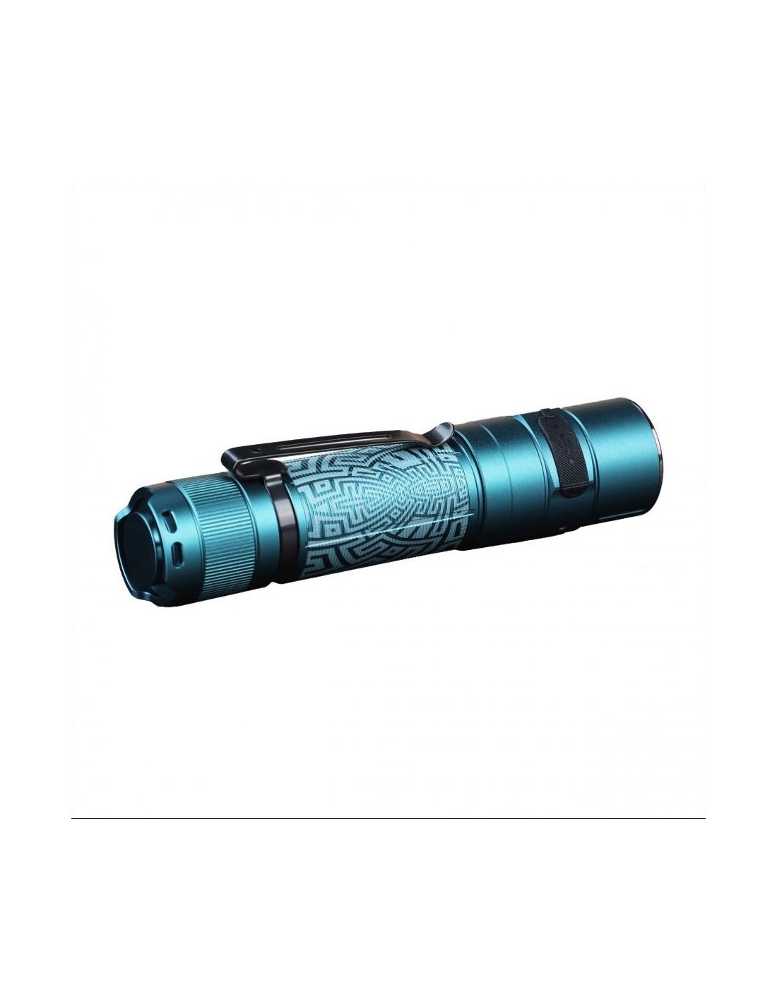 The E35R flashlight also features a battery level indicator (LED in the side switch), protection against overheating and reverse polarity, and a low battery warning function. For the time of carrying the flashlight, the switch can be locked, thus protecting against uncontrolled discharge of the battery. The flashlight has a high IP68 rating, so it is resistant to full immersion in water at a depth of 2 m and a fall from a height of 1 m.