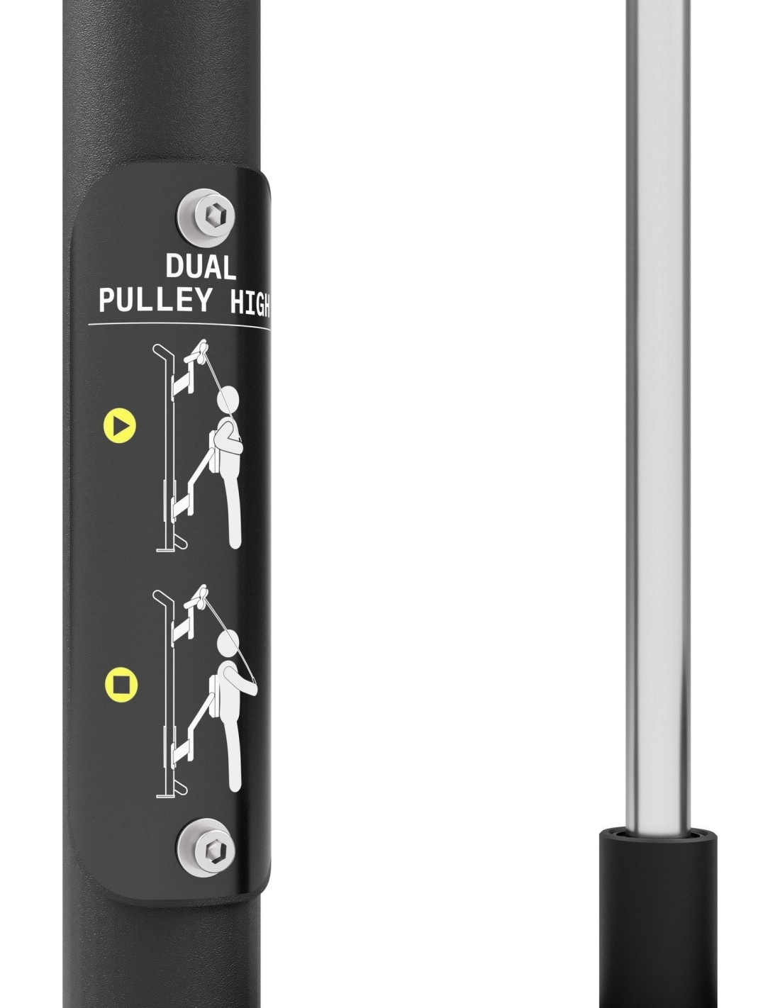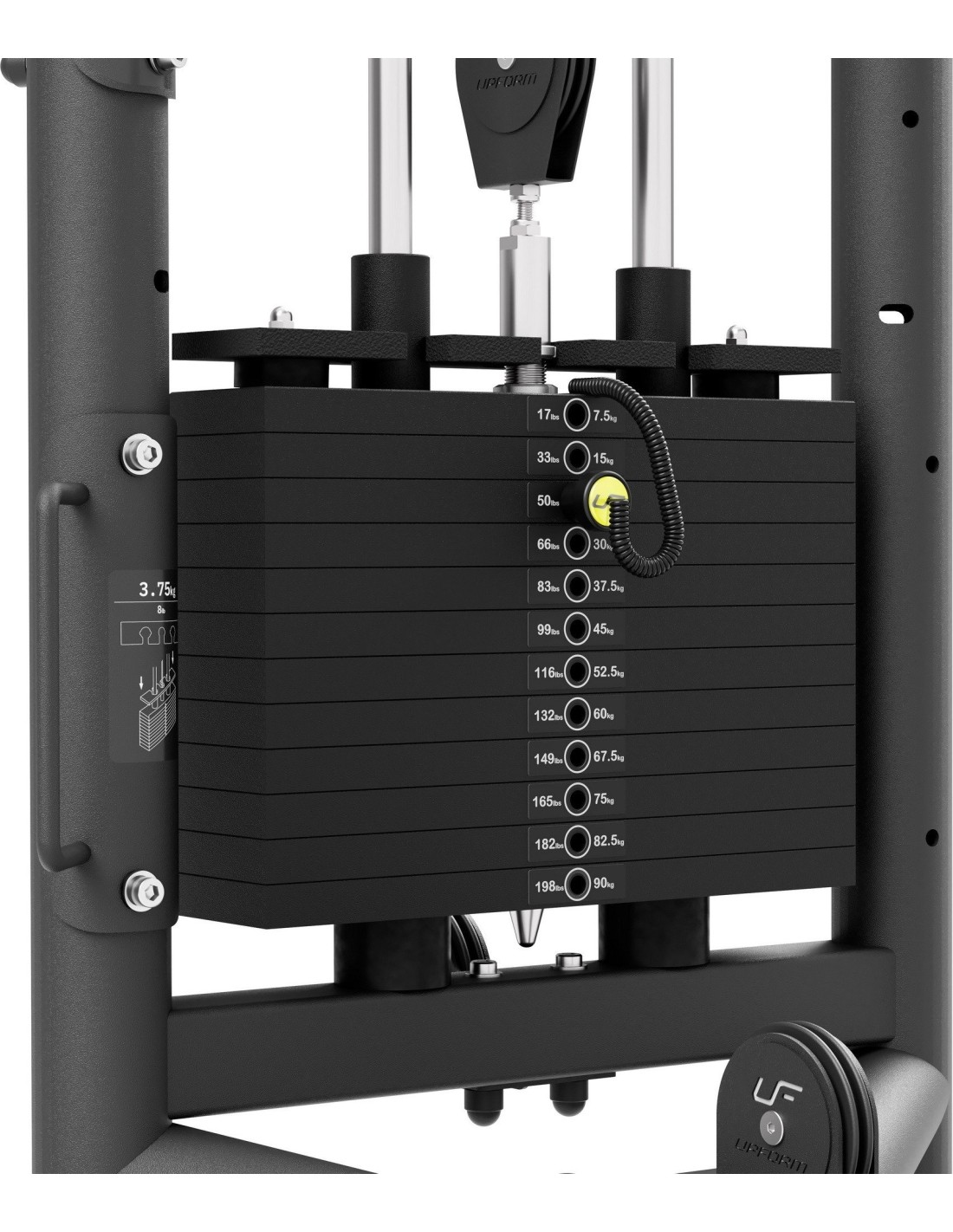 Stacja bramowa z regulacją wysokości UF-001 wchodzi w skład profesjonalnego systemu modułowego UpForm, który umożliwia trening wszystkich partii mięśniowych na każdym poziomie zaawansowania ćwiczącego. Uwaga! Uchwyty widoczne na zdjęciach nie są dołączone do zestawu. Marka UpForm to systemowe rozwiązanie skierowane dla komercyjnych siłowni i klubów fitness. Dzięki modułowej konstrukcji, sprzęt UpForm można skonfigurować według indywidualnych potrzeb oraz możliwości. Stos 90 kg Na stos stacji bramowej składa się 12 sztabek, każda o wadze 7,5 kg. Każda sztabka posiada naklejkę informującą o łącznej wadze w kilogramach oraz funtach. Uchwyt przetyczki do regulacji stosu został wykonany z aluminium, sama przetyczka jest zabezpieczona linką spiralną. Regulacja wysokości rączek Stację bramową UF-001 wyposażyliśmy w system regulacji położenia rączek, co pozwala na wykonanie dużo większej ilości ćwiczeń niż na maszynie o tradycyjnej konstrukcji. Regulacja odbywa się z wykorzystaniem praktycznego bolca sprężynowego. Dzięki niemu zyskujesz nieosiągalny wcześniej komfort i prostotę regulacji. Dla maksymalnej wygody, każdy poziom posiada numeryczne oznaczenie na prowadnicy. Wszystkie kółka ukryliśmy pod metalowymi maskownicami z logo UpForm. Linki w czarnej otulinie zakończone są masywnym zaciskiem na śruby imbusowe oraz amortyzowane poprzez gumowy odbojnik. Sztabka połówkowa 3,75 kg Sztabka połówkowa umożliwia zmniejszenie skoku regulacji obciążenia z 7,5 kg do 3,75 kg. Dzięki temu osiągniesz jeszcze większą precyzję podczas wyboru poziomu intensywności treningu. Sztabka 3,75 kg posiada na ramie urządzenia specjalny uchwyt do jej przechowywania.