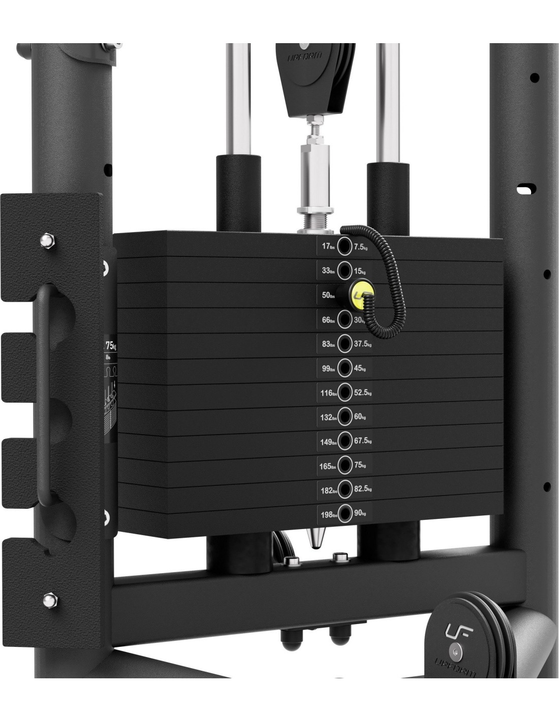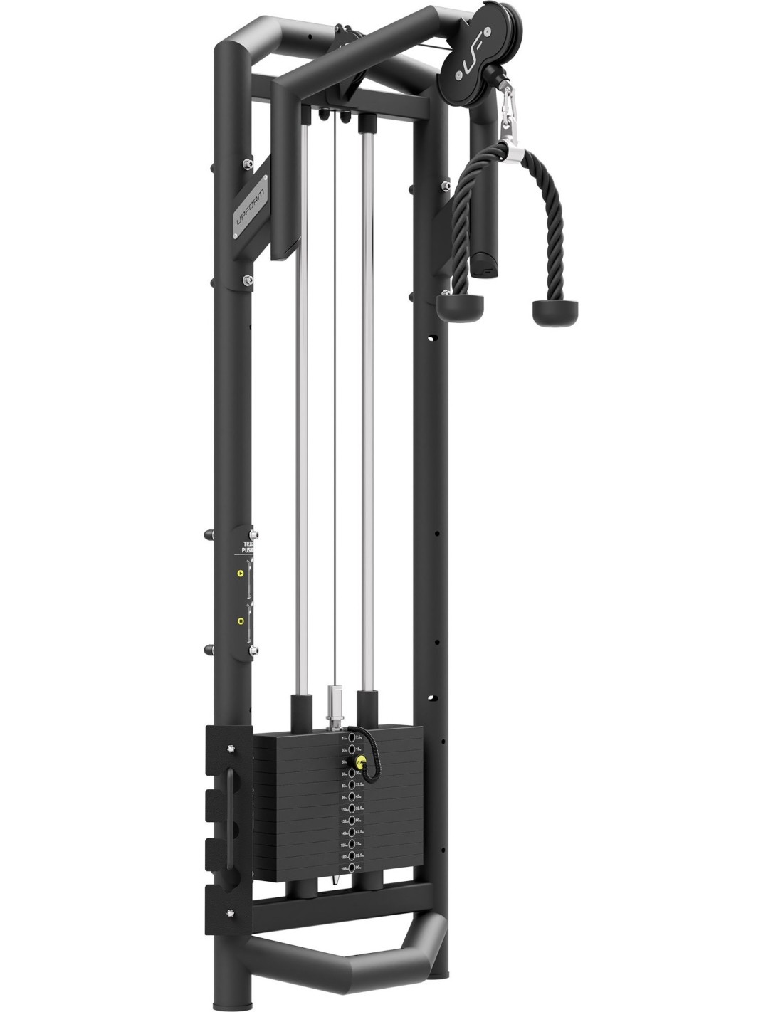 Triceps UF-010 wchodzi w skład profesjonalnego systemu modułowego UpForm, który umożliwia trening wszystkich partii mięśniowych na każdym poziomie zaawansowania ćwiczącego. Uwaga! Uchwyt widoczny na zdjęciach nie jest dołączony do zestawu. Marka UpForm to systemowe rozwiązanie skierowane dla komercyjnych siłowni i klubów fitness. Dzięki modułowej konstrukcji, sprzęt UpForm można skonfigurować według indywidualnych potrzeb oraz możliwości. Stos 90 kg Na stos stacji bramowej składa się 12 sztabek, każda o wadze 7,5 kg. Każda sztabka posiada naklejkę informującą o łącznej wadze w kilogramach oraz funtach. Uchwyt przetyczki do regulacji stosu został wykonany z aluminium, sama przetyczka jest zabezpieczona linką spiralną. Górne ramię Górne ramię maszyny wysunięte jest na wysokość 210 cm. Dzięki temu na przyrządzie będą mogły ćwiczyć także osoby o wzroście ponad 200 cm. Wszystkie kółka ukryliśmy pod metalowymi maskownicami z logo UpForm. Linki w czarnej otulinie zakończone są masywnym zaciskiem na śruby imbusowe oraz amortyzowane poprzez gumowy odbojnik. Sztabka połówkowa 3,75 kg Sztabka połówkowa umożliwia zmniejszenie skoku regulacji obciążenia z 7,5 kg do 3,75 kg. Dzięki temu osiągniesz jeszcze większą precyzję podczas wyboru poziomu intensywności treningu. Sztabka 3,75 kg posiada na ramie urządzenia specjalny uchwyt do jej przechowywania.