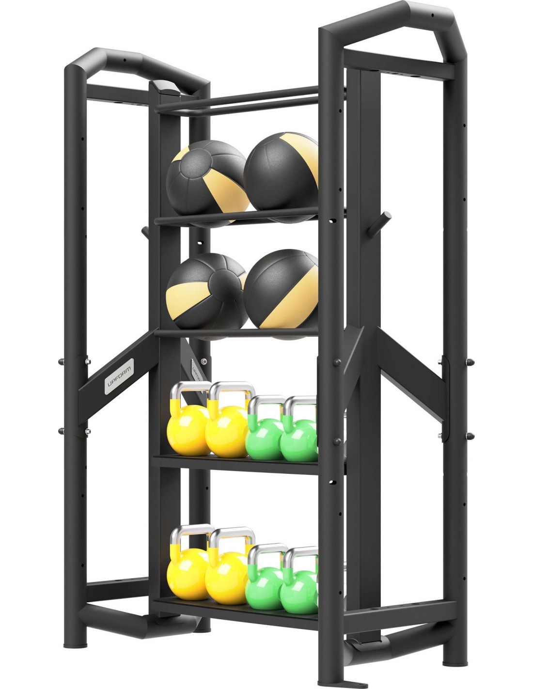 Magazyn łączący UF-012 wchodzi w skład profesjonalnego systemu modułowego UpForm, który umożliwia trening wszystkich partii mięśniowych na każdym poziomie zaawansowania ćwiczącego. Uwaga! Hantle i piłki widoczne na zdjęciach nie są dołączone do zestawu. Marka UpForm to systemowe rozwiązanie skierowane dla komercyjnych siłowni i klubów fitness. Dzięki modułowej konstrukcji, sprzęt UpForm można skonfigurować według indywidualnych potrzeb oraz możliwości. Półki na hantle i piłki Stacja posiada cztery półki na akcesoria, po dwie na piłki i hantle kettlebell.