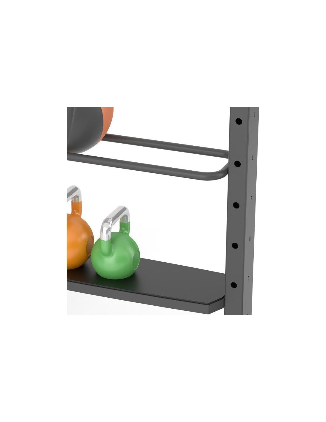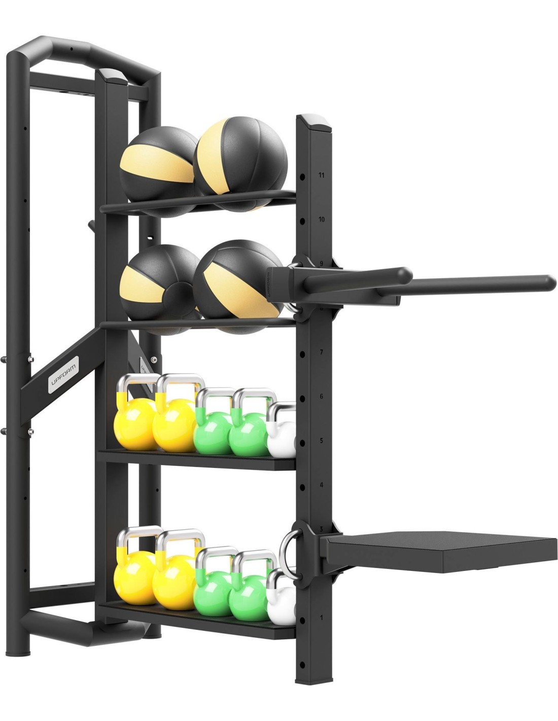 Magazyn na akcesoria z dipem i podestem UF-011 wchodzi w skład profesjonalnego systemu modułowego UpForm, który umożliwia trening wszystkich partii mięśniowych na każdym poziomie zaawansowania ćwiczącego. Uwaga! Hantle i piłki widoczne na zdjęciach nie są dołączone do zestawu. Marka UpForm to systemowe rozwiązanie skierowane dla komercyjnych siłowni i klubów fitness. Dzięki modułowej konstrukcji, sprzęt UpForm można skonfigurować według indywidualnych potrzeb oraz możliwości. Regulowany uchwyt dip z platformą Stacja posiada regulowany w 11 pozycjach uchwyt do dipów wraz z platformą do podskoków. Każdy poziom regulacji oznaczony jest jego numeryczną wartością. Półki na hantle i piłki Stacja posiada cztery półki na akcesoria, po dwie na piłki i hantle kettlebell.