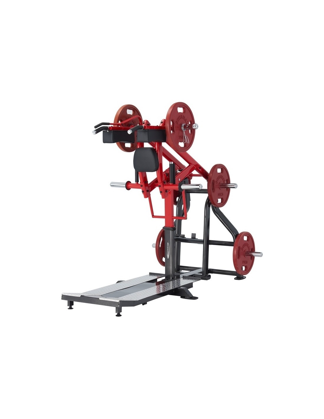 Standing Squat Machine Steelflex Plateload Line PLSS jest profesjonalną maszyną do wzmacniania mięśni nóg. Maszyna ta celuje w quady, hamstringi, gluty i mięśnie łydek. Oprócz przysiadów, można również wykonywać wznosy łydek i wypady. 4 olimpijskie talerze pozwalają na dostosowanie oporu do własnych upodobań. Wytrzymała, stabilna konstrukcja pokryta jest elektrostatyczną farbą proszkową, która chroni ją przed zarysowaniami. Oparcie i podłokietniki są mocno wyściełane dla maksymalnego komfortu, a antypoślizgowe nogi zapewniają stabilność podczas treningu. Ta maszyna do ćwiczeń posiada również osłony na śruby, w pełni uszczelnione, wysokiej jakości łożyska i słupki na talerze olimpijskie. Maszyna do przysiadów stojących Steelflex Plateload Line PLSS jest odpowiednia zarówno do użytku komercyjnego, jak i niekomercyjnego.