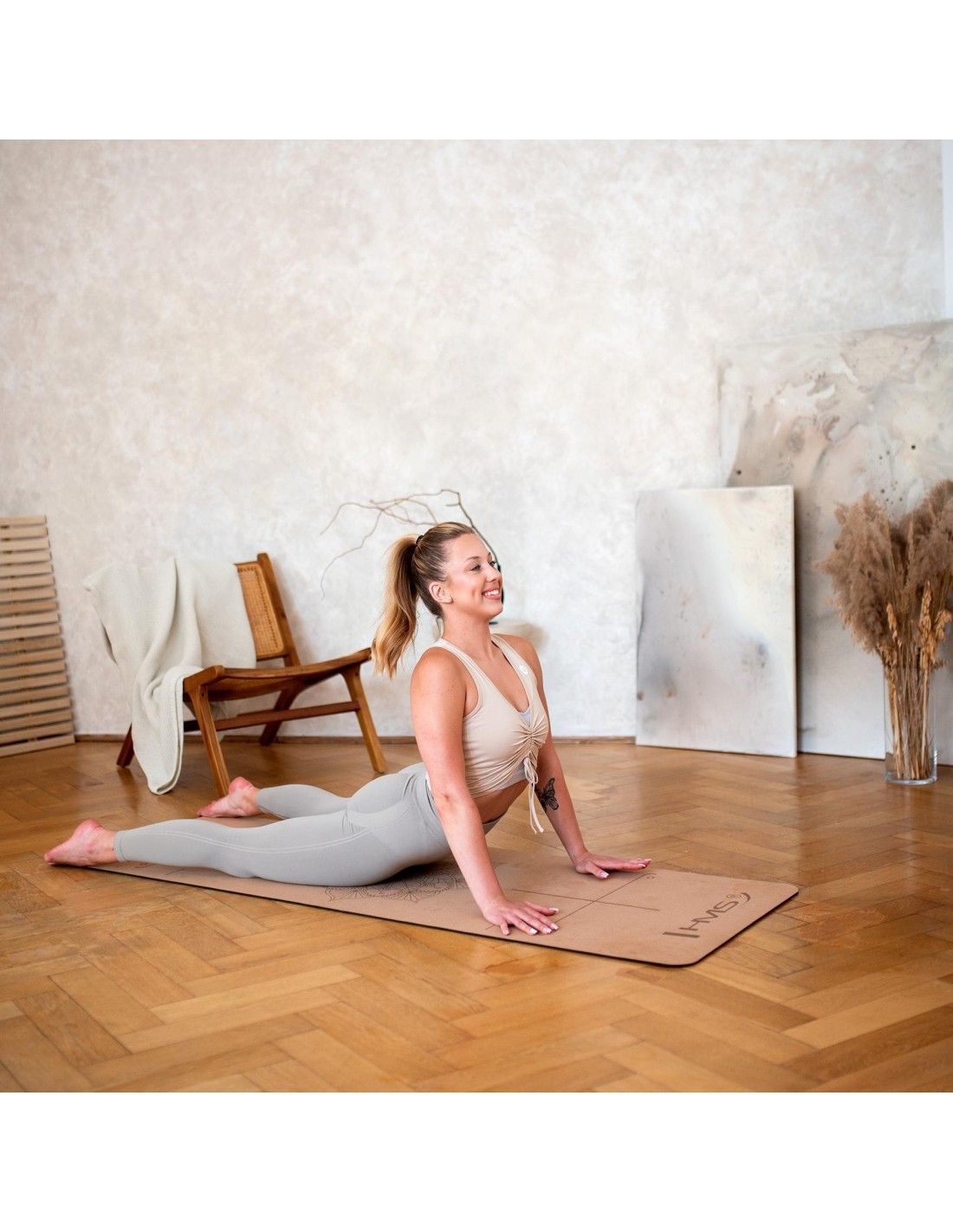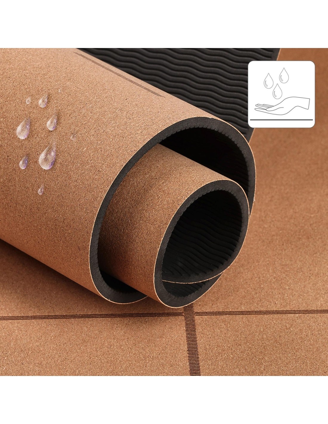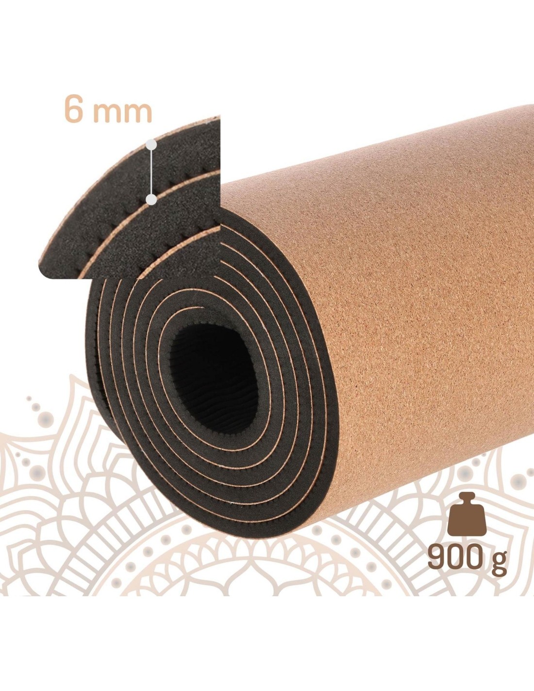 The mat is made from a combination of TPE material and cork for reliability, durability and natural antibacterial properties. TPE, a thermoplastic elastomer, offers excellent grip, making the mat non-slip and safe to use. Thanks to its elasticity and shape memory properties, the mat always returns to its original form, even after intensive use. Cork, being a natural material, is skin-friendly, hypoallergenic and environmentally friendly. In addition, the mat is waterproof, making it easy to care for and clean. These properties make the mat ideal for both indoor and outdoor exercise.