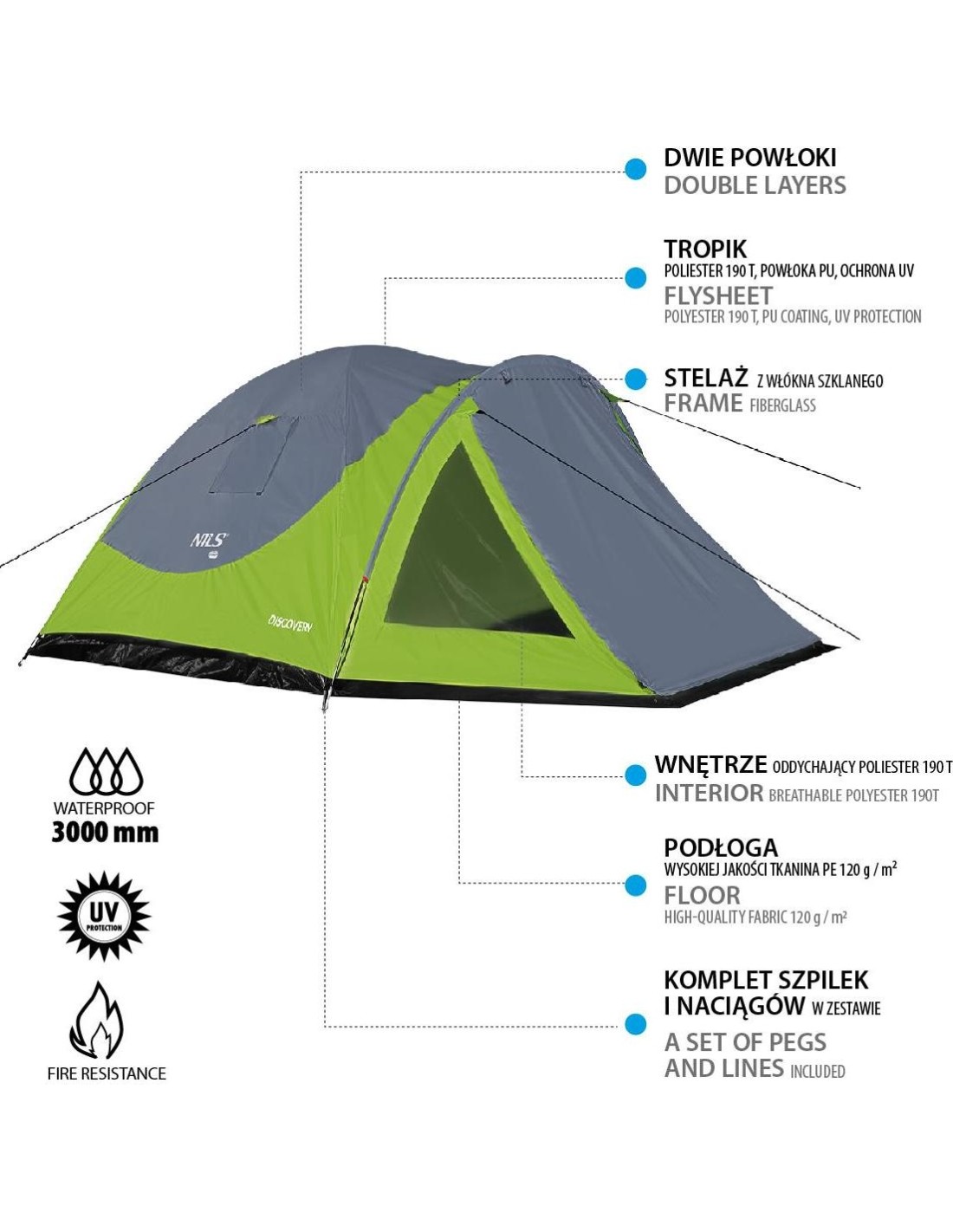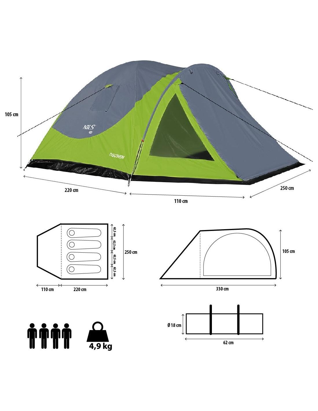 The Nils Camp NC6006 Discovery hiking tent is perfect for anyone who loves a few days of mountain survival or a weekend trip to the lake. The Discovery is a double skin tent that offers a suspended bedroom and a vestibule with a floor where you can store your boots, backpacks or other gear. The tent can accommodate four people, guaranteeing enough space and comfort while sleeping. High quality of finishing: High comfort of rest in difficult weather conditions is provided by a waterproof flysheet and a floor (waterproof 3000mm H2O). The bedroom walls, on the other hand, are made of a breathable fabric to prevent condensation while you sleep. Taped seams provide additional protection from the wet weather. Stable structure and easy pitching: The tent is based on three fiberglass frames integrated with the flysheet. Tunnels are properly labeled so it is easy to match the right frame to the tunnel. Thanks to special holders inside the flysheet a bedroom can be suspended inside the tent. The entire tent is secured by pegs, together with the cords that fasten the flysheet. Comfort of use: Discovery tent, apart from suspended bedroom, offers a vestibule with a floor so one can freely store camping equipment or backpacks and shoes inside the tent. The bedroom has two ventilation windows in the walls and an entrance can be closed with a mosquito net. All these solutions keep the ventilation and the air circulation at the high level, which guarantees a long and comfortable sleep. In addition, the tent is equipped with two internal pockets to store handy things and a holder under the ceiling in order to hang a lamp. Specification: Material: double-layered Flysheet 190T polyester, PU coating waterproof 3000mm Frame: Glass fiber 2x O8,5mm / 1x O7,9mm Floor: PE-120G/M2, waterproof 3000mm no. of persons 4 Dimensions: Length: 110 cm + 220 cm Width: 250 cm Height: 105cm Dimensions when folded: Diameter: 18 cm Length: 62 cm Weight: 4.9 kg Flame resistance: yes UV resistance: yes Taped seams: yes Mosquito net in the bedroom: yes Ventilation net: yes Inner pockets: yes 2x Light holder: yes Remarks: Not for commercial use 24 months warranty
