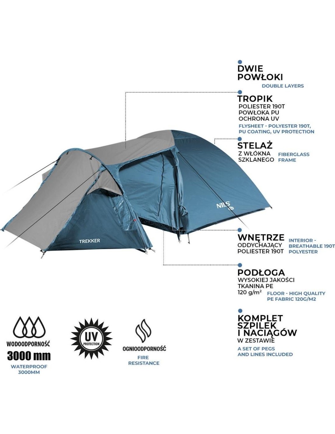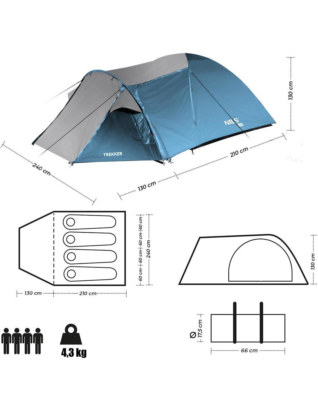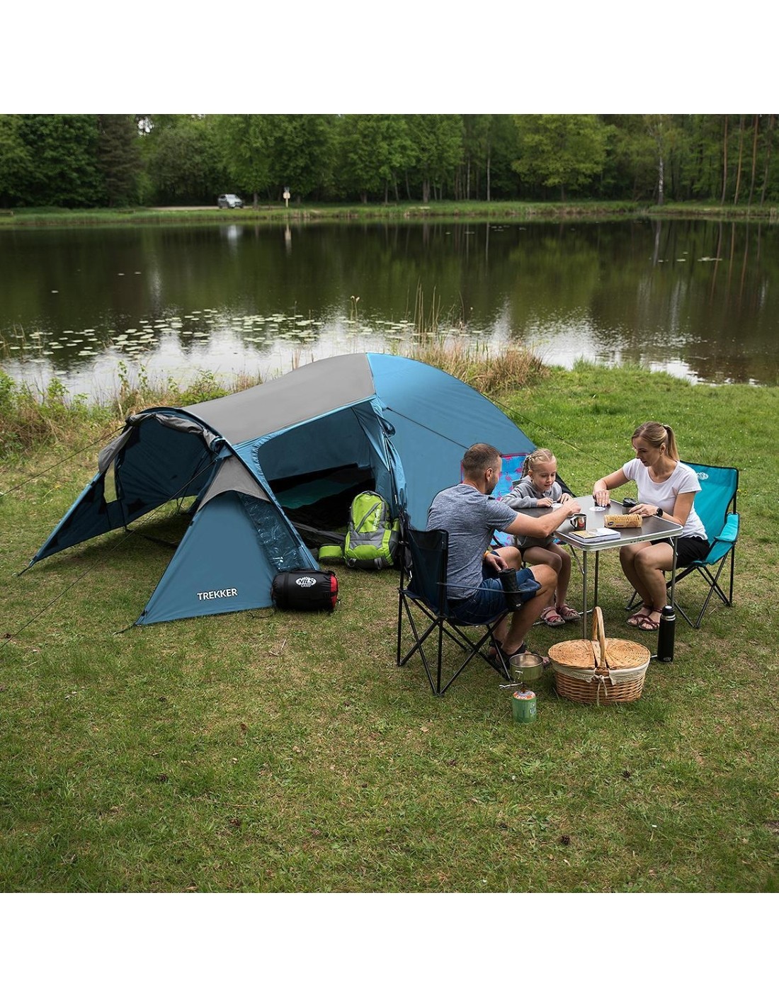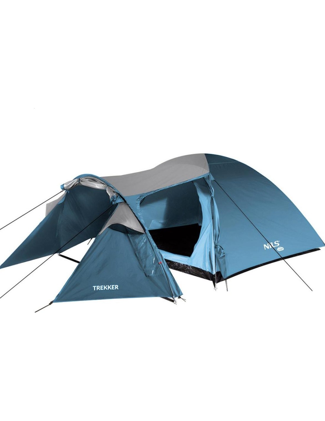 The Nils Camp NC6012 Trekker tent is a great solution for enthusiasts of weekend trips to the mountains or to the lake. Trekker is a double skin tent that offers a suspended bedroom and a large vestibule for rainy evenings or storing camping gear. The tent can accommodate four people, guaranteeing enough space and comfort while sleeping.